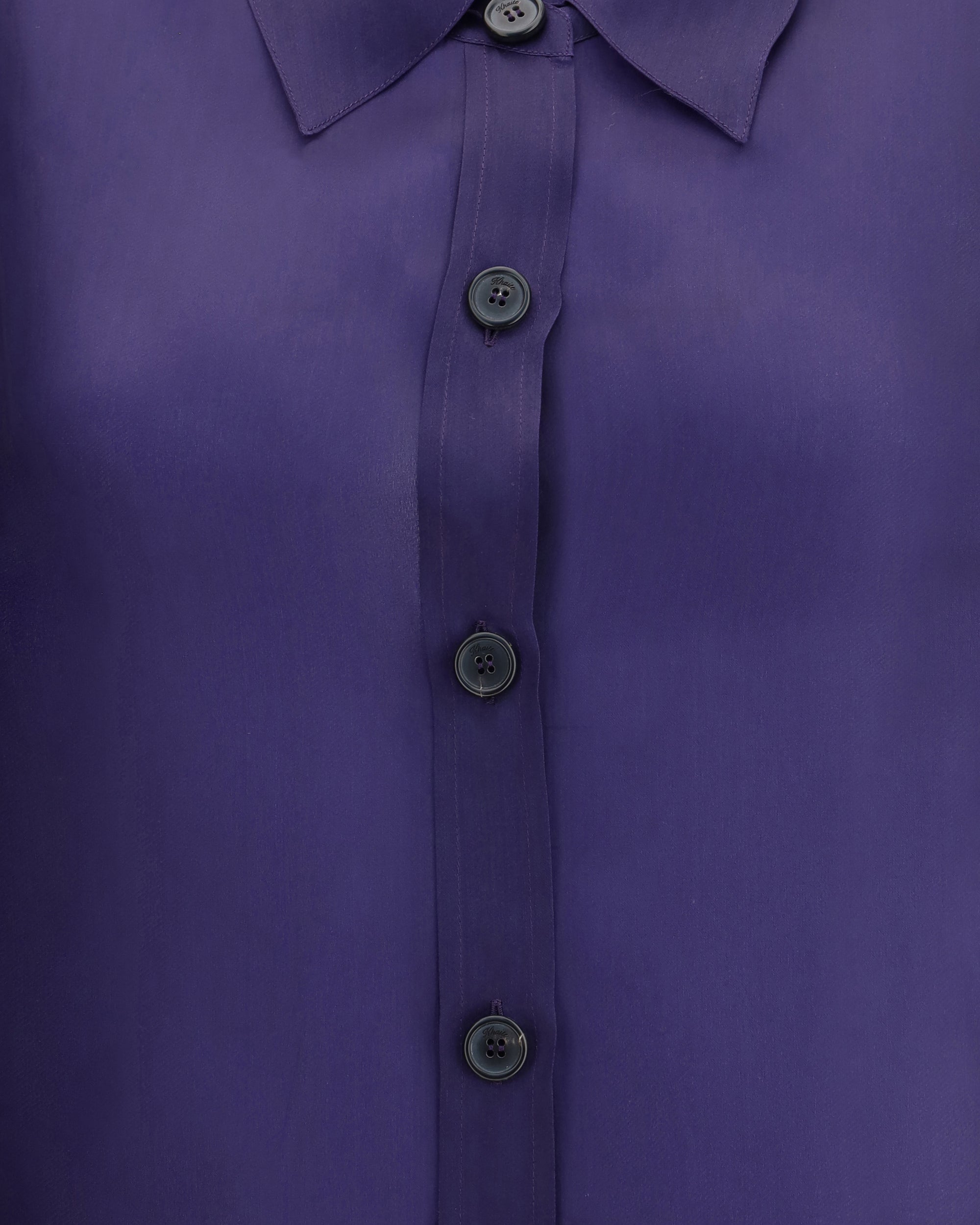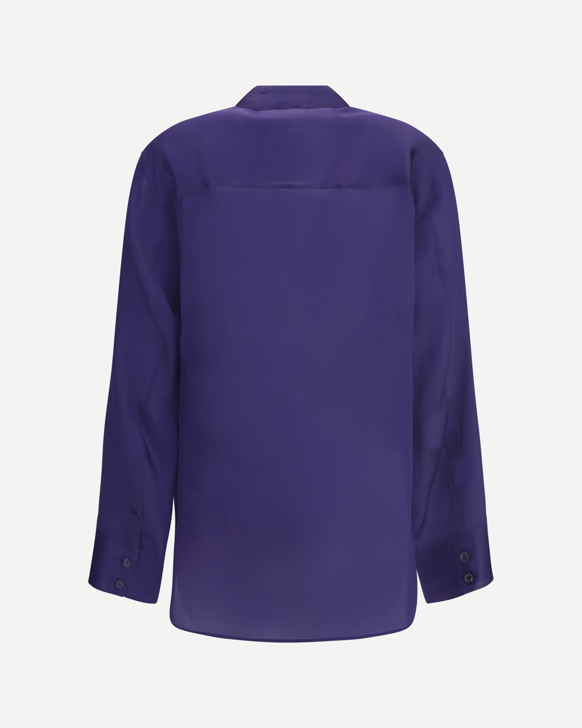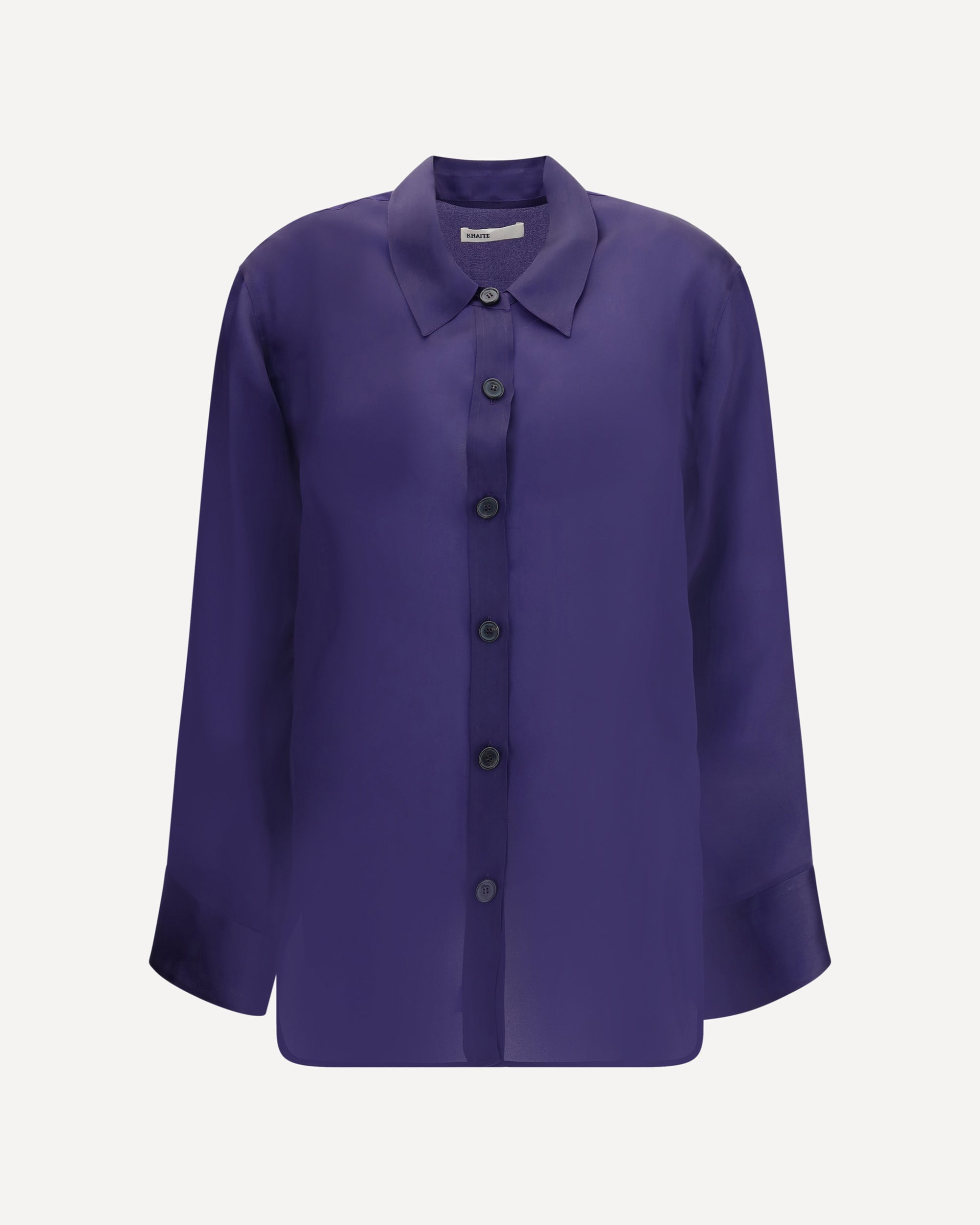 The Herschel Shirt by Khaite is a sleek and sophisticated piece designed for a modern, flowing look. Featuring a front button closure and classic collar, it has an asymmetrical hem and two side slits that enhance the design. The semi-transparent fabric lends lightness and a touch of sensuality, making this shirt a versatile and refined piece.