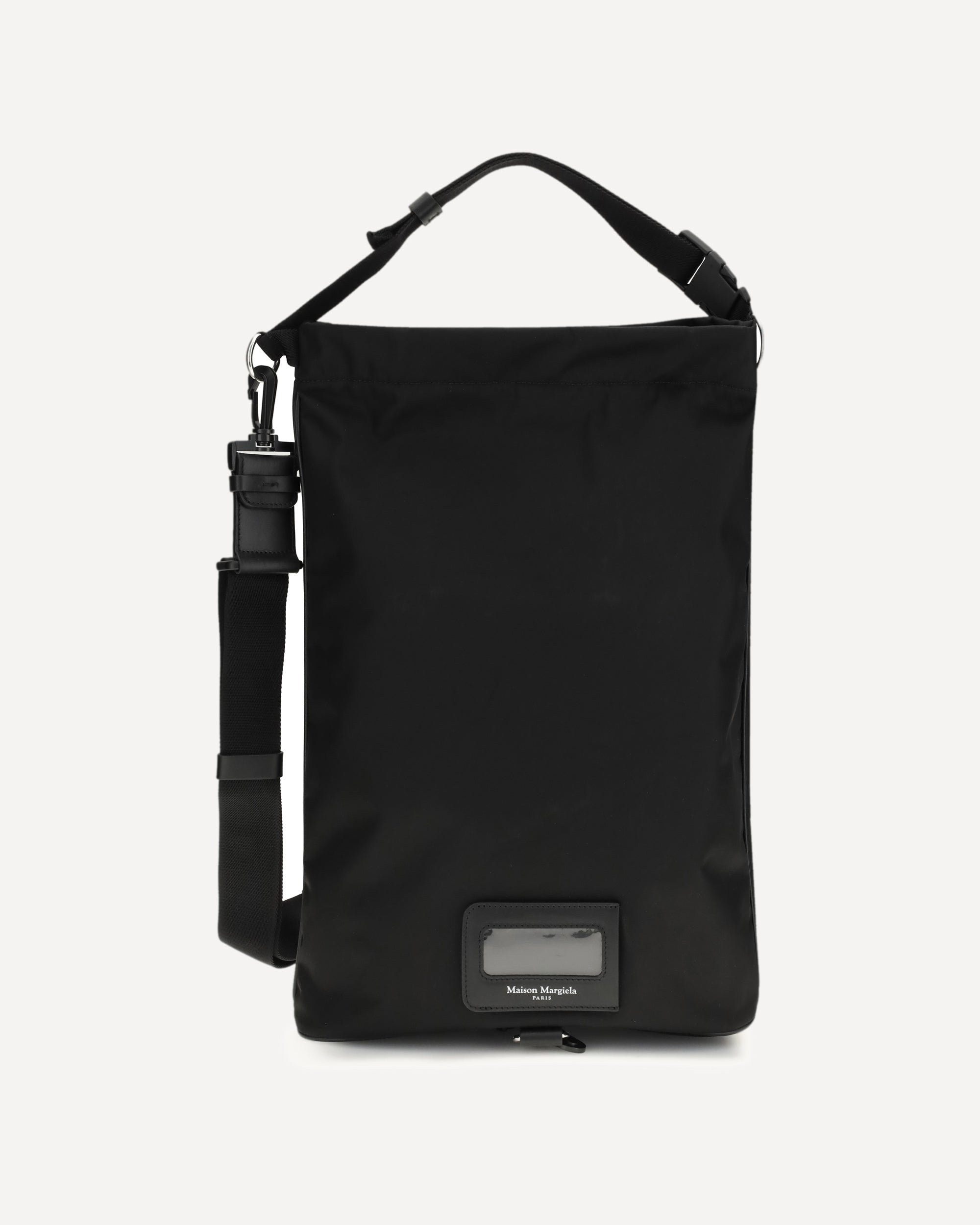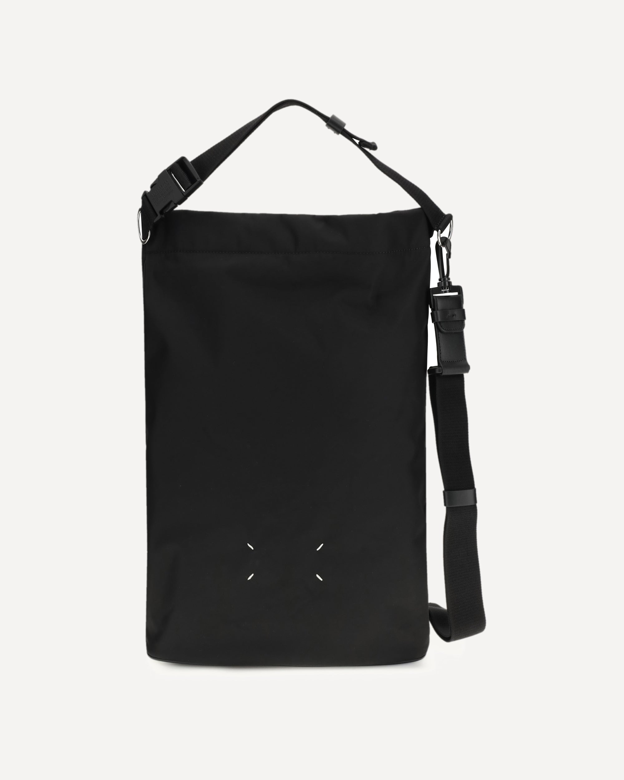 The Roll Up technical Backpack by Margiela is made of textured technical fabric, enhanced by leather trim and a practical buckle closure that accompanies the roll-top. Its cylindrical shape ensures ample interior space and maximum security, reinforced by the adjustable shoulder strap and internal drawstring. A tone-on-tone logo plaque stands out at the base, while on the back the famous four stitches immediately reveal its belonging to the Maison. A functional and iconic accessory designed to accompany every movement with style.