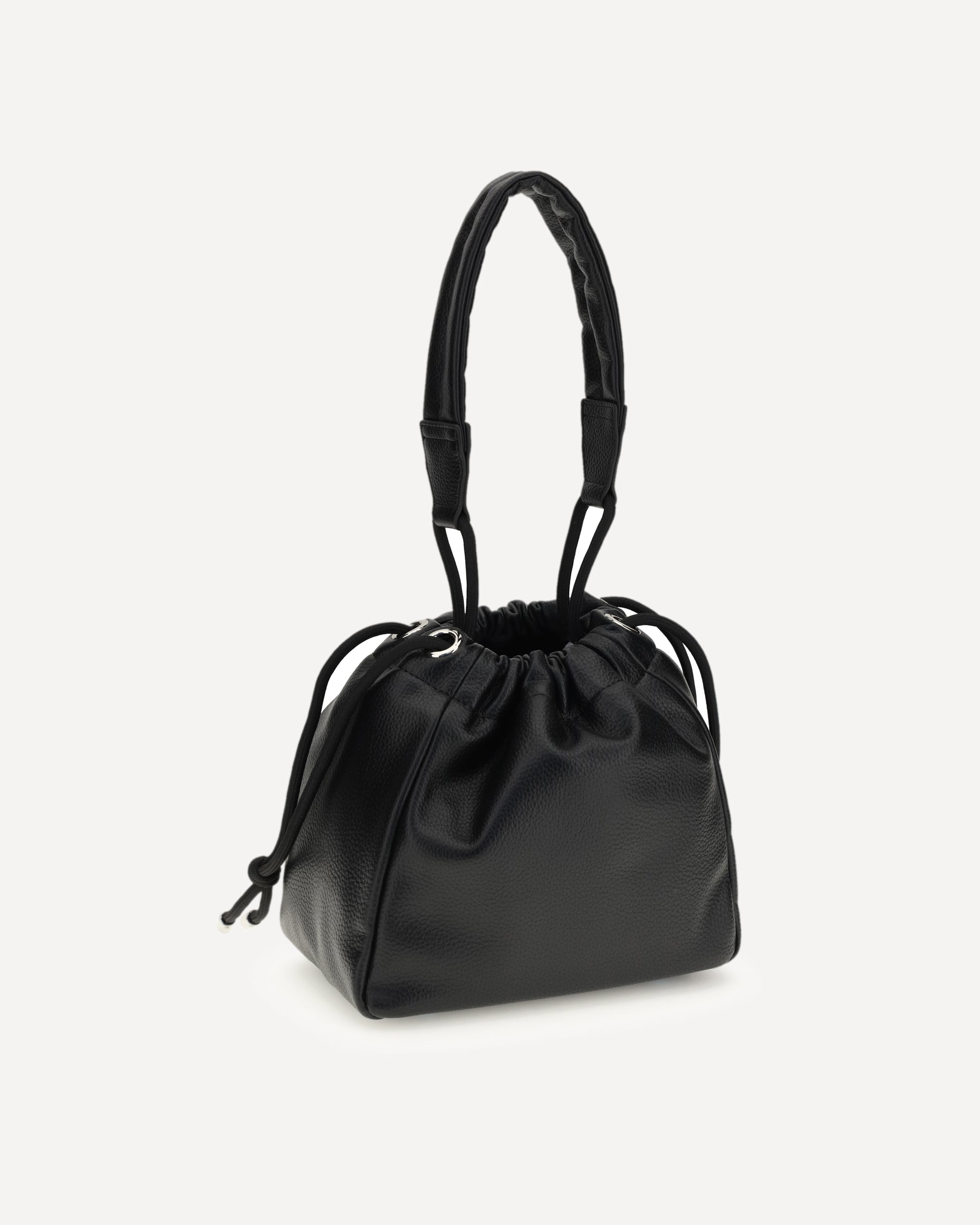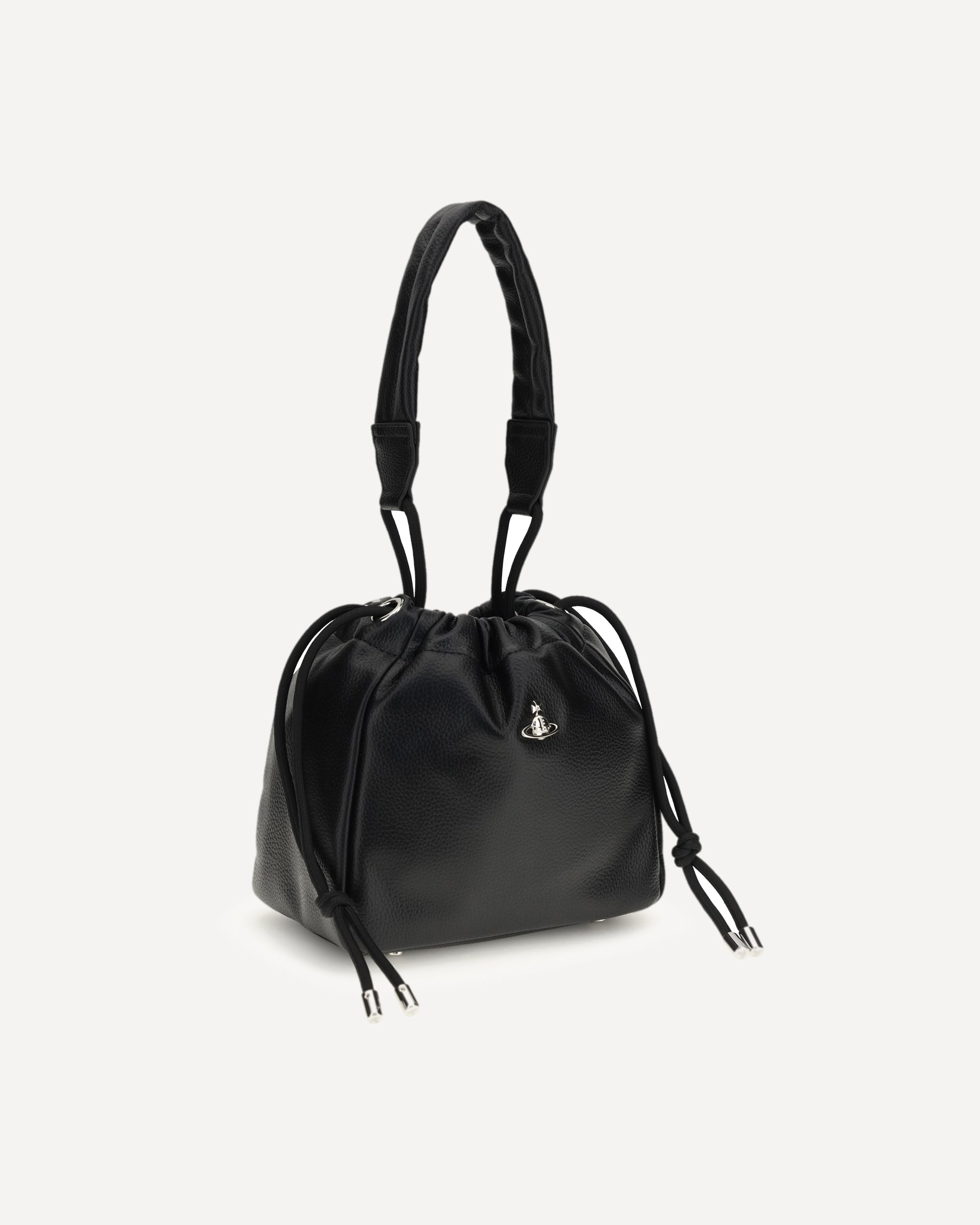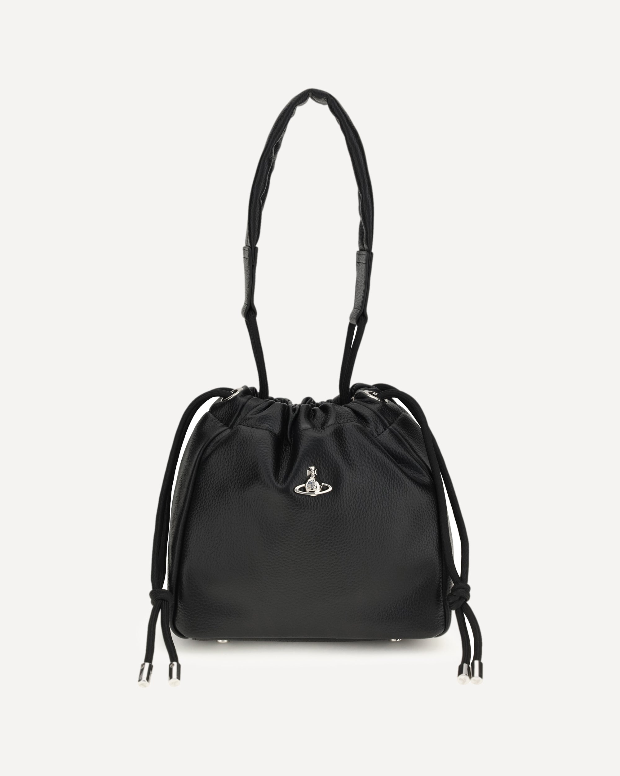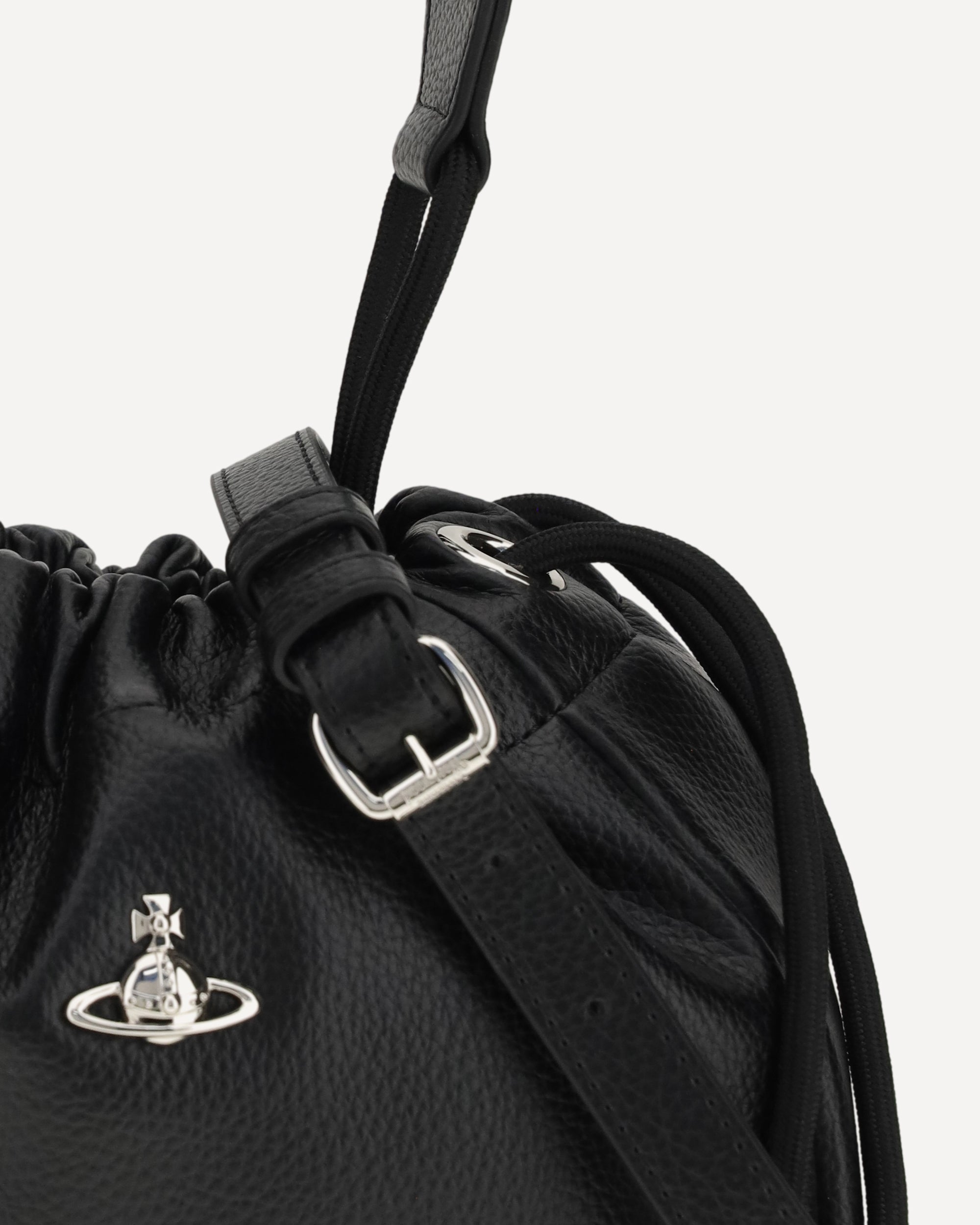 The Hilary Bucket Bag by Vivienne Westwood, crafted from grained synthetic leather, combines functionality and style in a distinctive design. The metal Orb logo embellishes the front, while the drawstring closure ensures practicality. Featuring a flat handle and removable, adjustable shoulder strap, the fabric-lined interior with logo offers organization and sophistication for all your essentials.