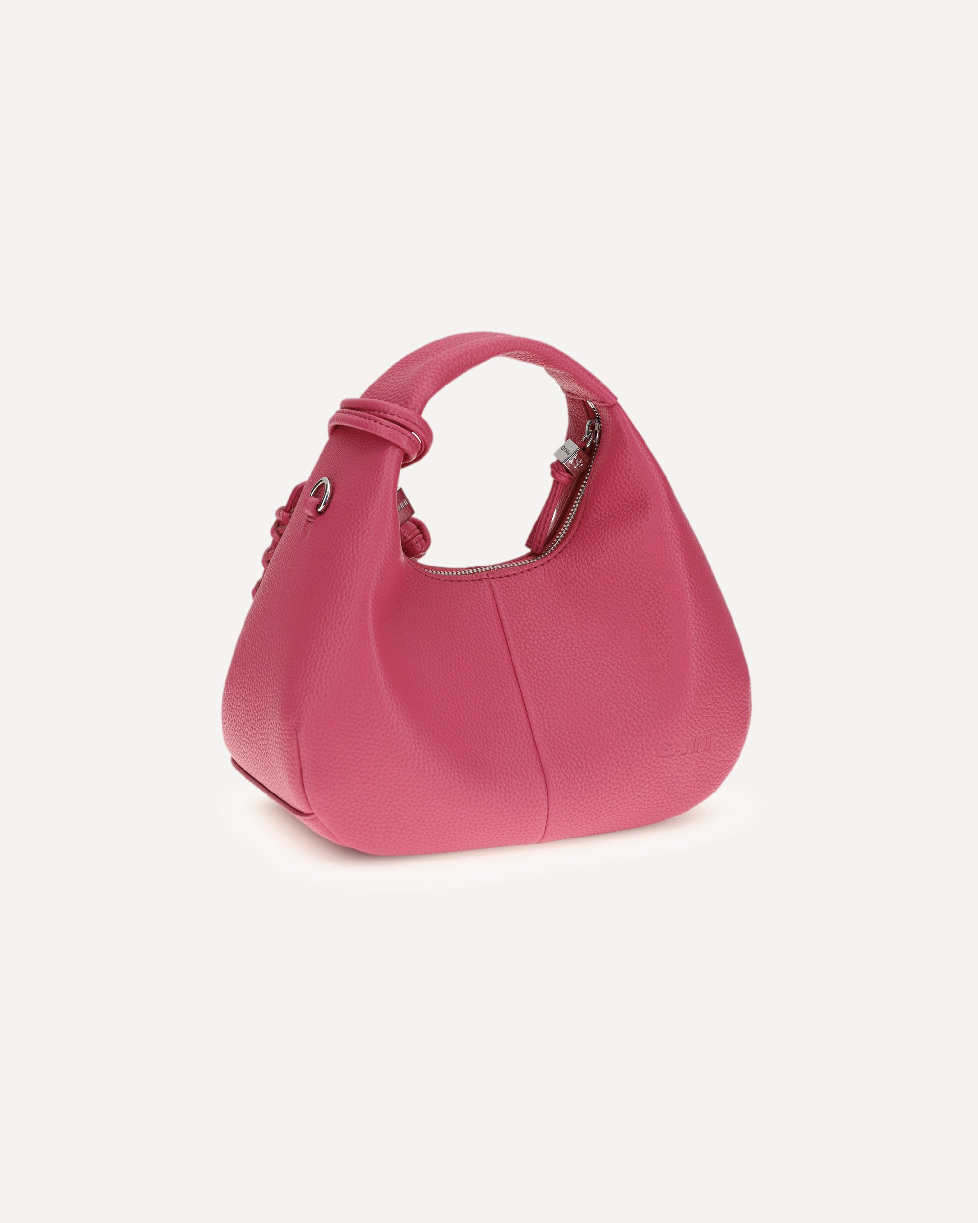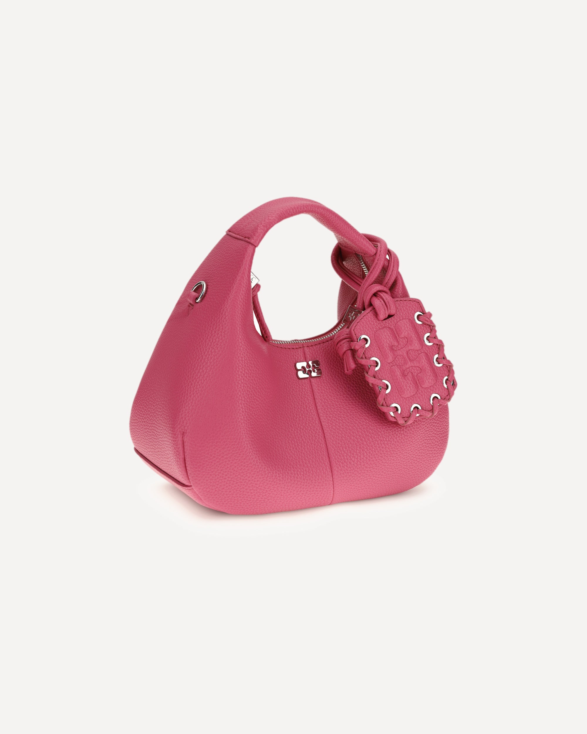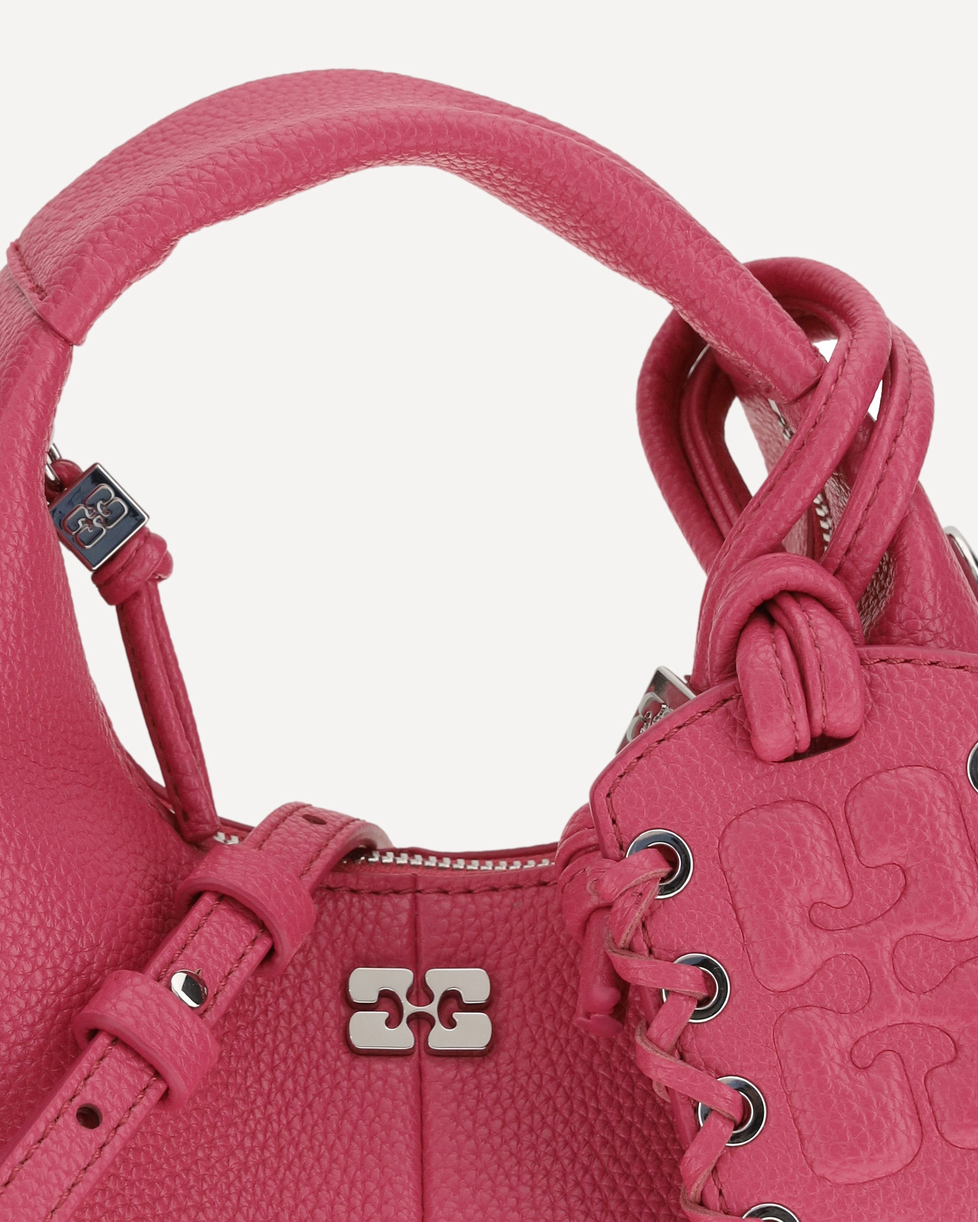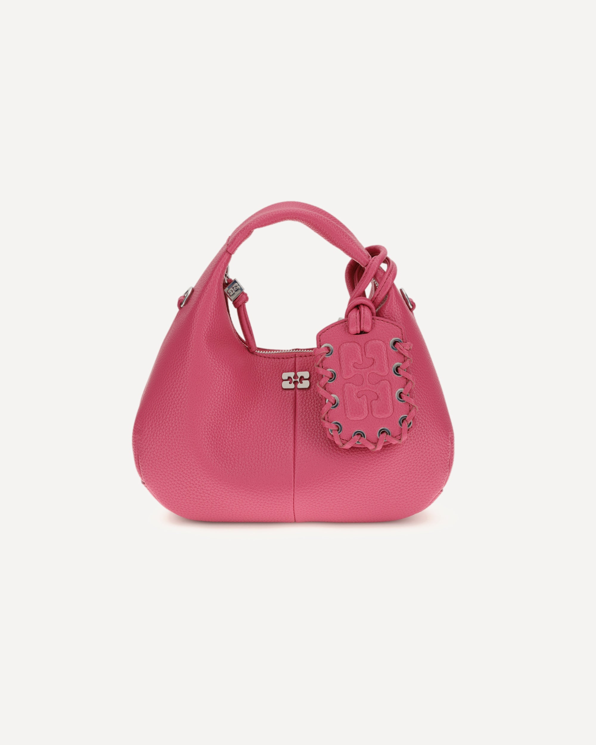 The mini Hobo Handbag by Ganni, with its grainy texture, combines elegance and practicality in a compact format. Featuring a top handle and adjustable and removable shoulder strap, it is embellished with the butterfly logo and the GANNI logo embossed on the back. The zipper closure, metal studs engraved with the Ganni and Butterfly logos, and mirrored label complete the design, while the interior offers a compartment and a flat pocket for cards, perfect for organizing your essentials in style.