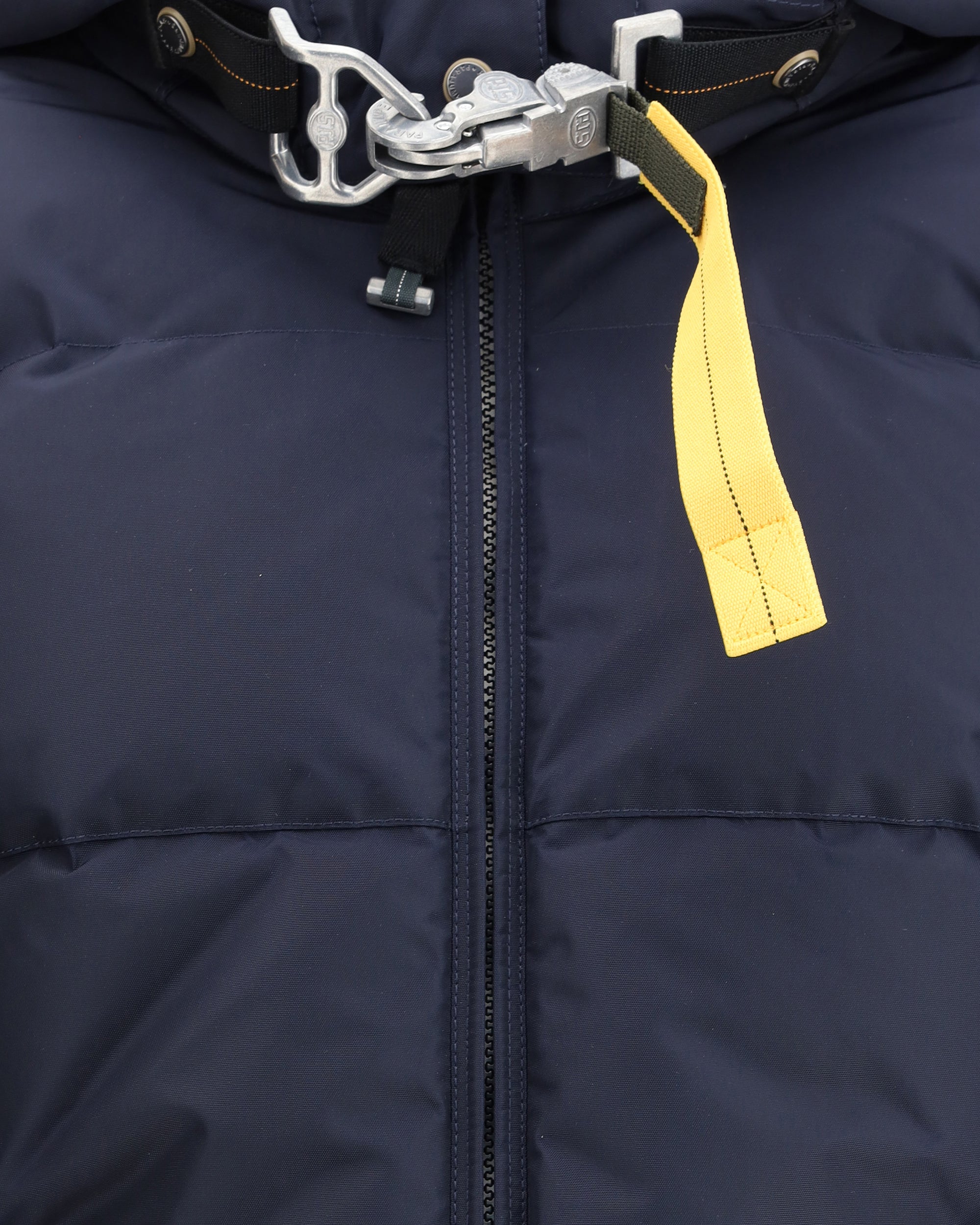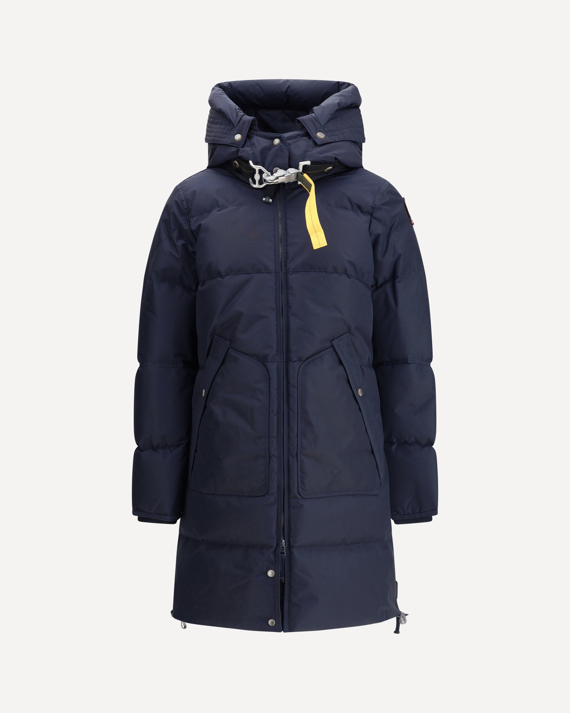 The Long Bear Down Jacket from Parajumpers is a classic and timeless addition to the collection, featuring an adjustable drawstring hood and down filling for warmth and comfort. Made of recycled and laminated nylon oxford, it combines sustainability and durability. A double-slider front zipper closure provides convenience, while two button pockets offer functionality. Elastic rib cuffs and zippered side vents add technical and stylish details. Completing the design are the Parajumpers patch on the sleeve and the iconic removable yellow tape hook at the collar closure, the brand's signature symbol.
