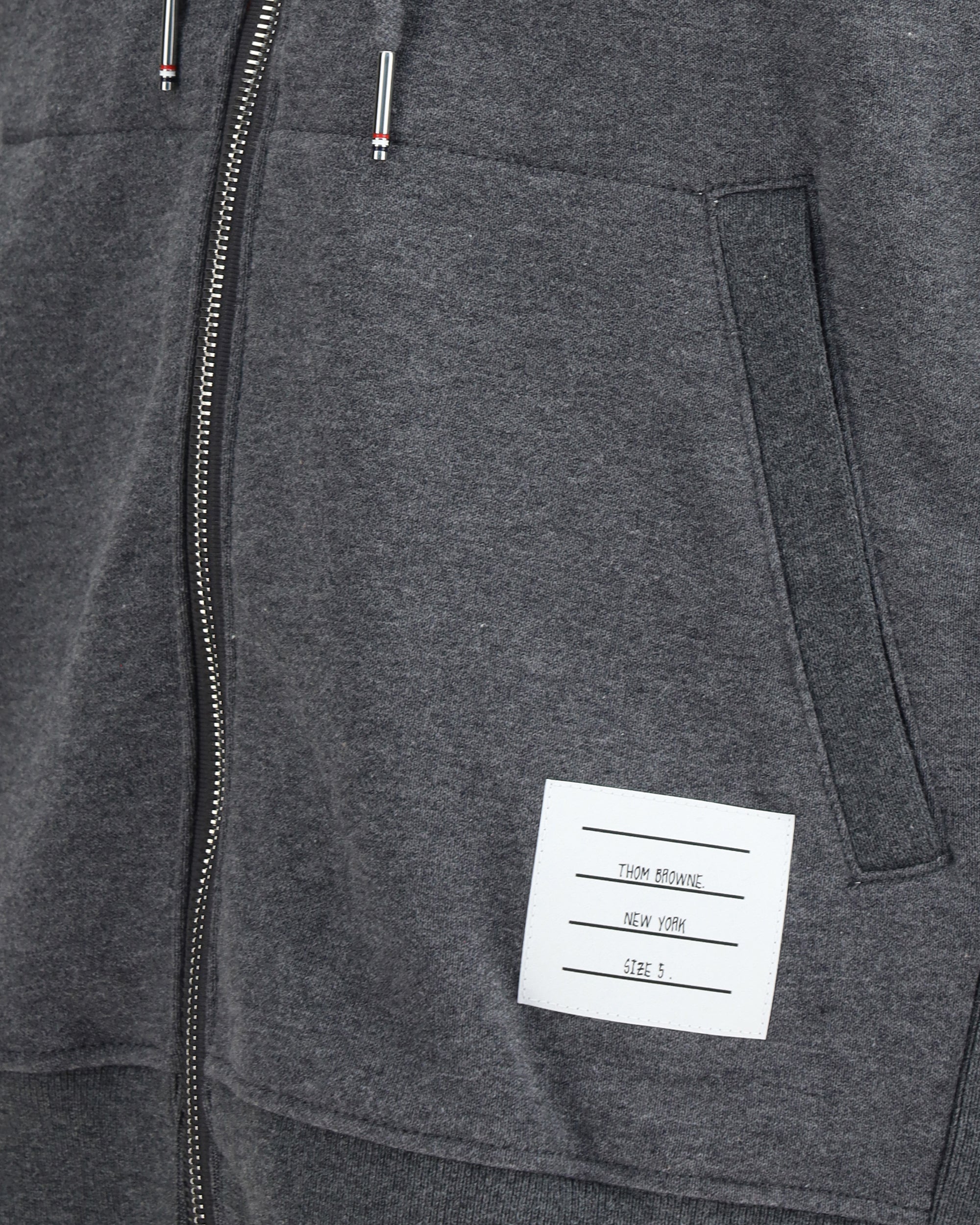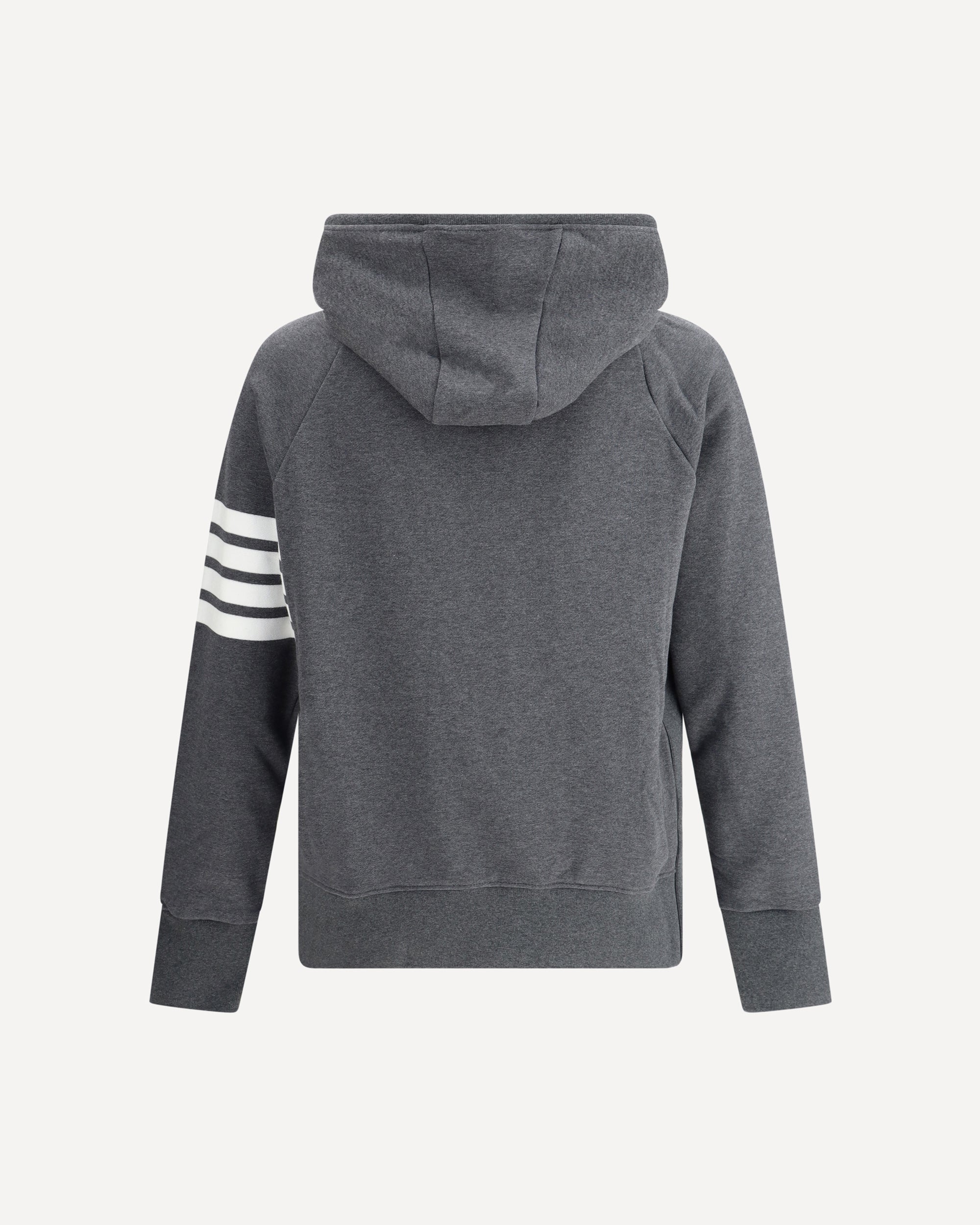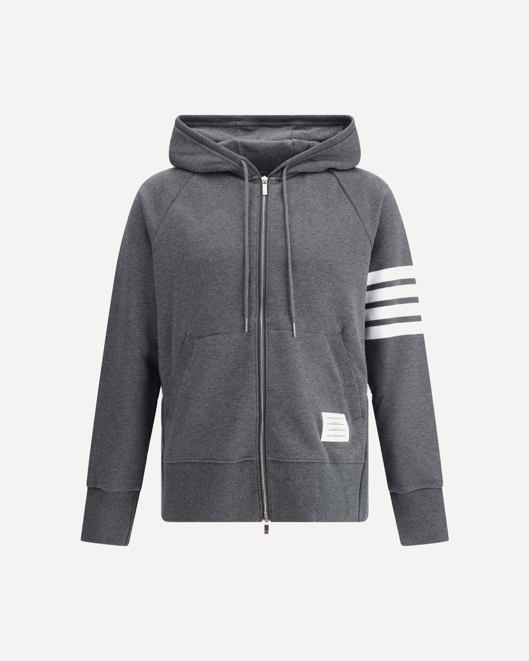 Thom Browne's Cotton Hoodie features a front zipper closure and an adjustable drawstring hood for a customizable fit. Featuring two welt pockets on the front, it is enhanced by the iconic white bands on the left sleeve and the brand's logo patch on the front. The ribbed hem and cuffs complete the design, making this sweatshirt a versatile and distinctive garment, perfect for a casual and refined look.