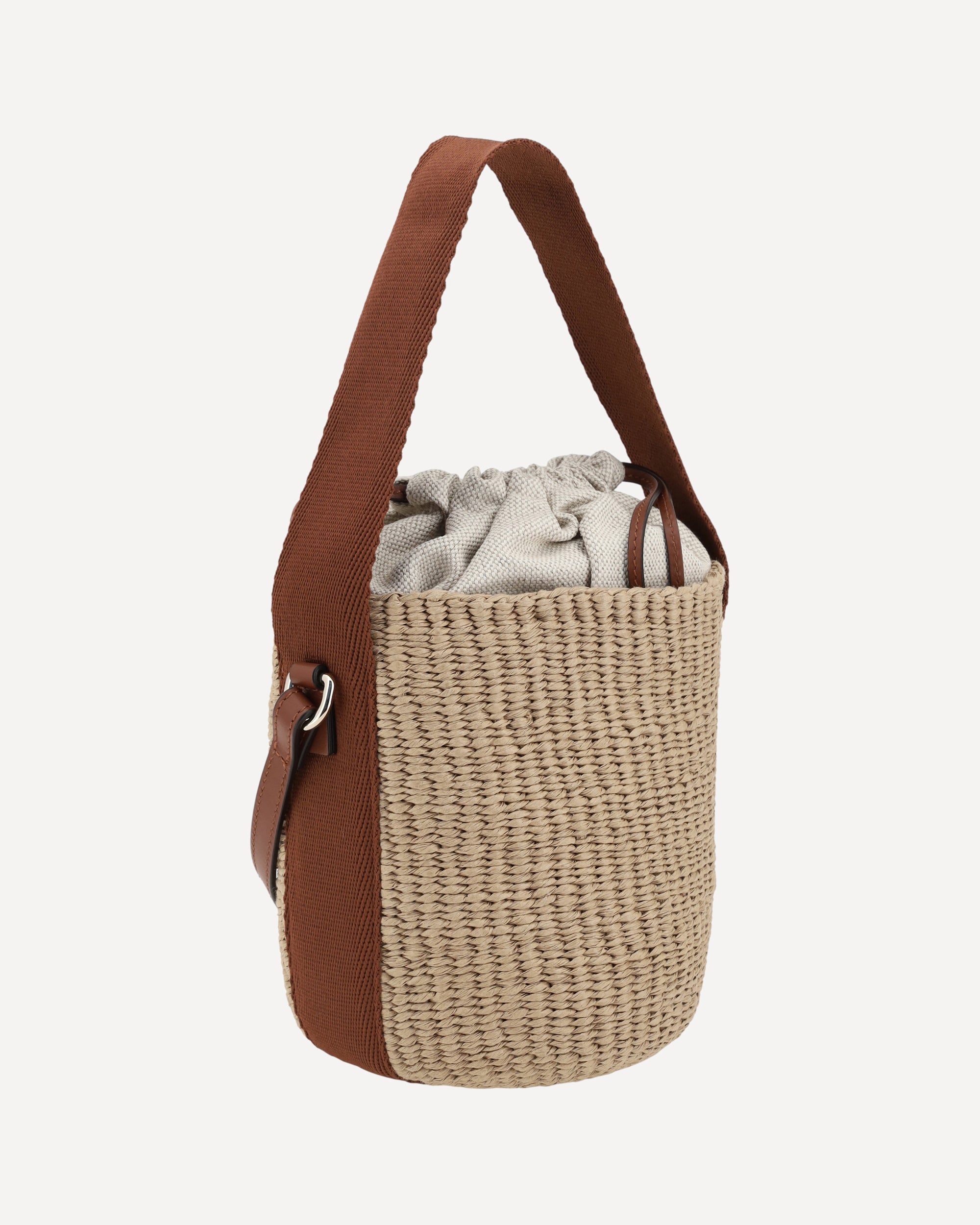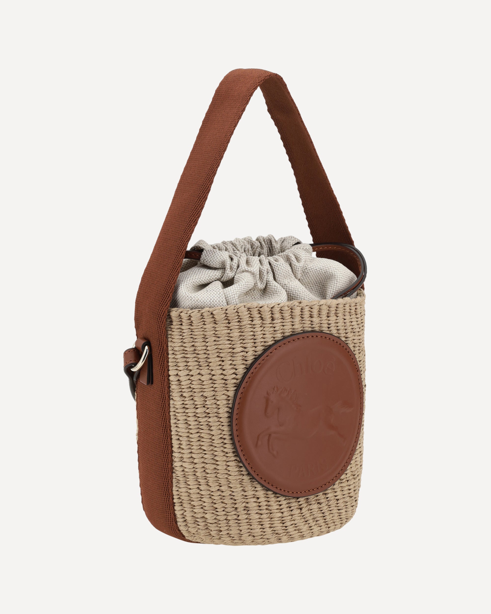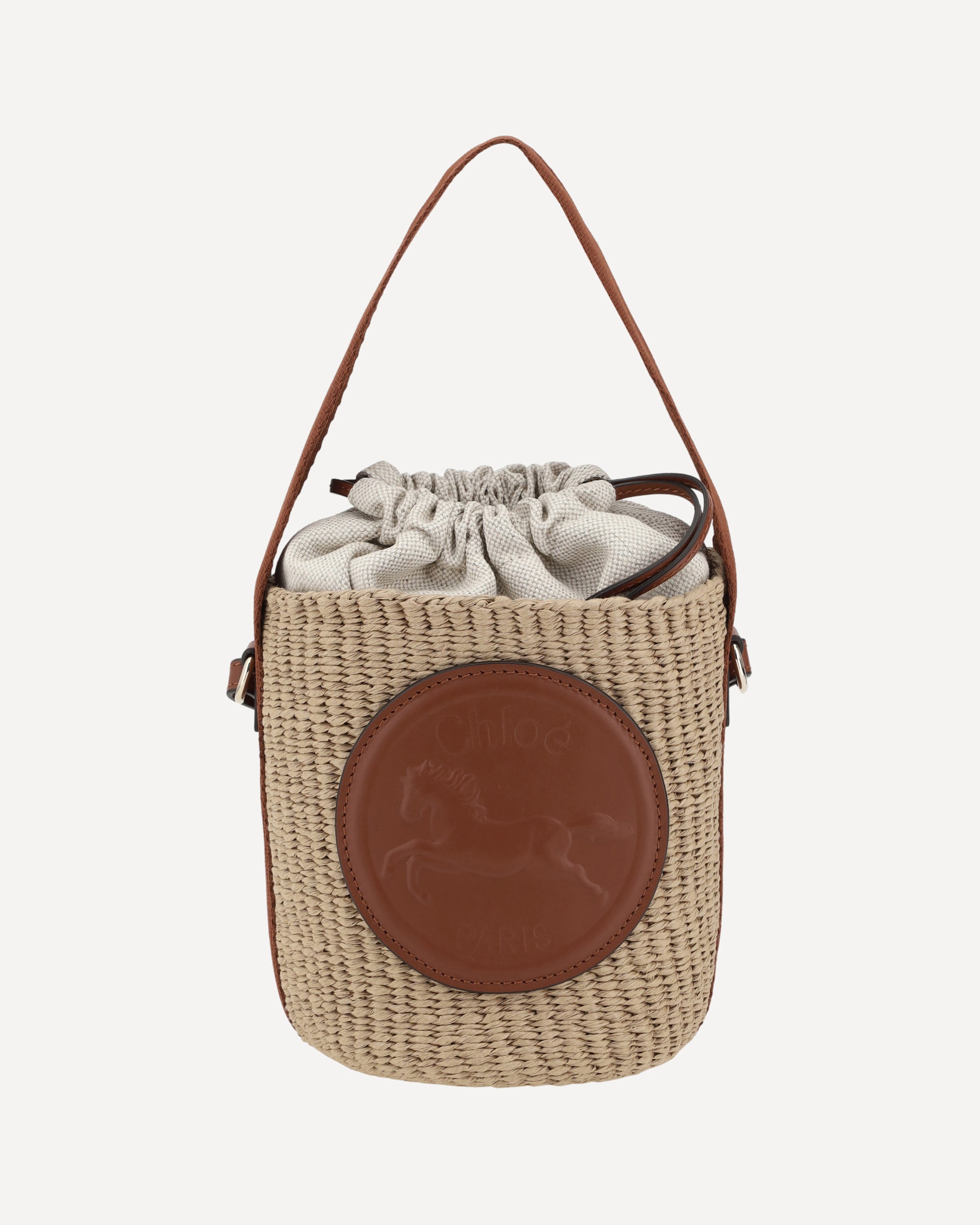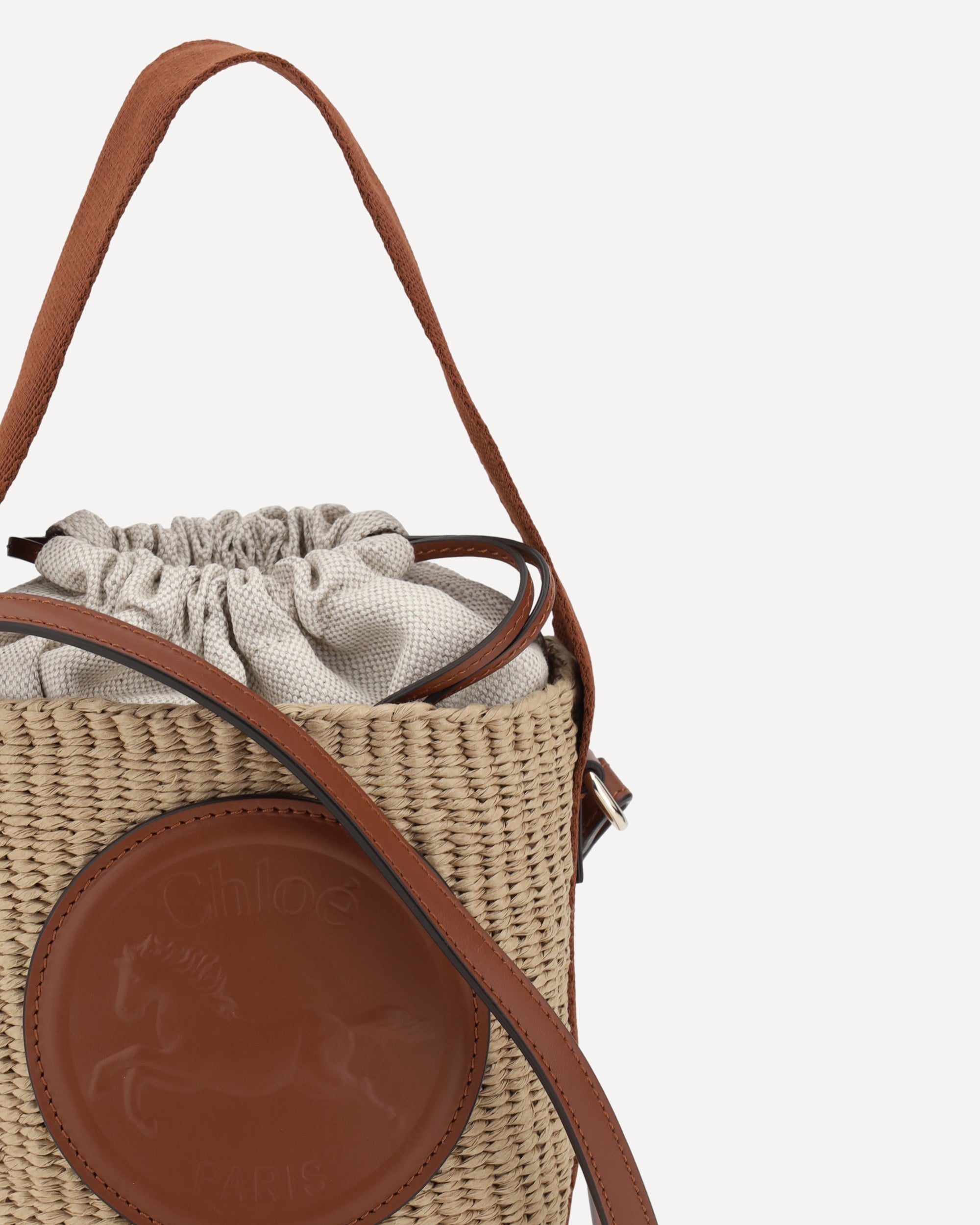 The Chloé Horse Medal Bucket Bag combines practicality with refined style. The flat leather handle and adjustable and removable shoulder strap offer versatility, allowing it to be worn in various ways. The top closure with a fabric drawstring adds an element of functionality, while the iconic logo of the brand stitched in leather on the front gives a distinctive and classy touch.