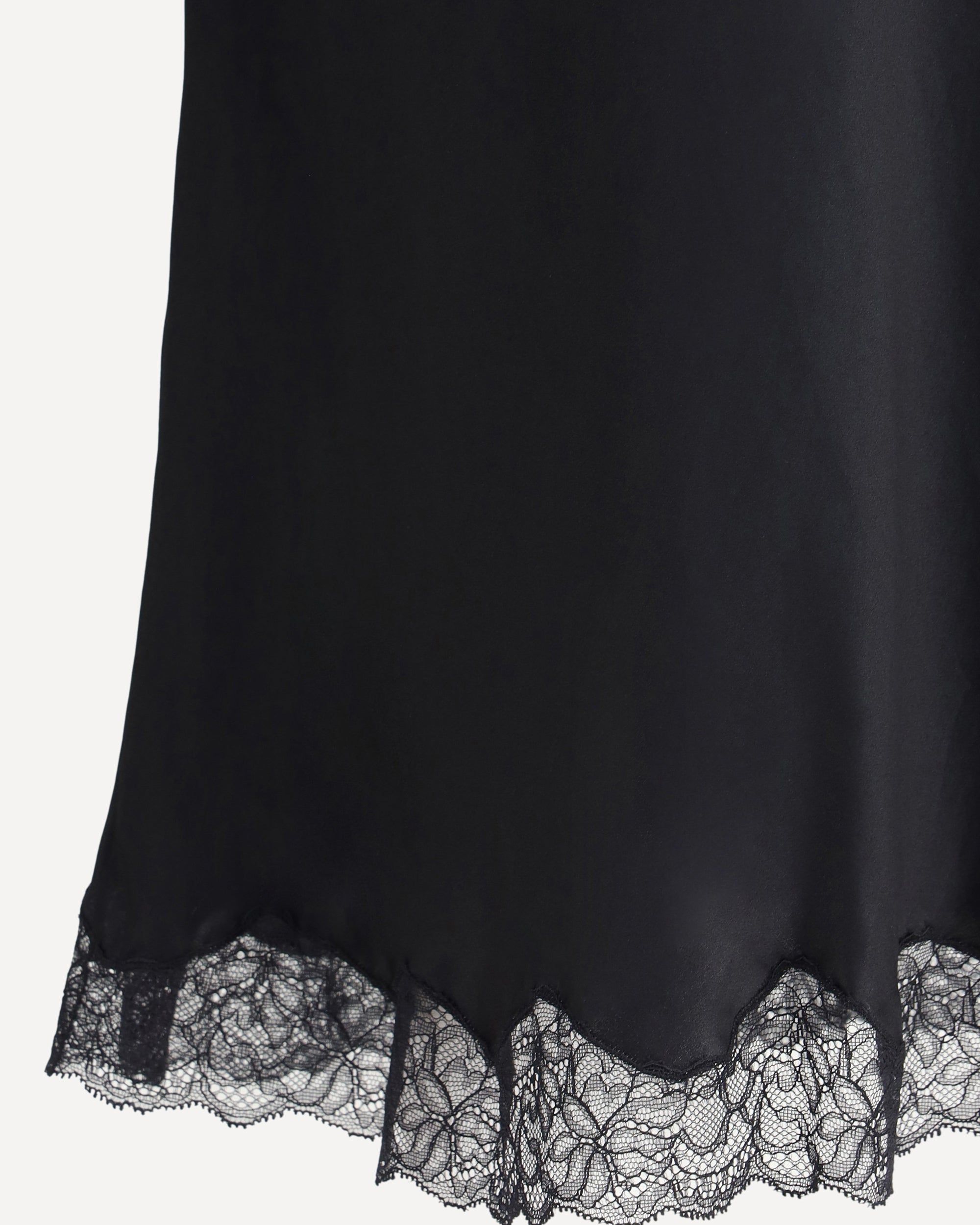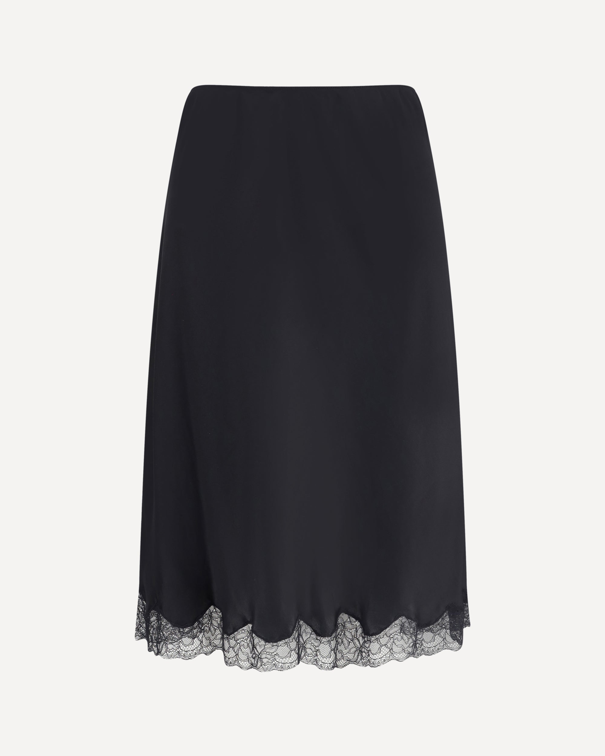 The Row's Irene midi Skirt by The Row exemplifies understated and refined elegance. Made of fine silk charmeuse, it glides gently over the silhouette giving a fluid and sophisticated fit. The elasticized waist offers comfort without sacrificing style, while the tone-on-tone lace trim adds a feminine and refined detail, perfectly in line with the brand's essential and luxurious aesthetic.