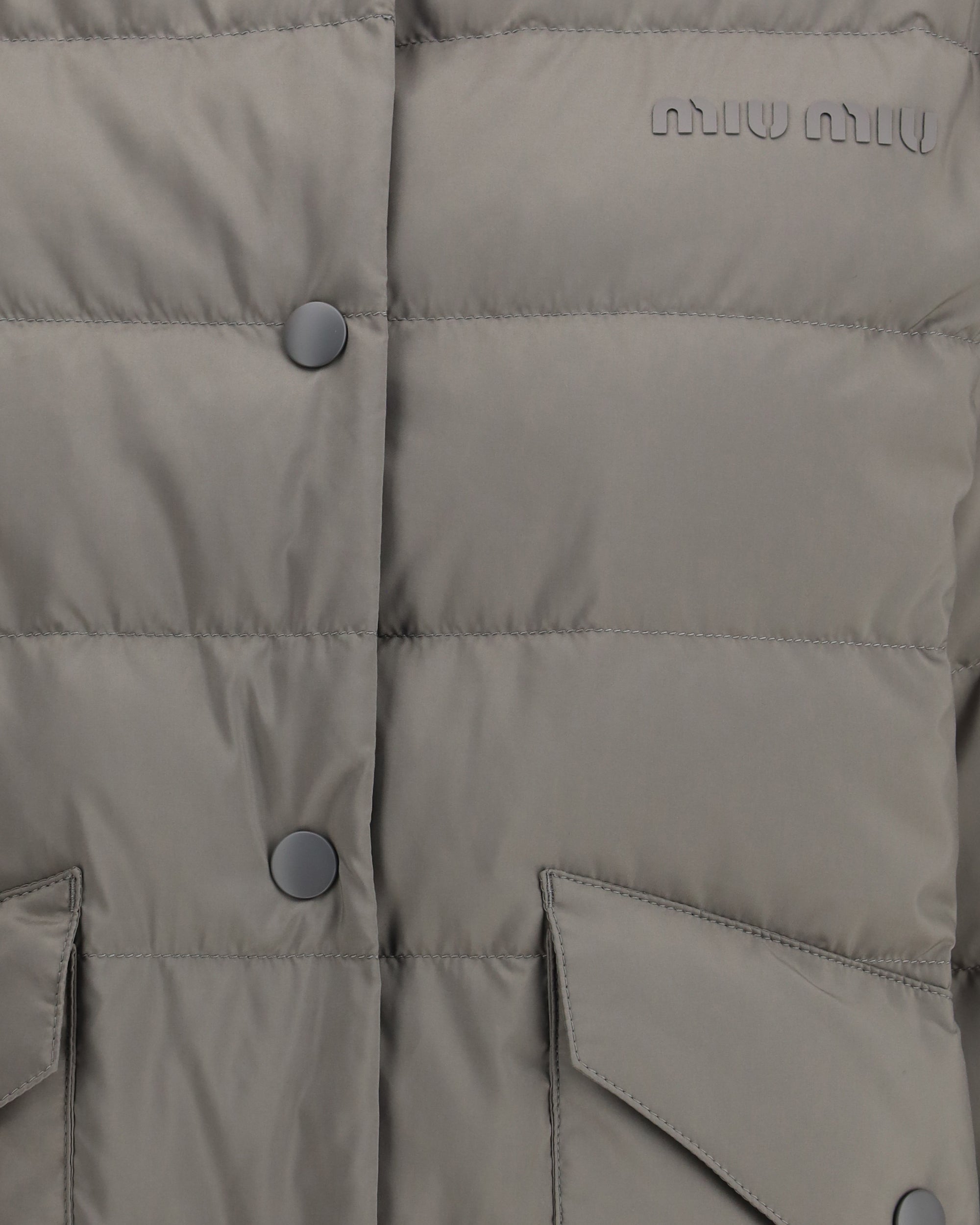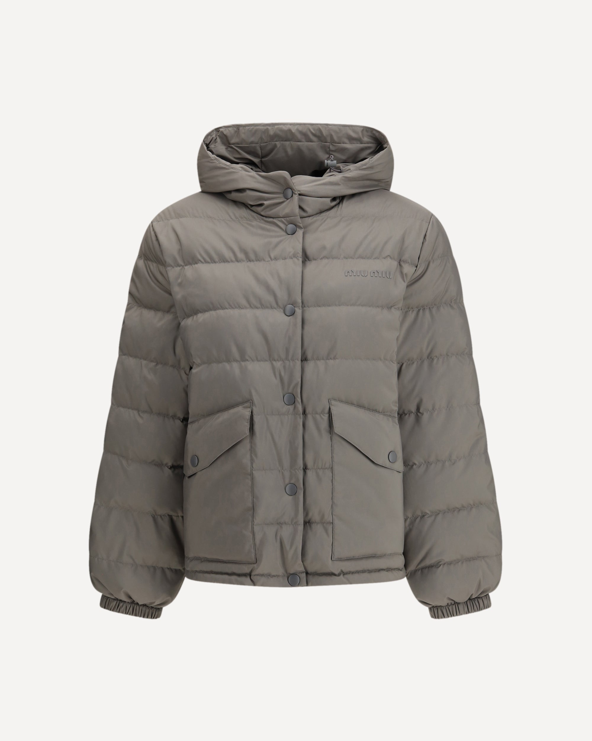 The pongé tec Down Jacket by Miu Miu is a lightweight and versatile garment that combines functionality and urban style. Made of technical fabric, it reinterprets outdoor codes with a structure that makes it perfect both as a standalone garment and as a thin layer in bolder combinations. Down filling provides warmth and lightness, while the drawstring hood and long sleeves with elastic cuffs offer an adjustable, protective fit. The snap-button closure and flap and button pockets add practical and sophisticated details, while the elastic drawstring at the hem allows you to customize the silhouette. The back-injected logo on the back completes the look with a distinctive, modern touch.