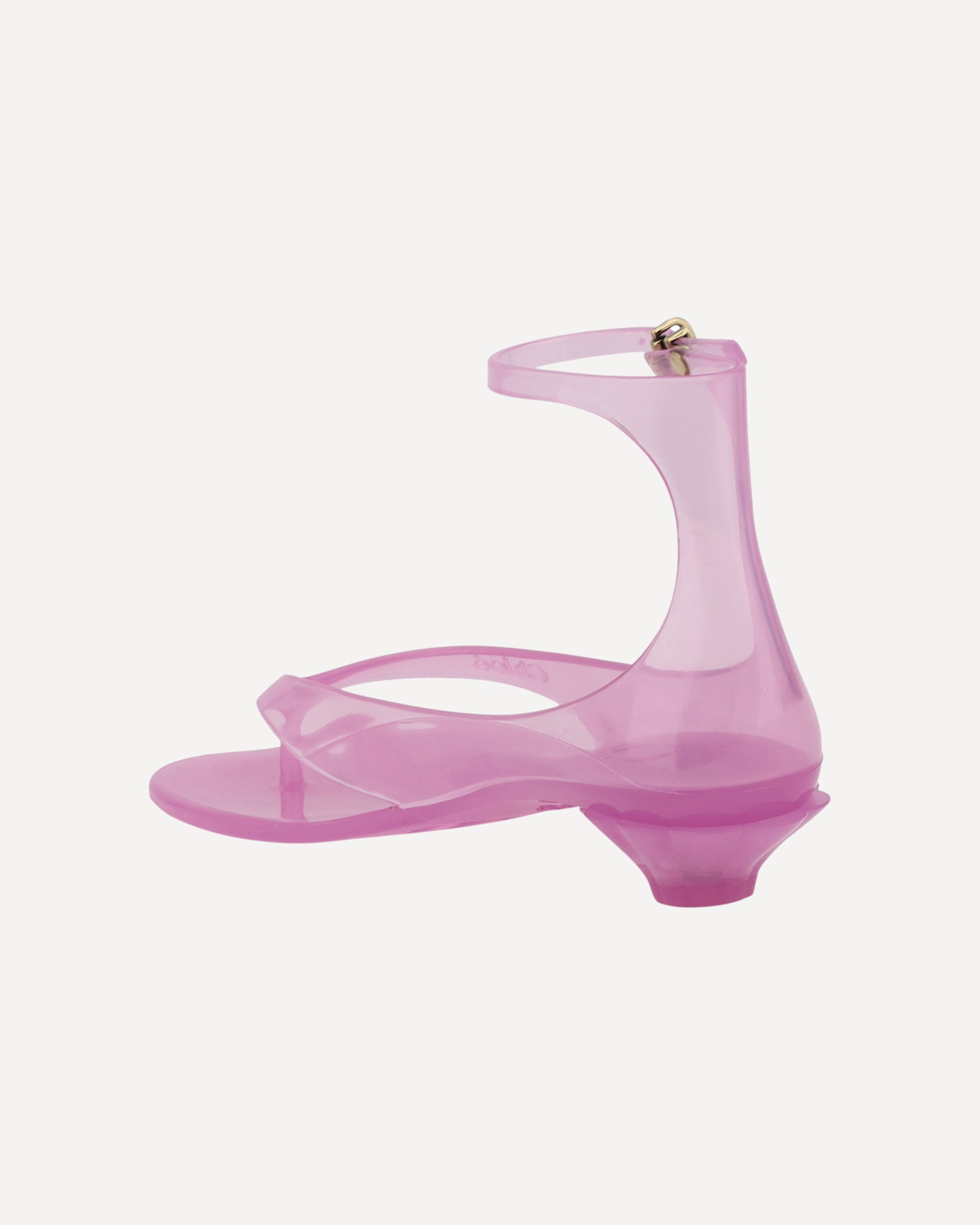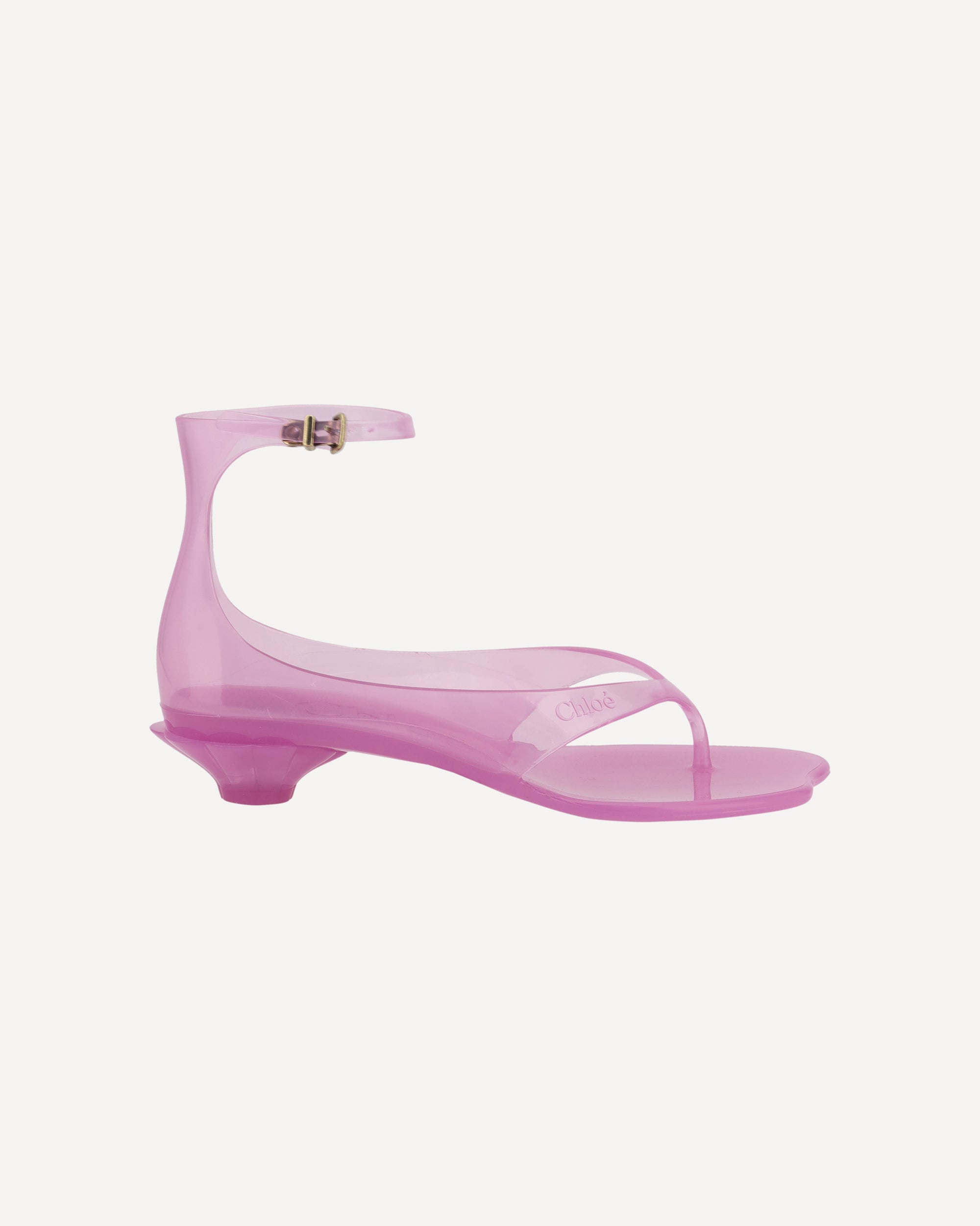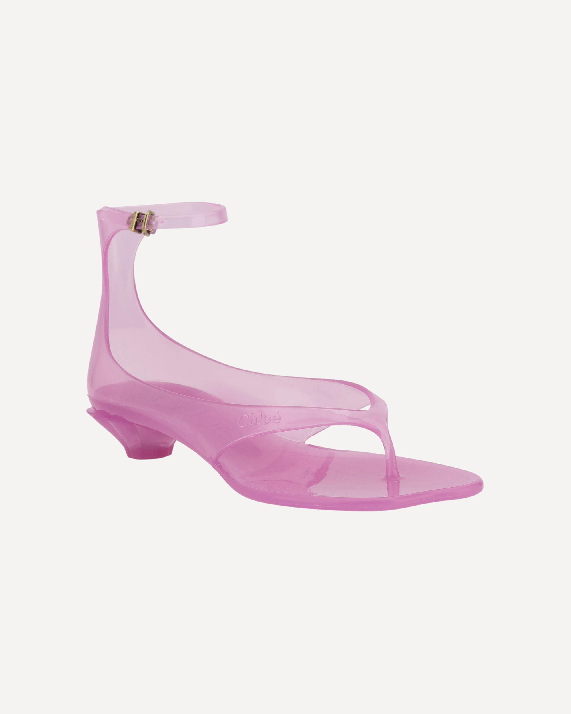 Chloé's Jelly Sandals are a flip-flop style made of transparent TPU, with an elegant embossed Chloé pattern on the instep. The adjustable ankle strap closure ensures a comfortable fit, while the preformed sole and low heel offer comfort and stability. The embossed logo on the inside adds a touch of sophistication, making these sandals perfect for an elegant and casual summer look.