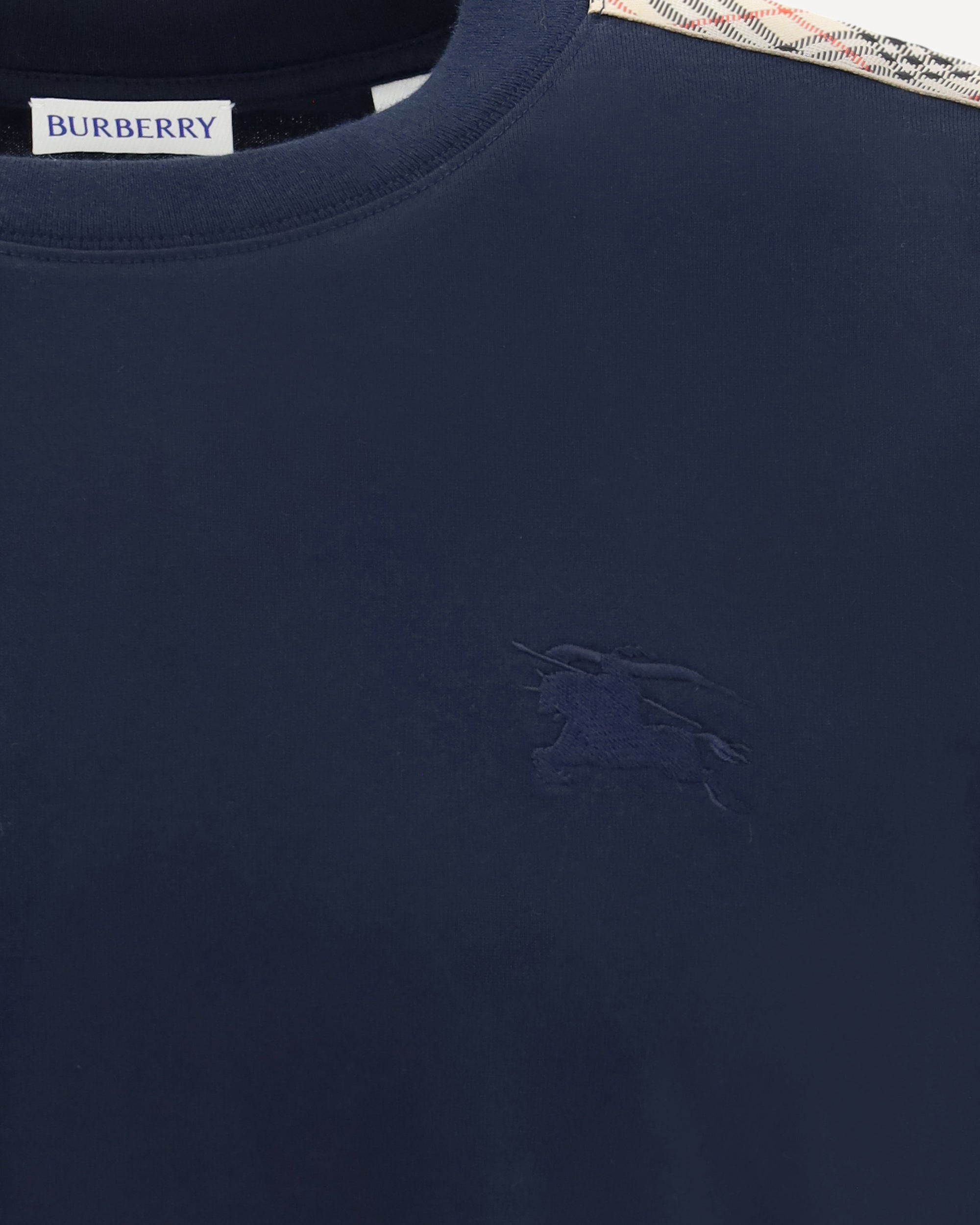 The short-sleeved crew-neck T-shirt by Burberry blends the brand’s iconic heritage with modern refinement. Crafted from soft cotton, it features the embroidered Equestrian Knight Design on the chest and a single Burberry Check stripe running along each shoulder. Timeless yet distinctive, this piece elevates everyday wear with subtle elegance and unmistakable British flair.