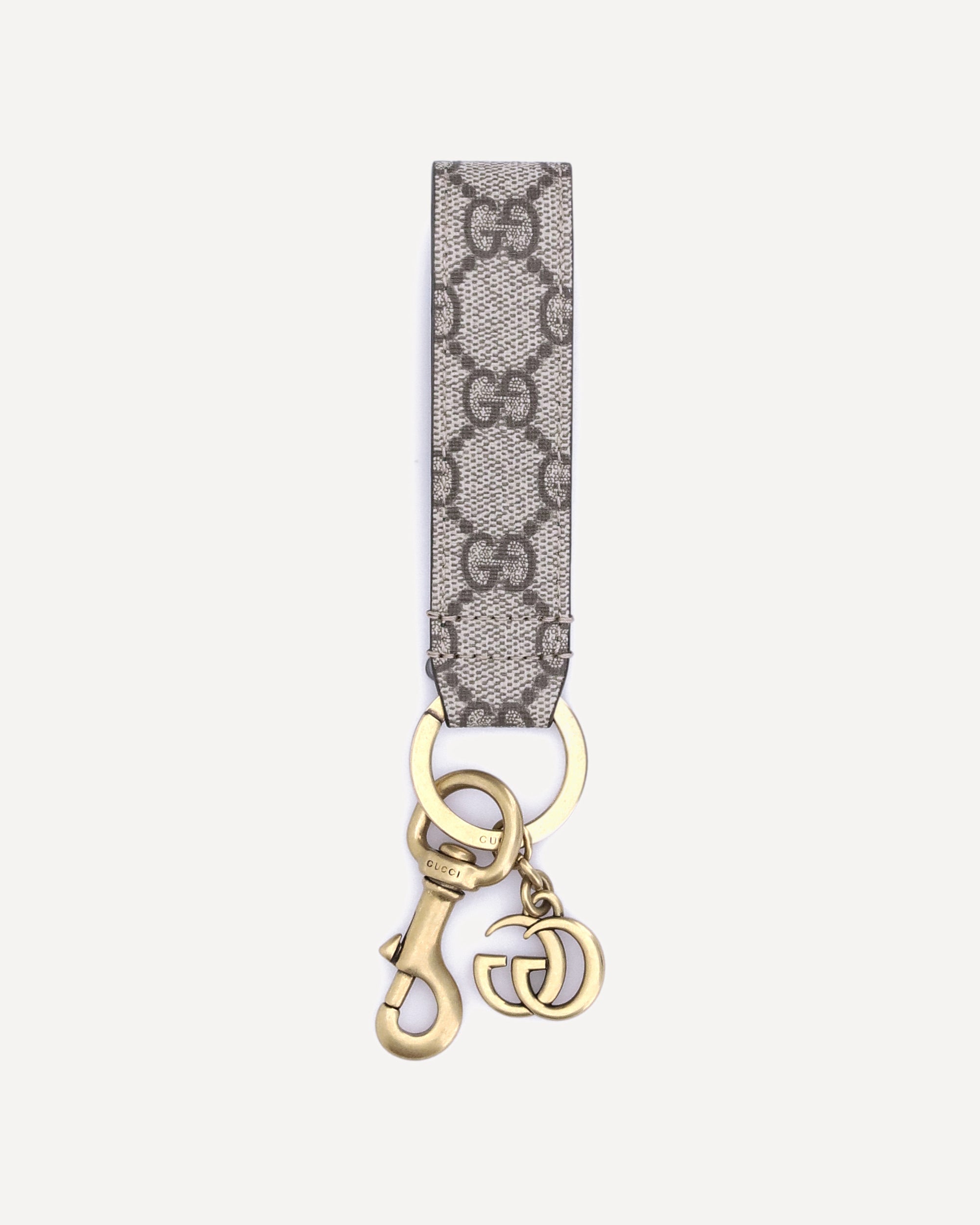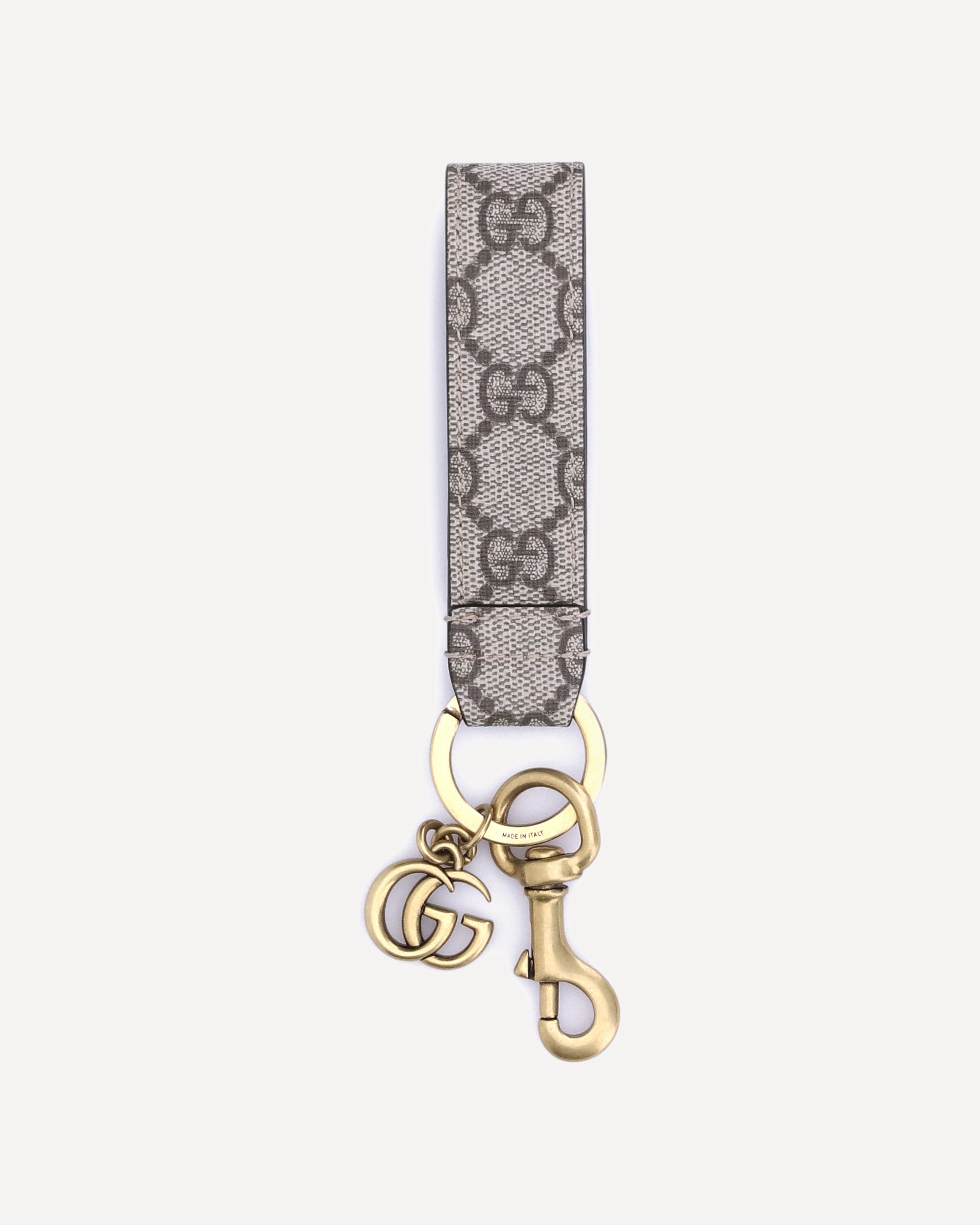 Keychain by Gucci's Ophidia line, featuring a metal lobster claw ring and the iconic applied metallic GG logo. Complemented by a puller with contrasting GG detail, it represents a refined and functional accessory, perfect for adding a distinctive and recognizable touch to everyday life.