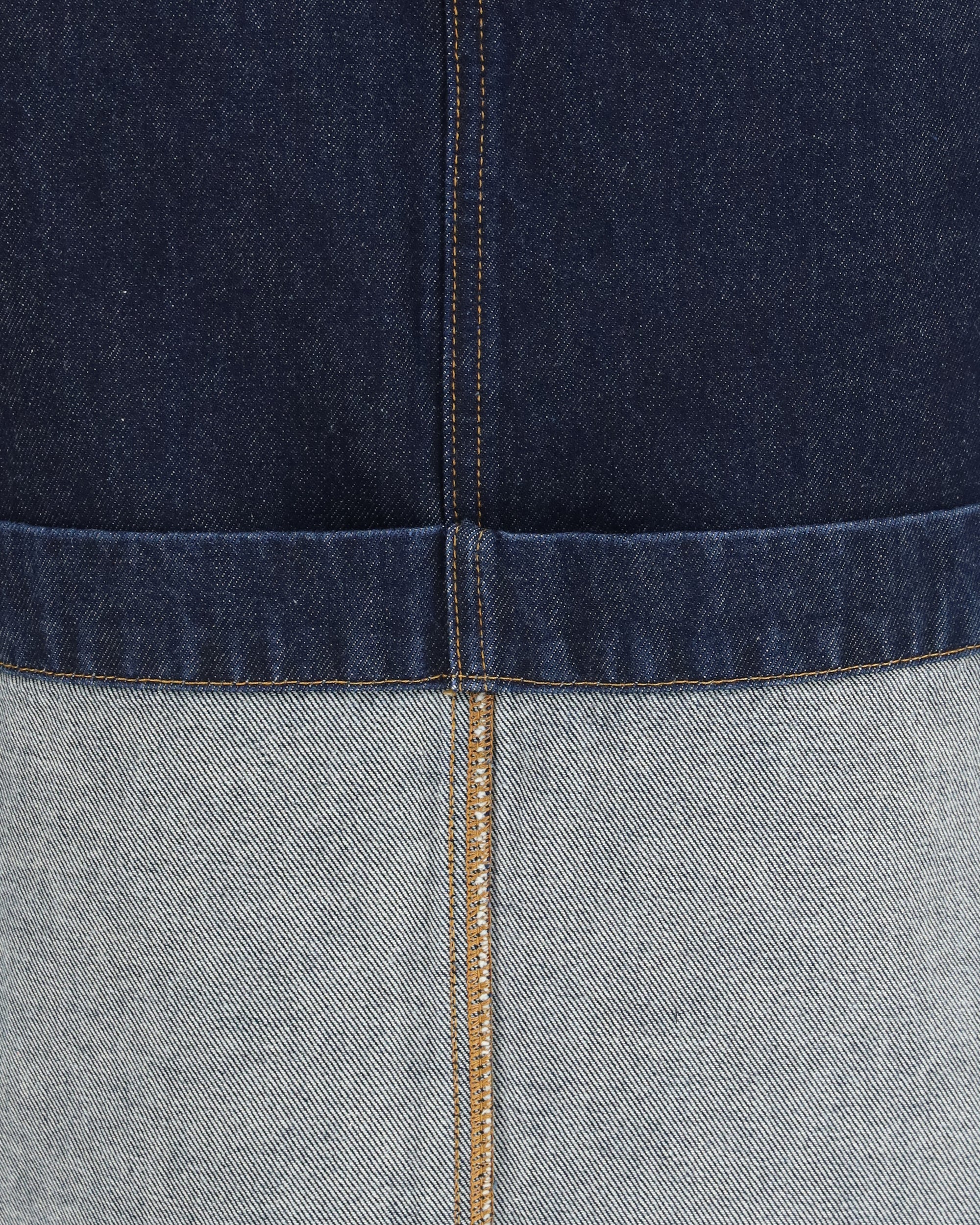 The Kilian denim Skirt by Khaite is a sturdy and sophisticated piece, made from classic indigo denim. With a low waistline, it offers an elongating effect that enhances the silhouette. The five-pocket design is enhanced by a back slit that adds lightness and movement. A basted cuff at the back reveals detailed stitching, while the distinctive button completes the look, adding a unique and refined touch.