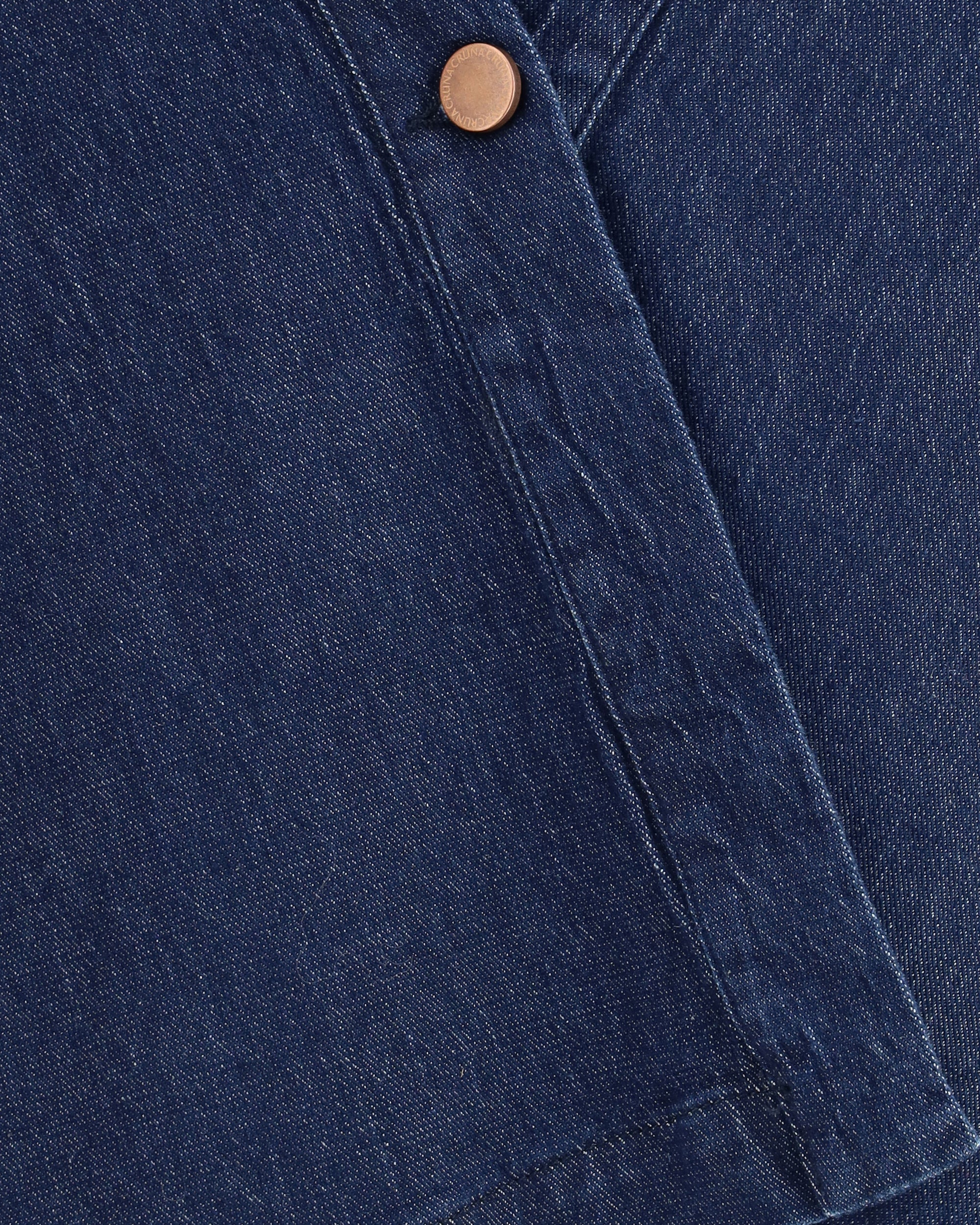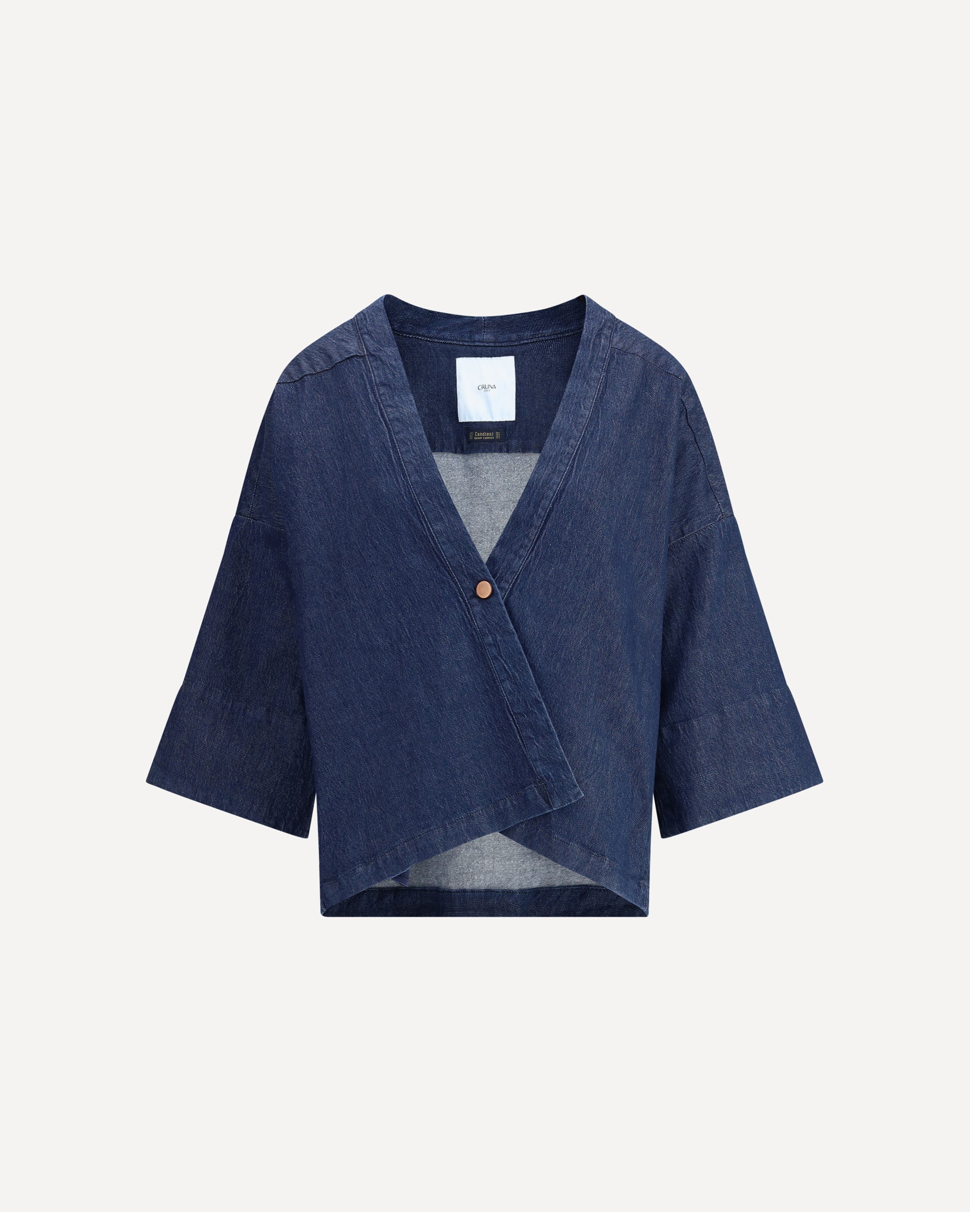 Cruna's Denim Jacket is a stylish and innovatively designed garment that blends the tradition of denim with a modern cut. The kimono-style, single-button front closure offers a comfortable, flowing fit, while the two welt pockets add practicality and a touch of sophistication. This versatile piece can be easily paired with a variety of looks, both casual and more structured, giving a contemporary twist to any outfit.