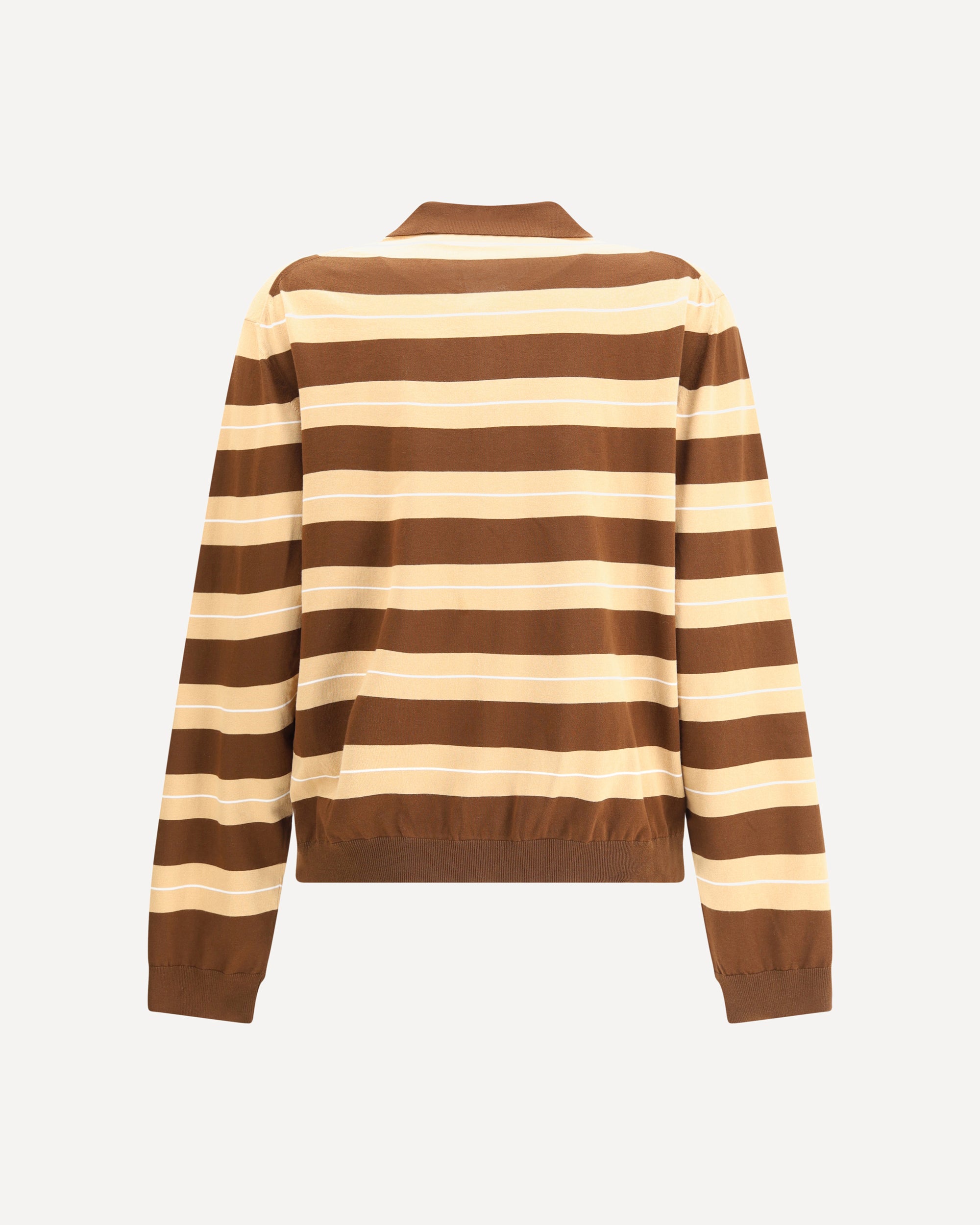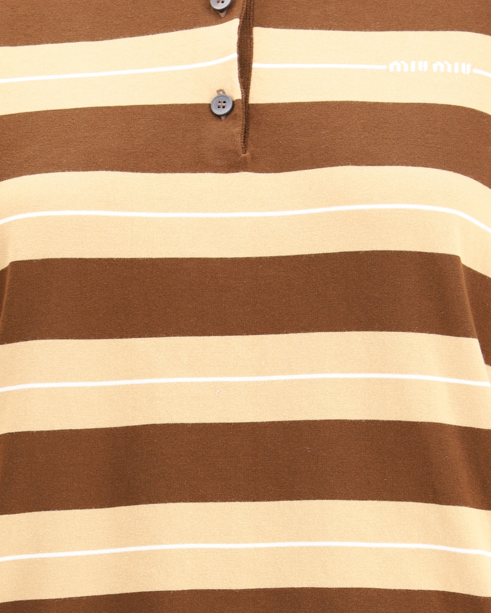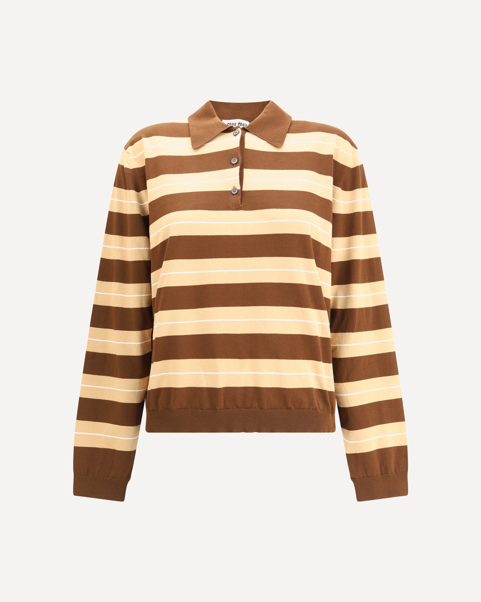 Cotton long-sleeved Polo Shirt by Miu Miu features a classic collar and buttons on the front for a practical and stylish closure. The garment features the iconic monogram on the front, ribbed cuffs and hem for a comfortable fit. The striped pattern gives a dynamic and modern touch, perfect for completing casual chic looks.