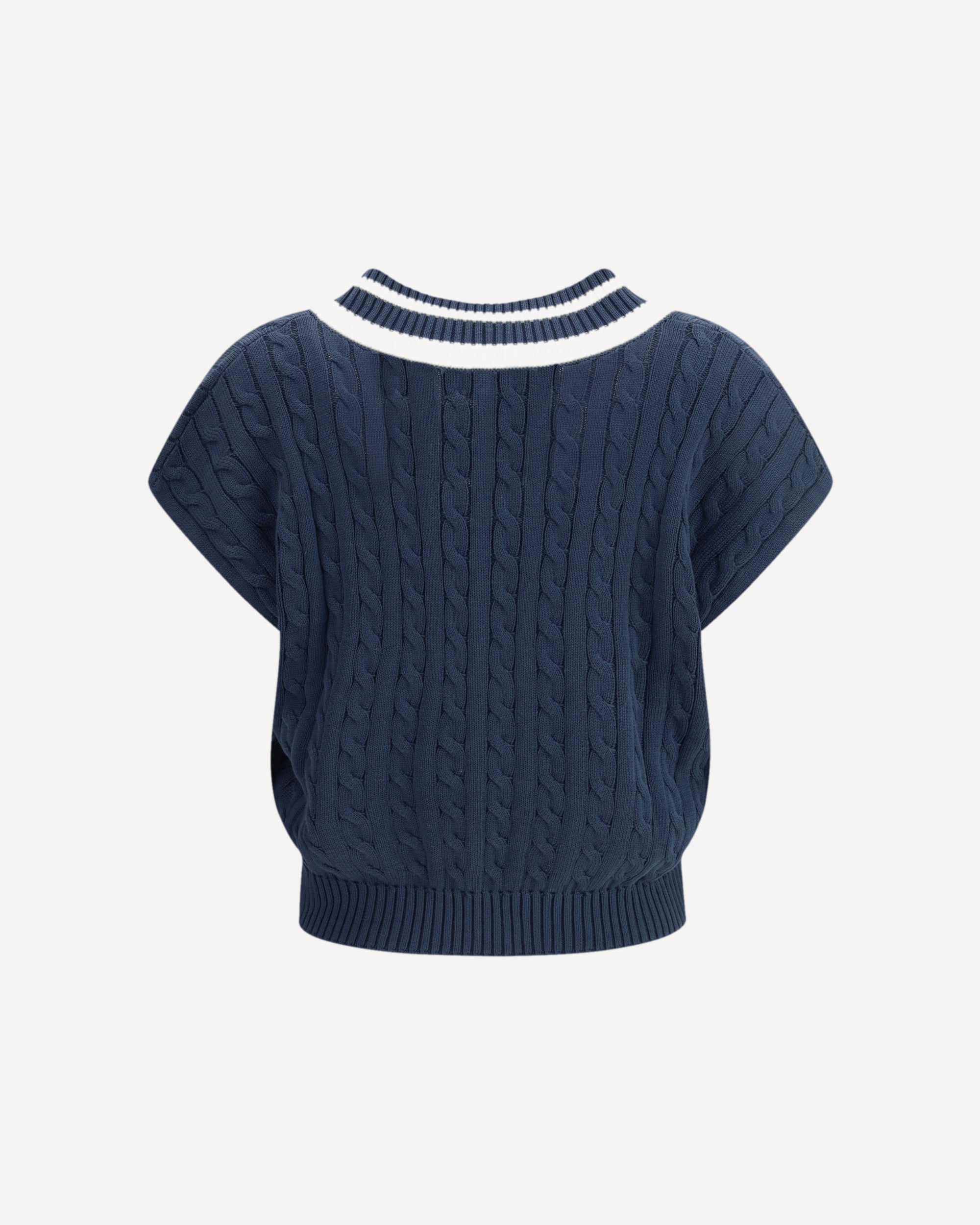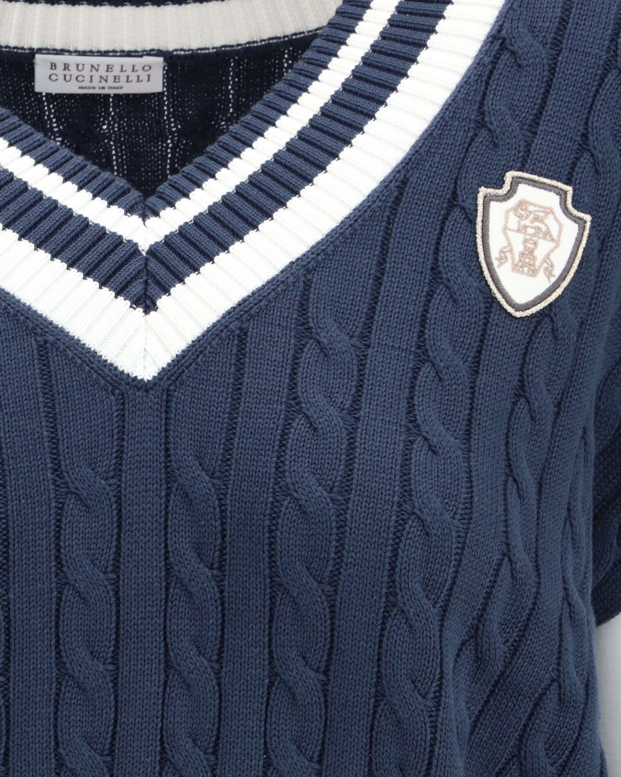 The Aran-patterned Vest by Brunello Cucinelli reinterprets classic knitwear with contemporary elegance. Crafted from cotton yarn, it features a dropped-shoulder design and a ribbed elastic belt that gently shapes the silhouette. The V-neckline, enhanced by contrasting stripes, adds a refined sporty touch, while the heraldic crest bearing the emblem of Solomeo embodies the brand’s artisanal heritage and timeless identity.