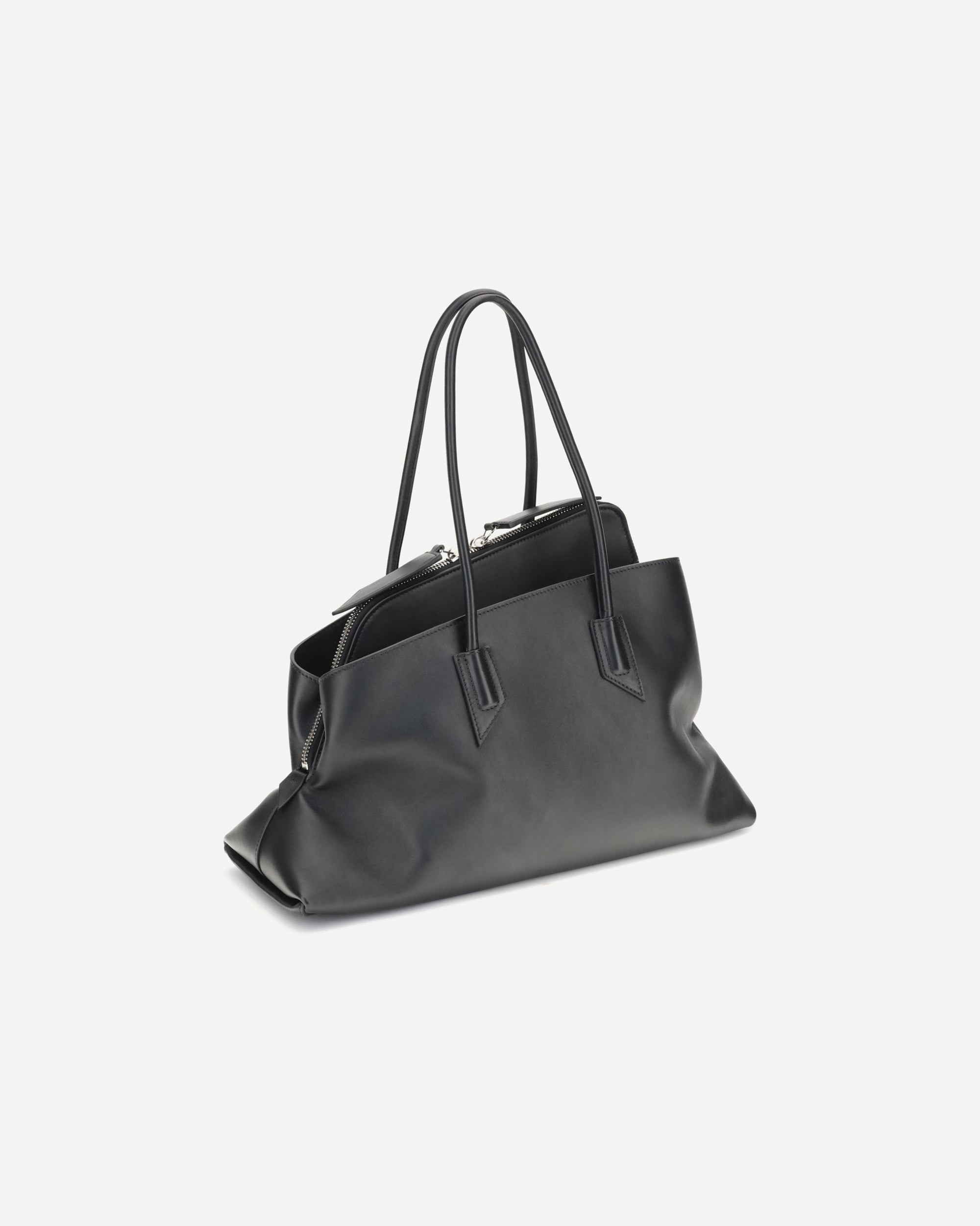 The Attico La Passeggiata leather Shoulder Bag is an elegant and functional accessory, perfect for adding a touch of sophistication to your look. Equipped with two top handles, it offers comfortable and versatile portability. The top zip closure ensures security, while the iconic snap monogram detail on the front adds a distinctive and recognizable touch of the brand. The metal feet at the base protect the bag and enhance its design, while the two welt pockets on the front and back offer extra space to store essentials. A practical piece with a great stylistic impact.