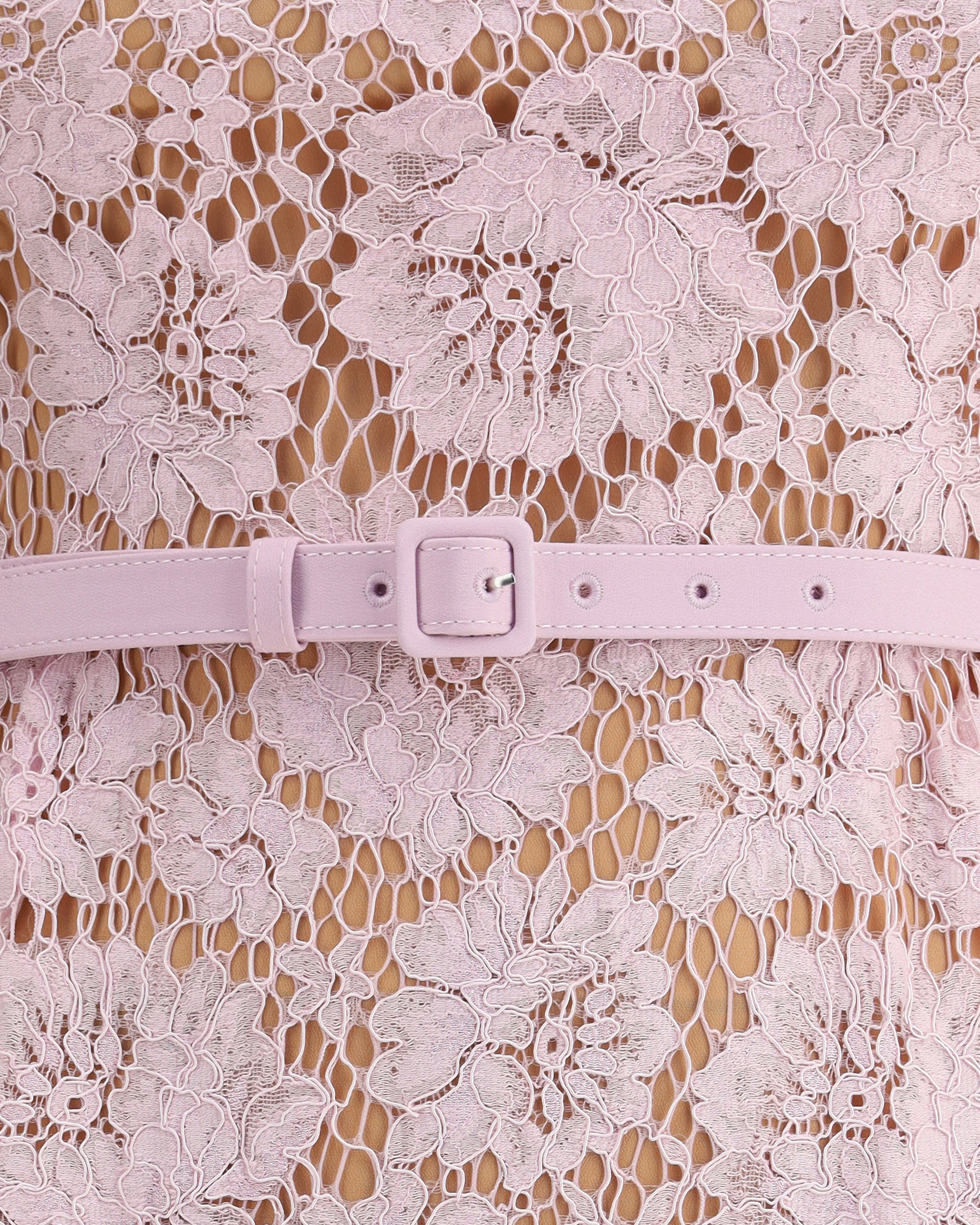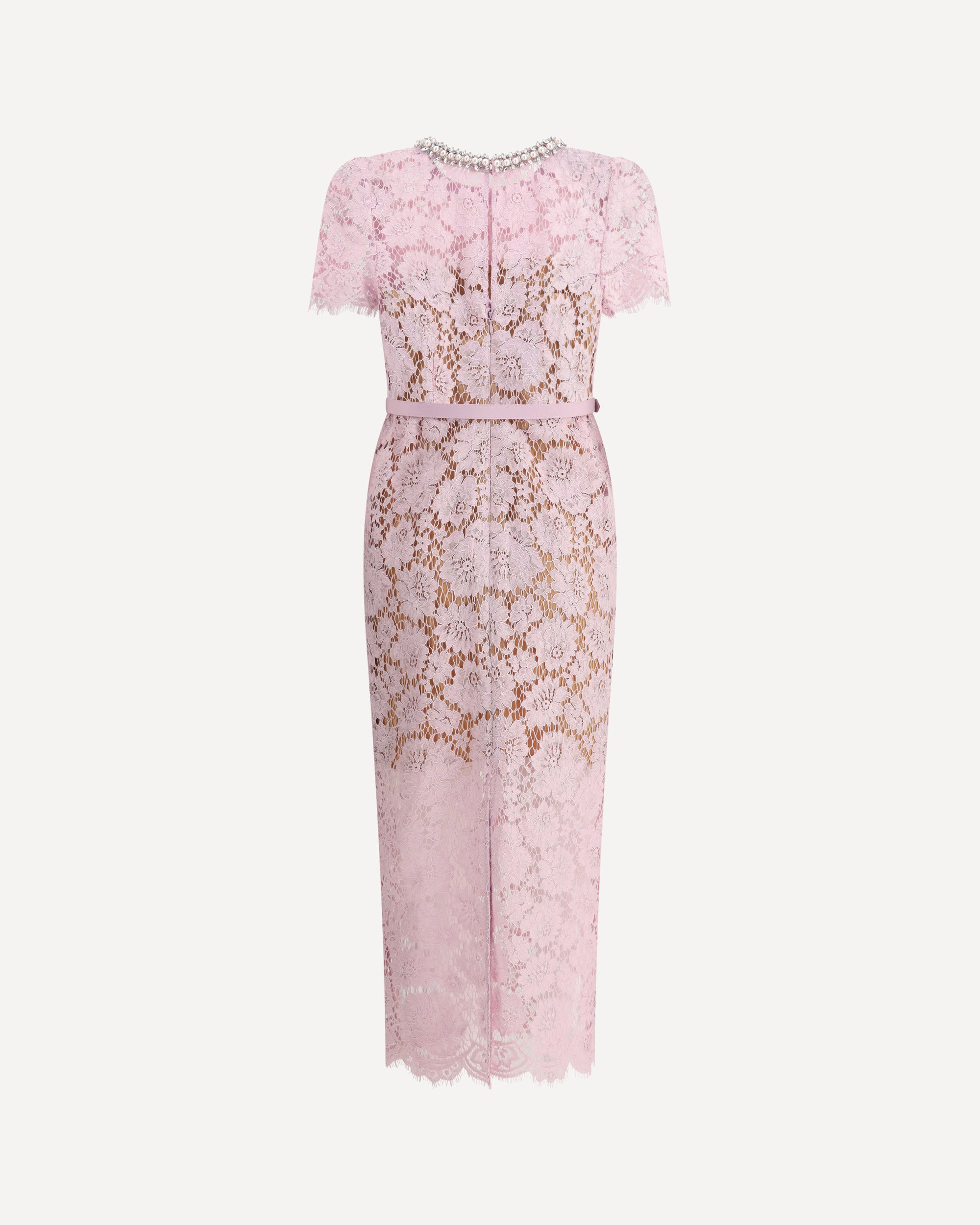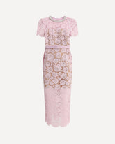 Self-Portrait's floral openwork lace midi Dress features short sleeves and a back zipper closure. The neckline is embellished with pearls and shiny jewels for a refined touch. Complete with an opaque petticoat and matching adjustable and removable belt, enhancing the silhouette with discretion.