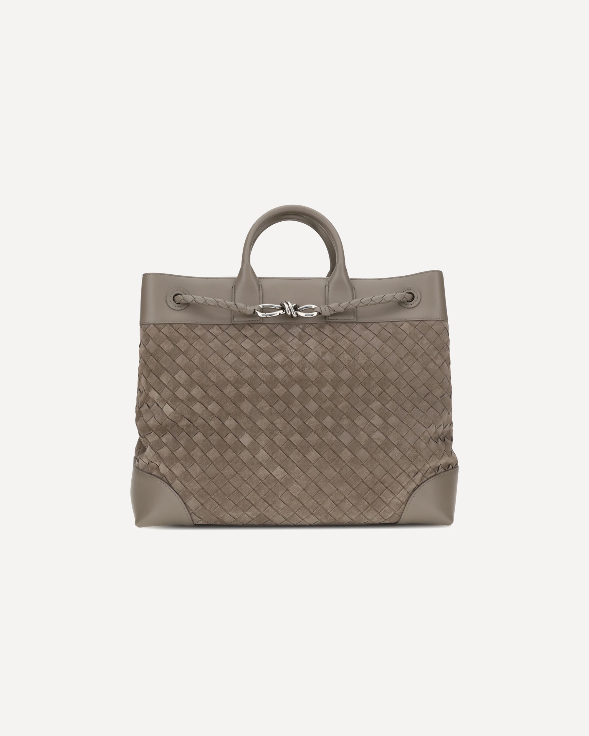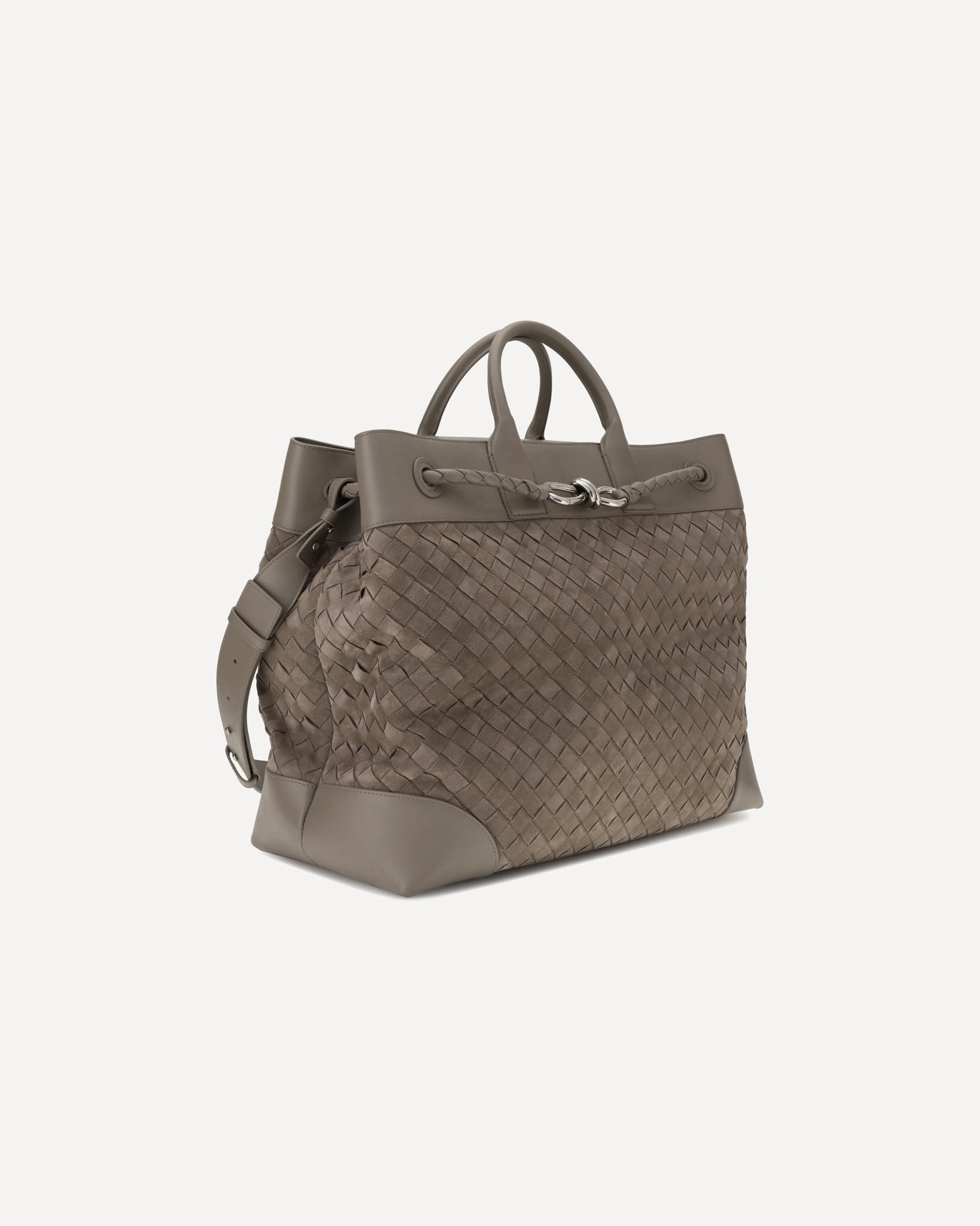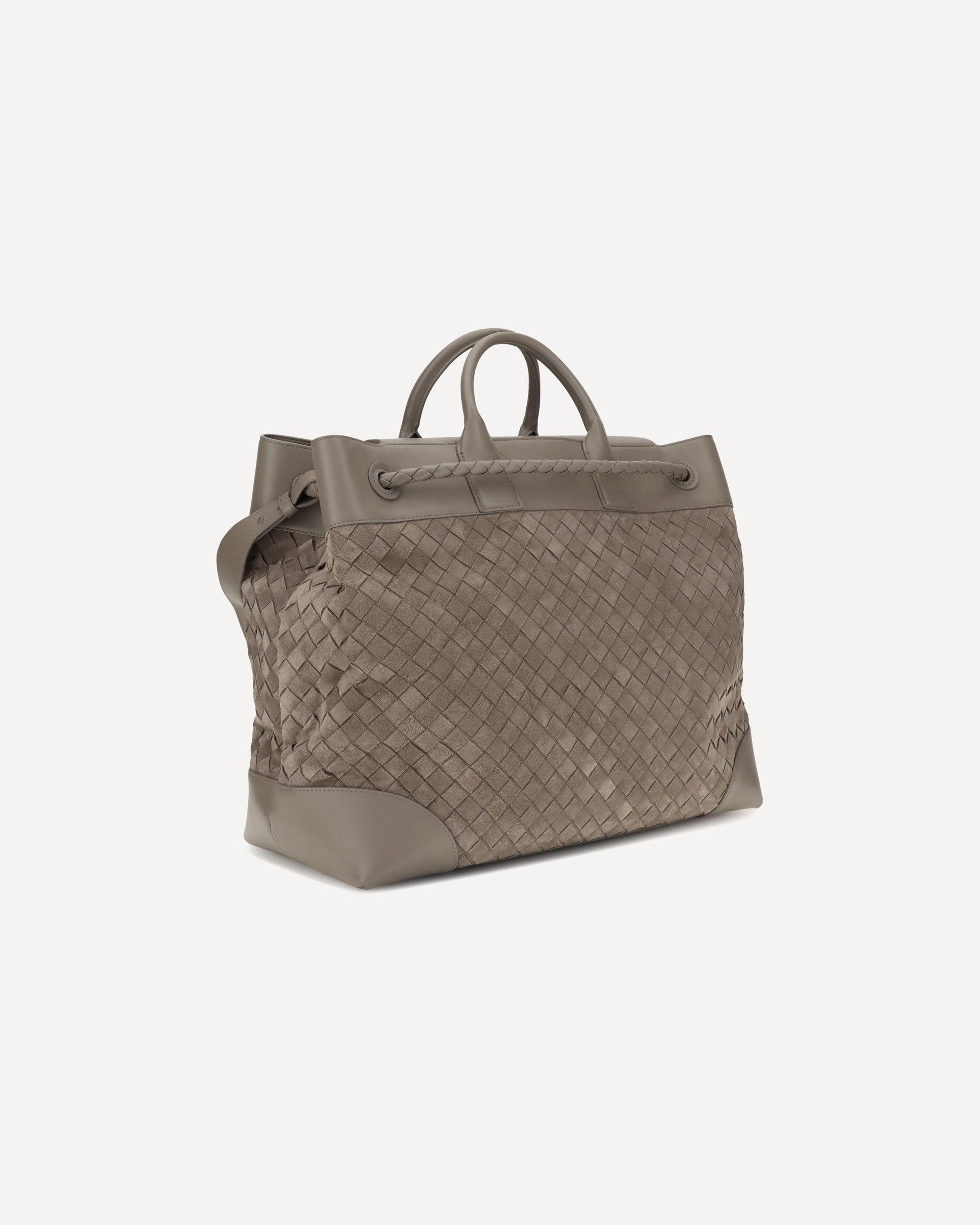 The Andiamo Travel Bag by Bottega Veneta embodies the brand's excellent craftsmanship, combining smooth leather and soft suede in an elegant Intrecciato pattern. Embellished with the emblematic Knot detail, the distinctive symbol of the maison, it features an adjustable and removable cross-body strap that enhances its versatility. A sophisticated accessory designed to accompany every move in style.