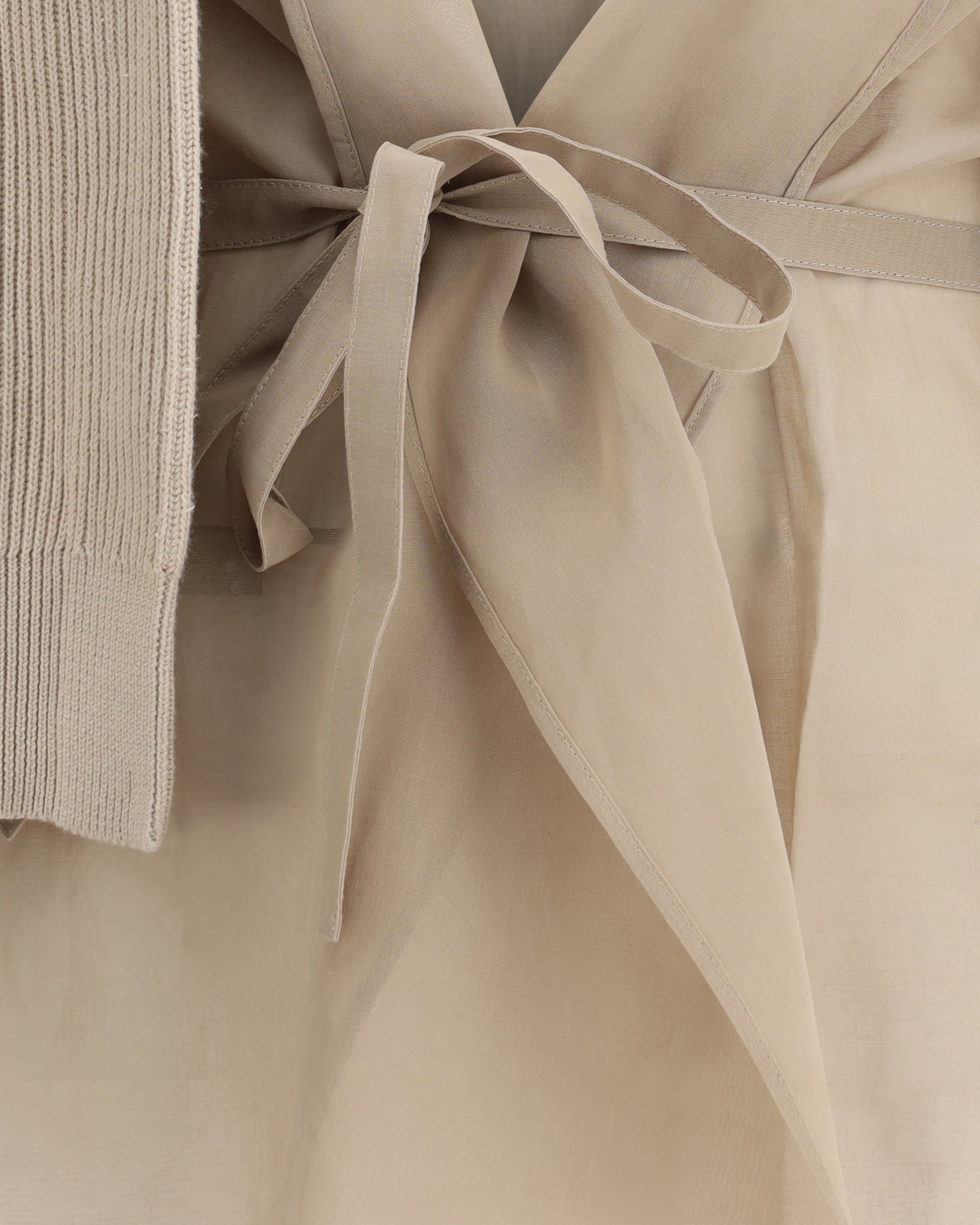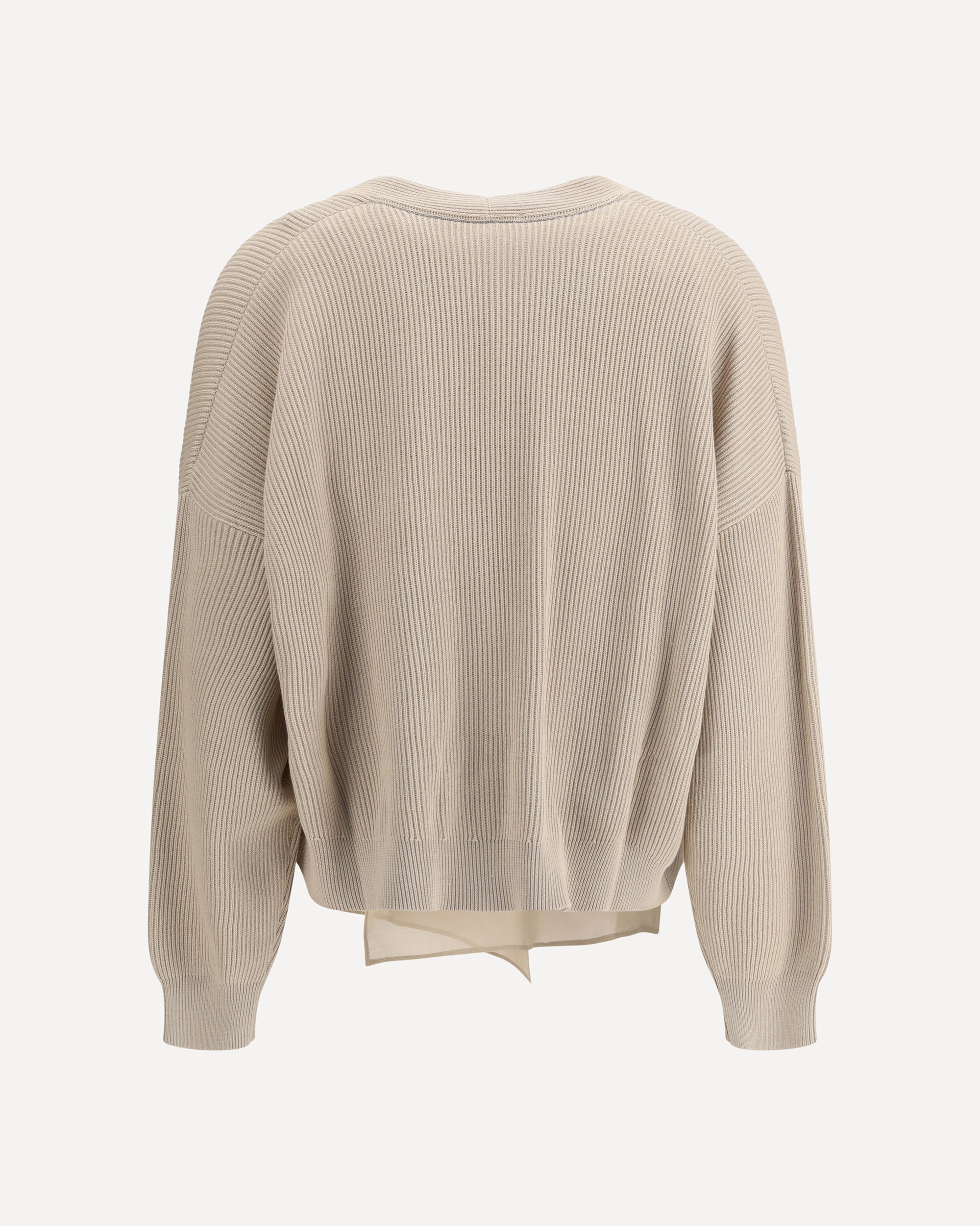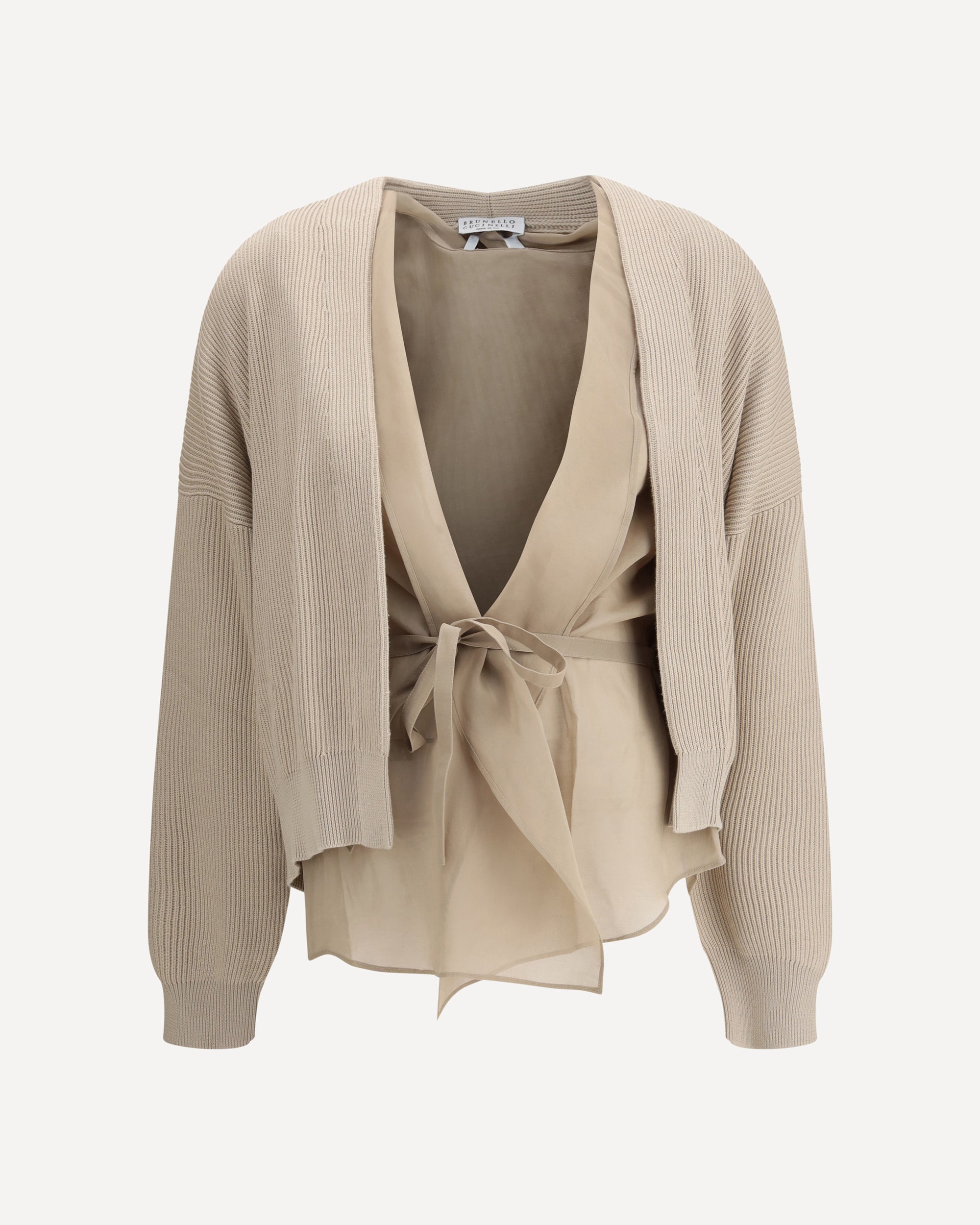 Brunello Cucinelli's Layered Cardigan is a garment with a sophisticated and dynamic style, featuring a wallet and ribbed design that accentuates the texture. The front bow closure adds a delicate touch, while the slit at the front gives an elegant and modern detail, perfect for creating a refined yet comfortable look.