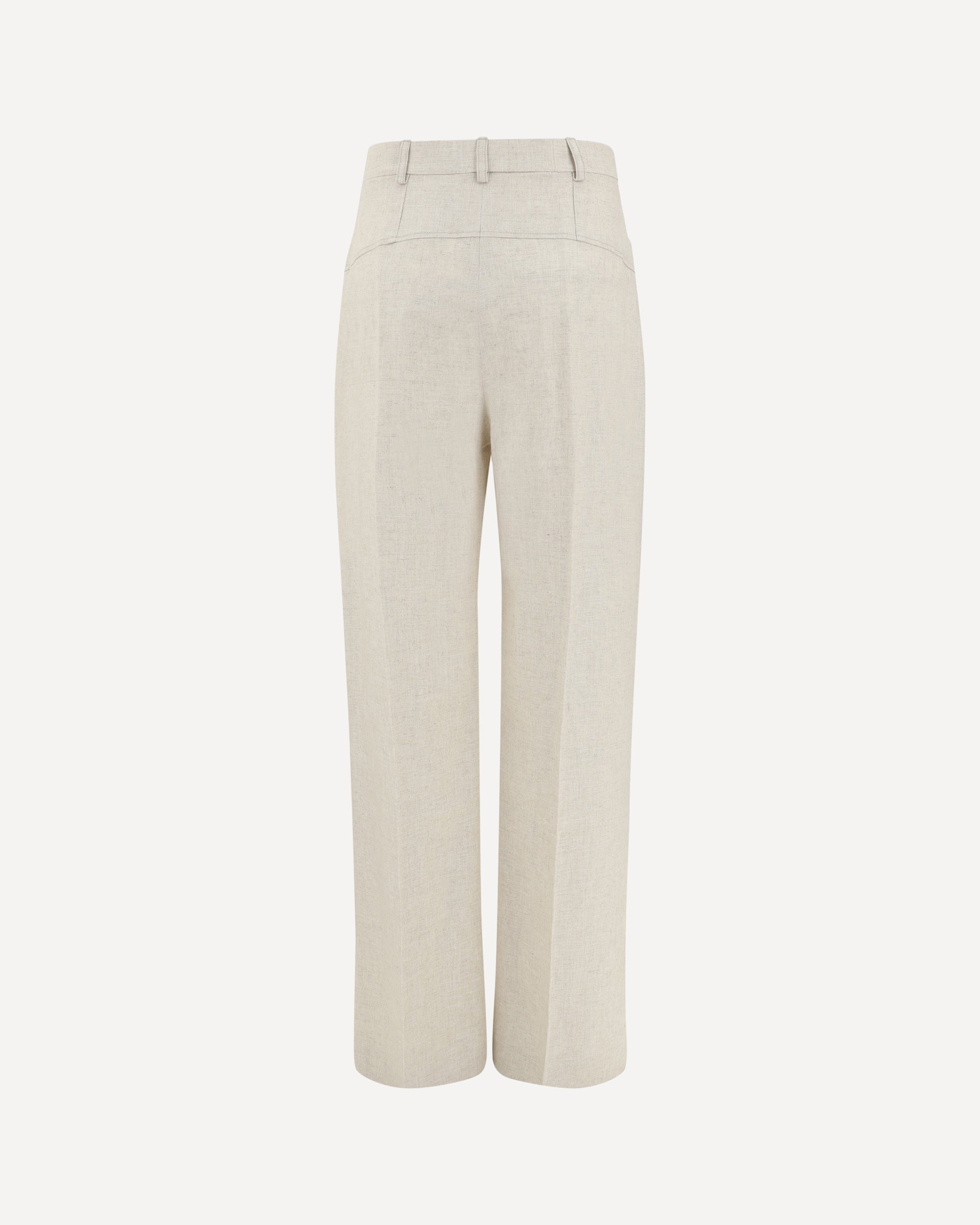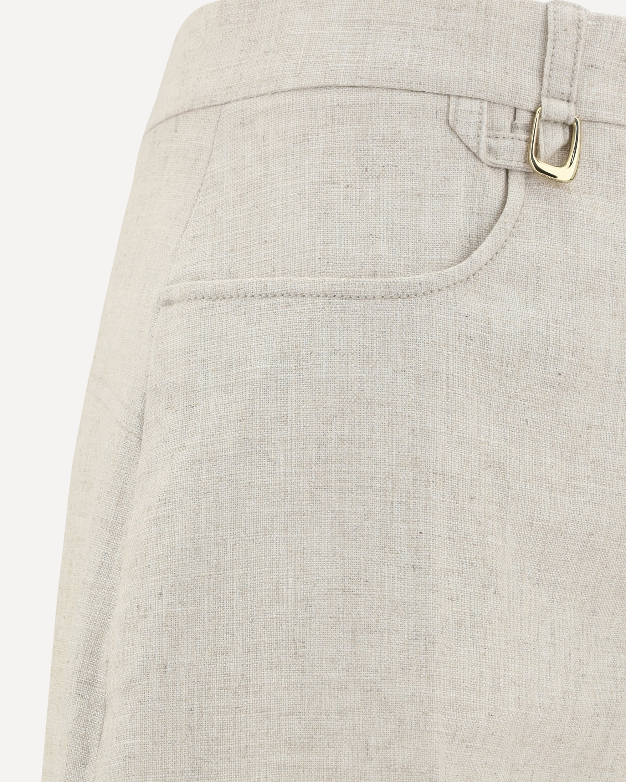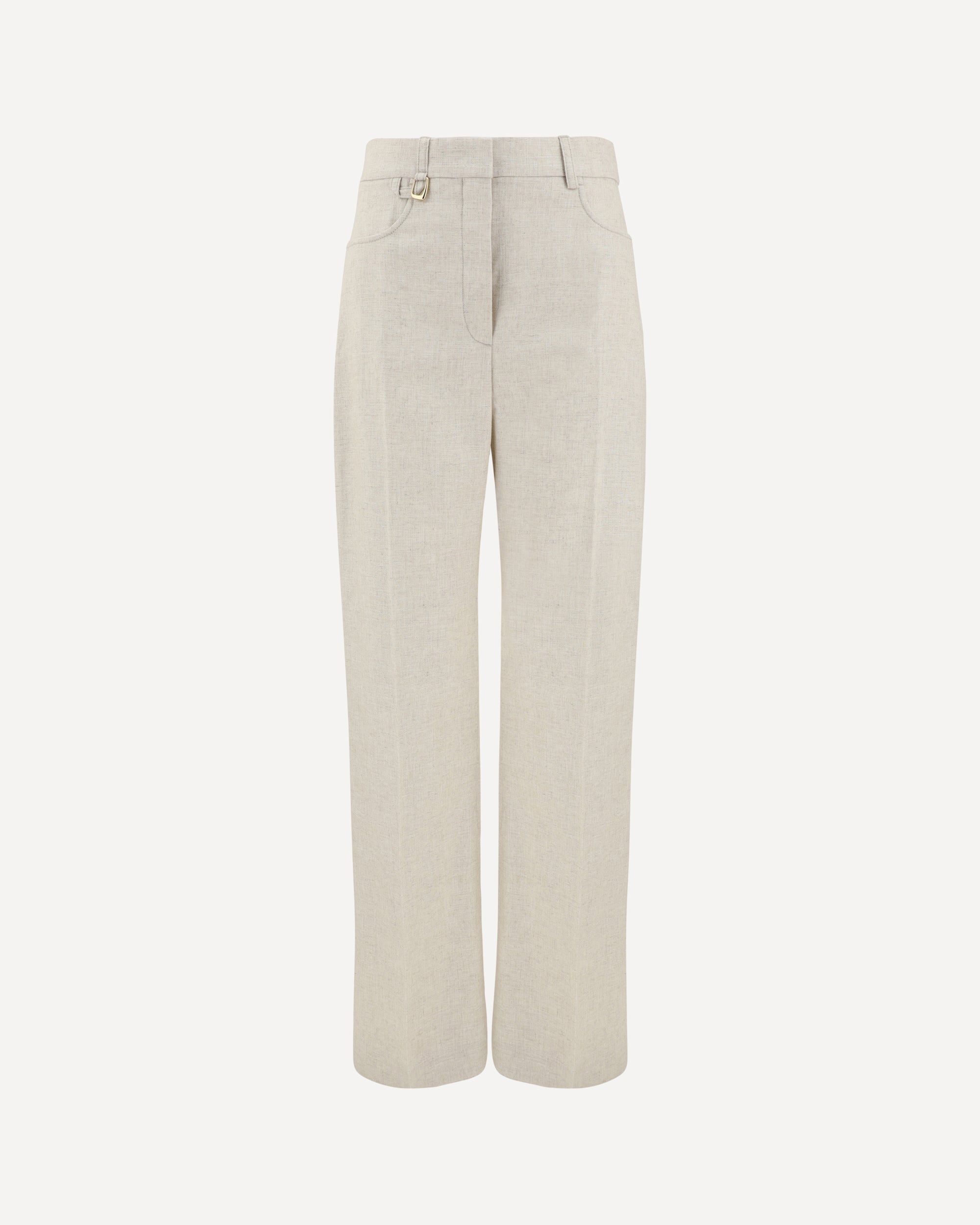 Jacquemus' Le Pantalon Le Sauge Pants are a sophisticated, contemporary piece featuring a front zipper and hook-and-eye closure that ensures a perfect fit. Belt loops on the waistband, with gold ring detail, add a touch of elegance. The two front and back welt pockets offer functionality with a clean, refined design. The flared bottom pattern gives an elongated, modern silhouette, making these pants ideal for a chic, on-trend look.