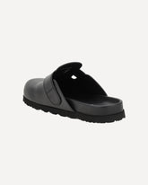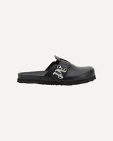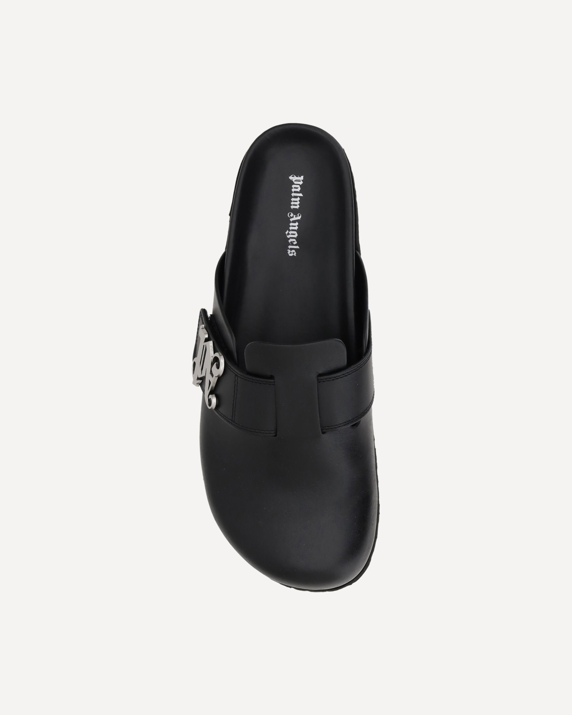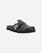 Leather Mules by Palm Angels feature a round toe and slip-on design for an easy, comfortable fit. The wide strap is embellished with a three-dimensional plaque with the brand's iconic applique logo, adding a distinctive and modern touch. The flat sole offers comfort and stability, while the branded insole completes the design, giving an additional exclusive detail.