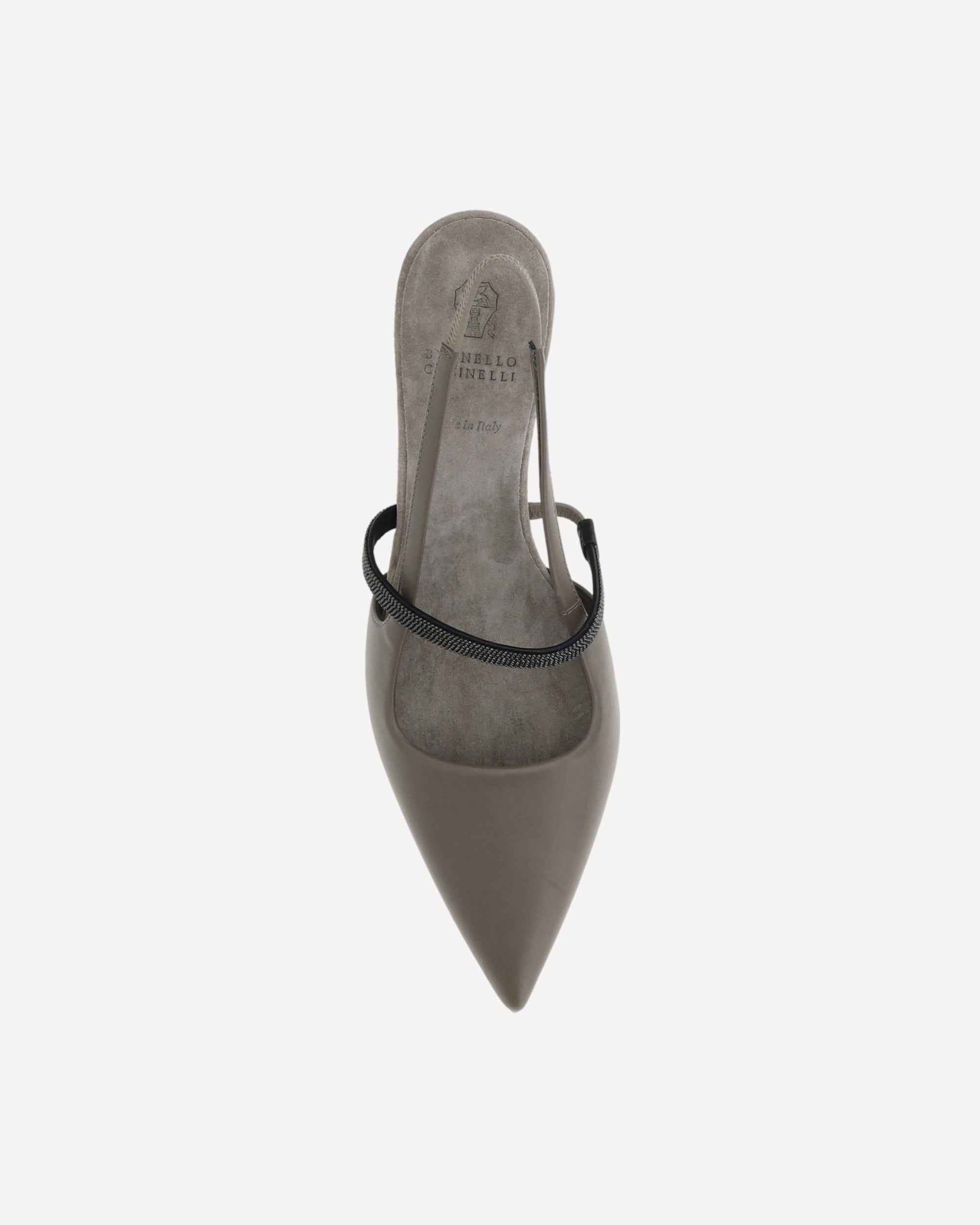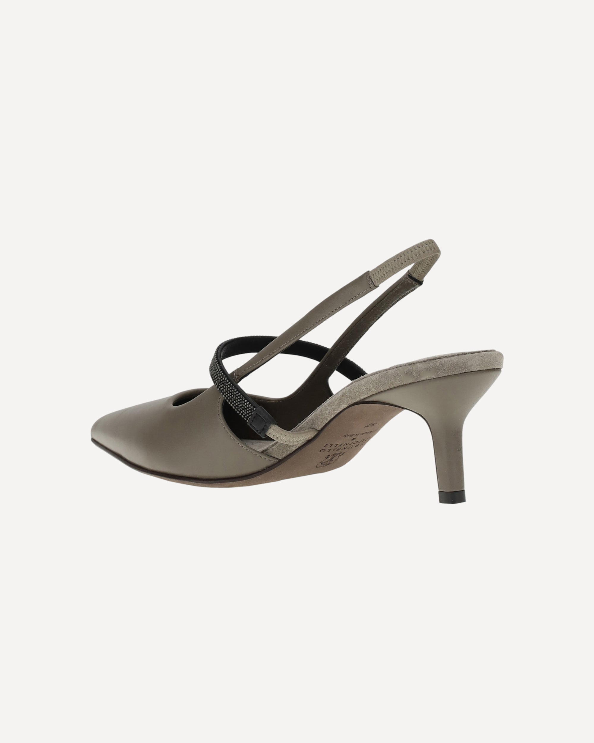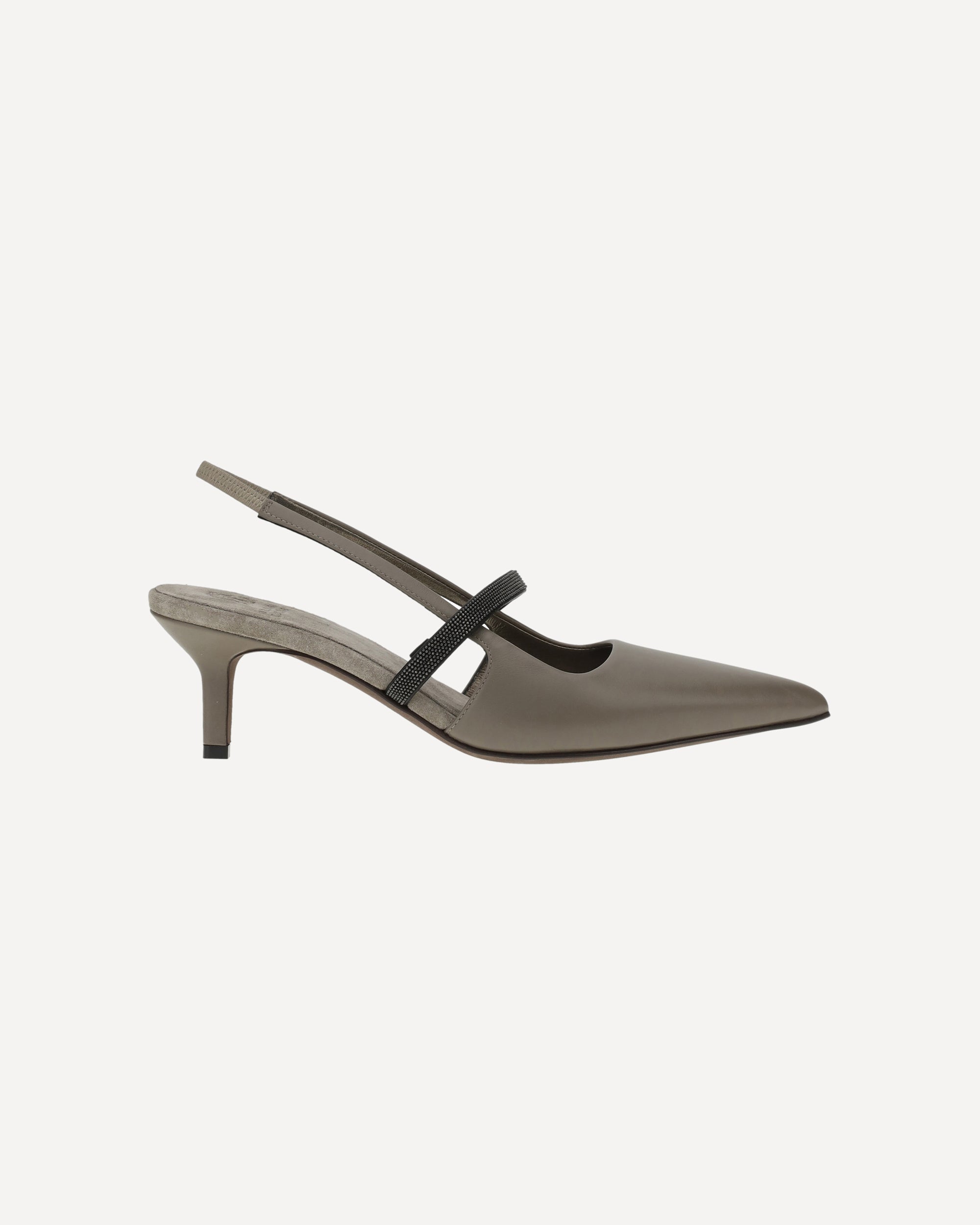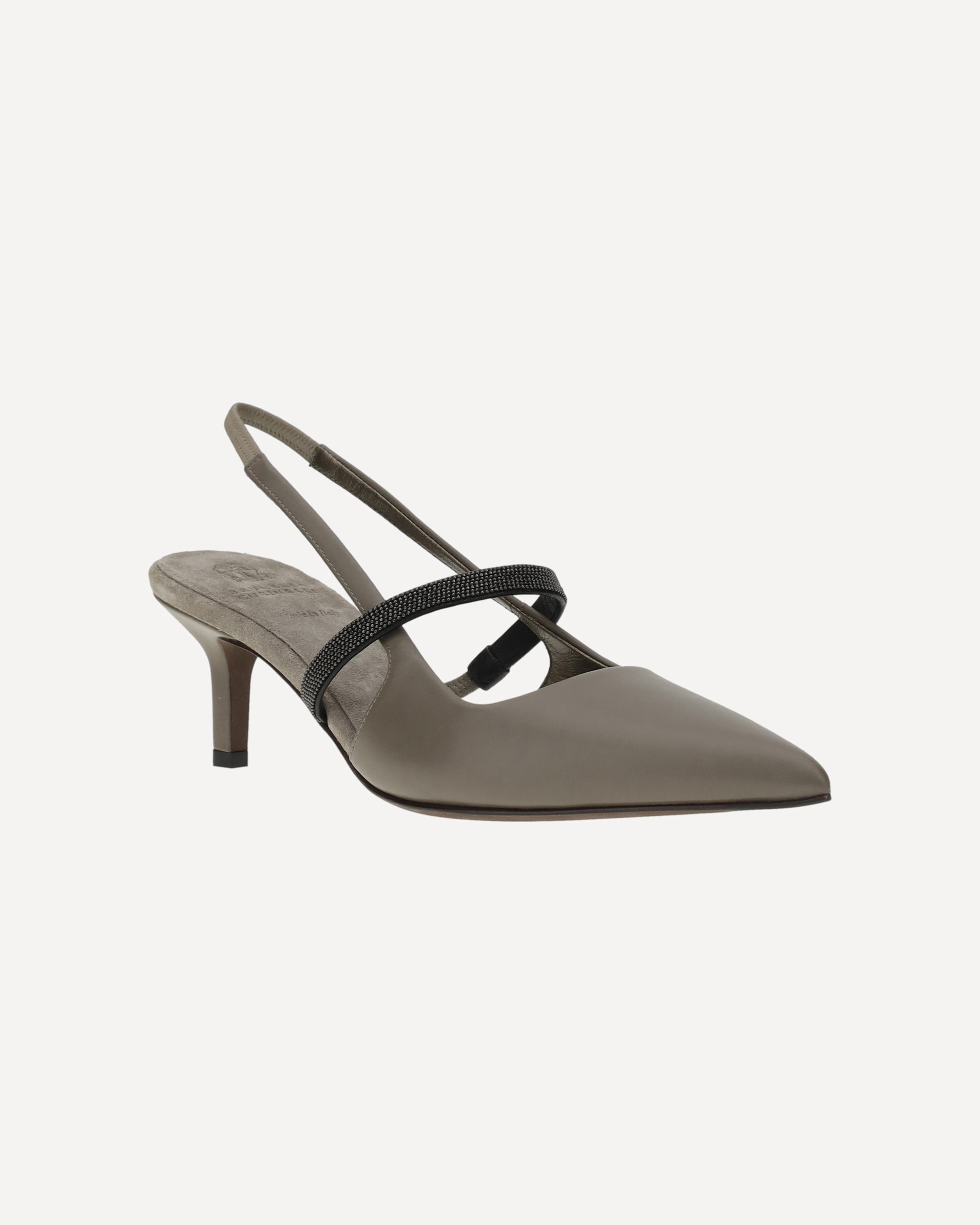 Brunello Cucinelli's leather Décolleté pumps feature an elongated toe that slims the figure, while the kitten leather heel offers elegant, easy-to-wear comfort. The elasticized slingback ensures a secure and comfortable fit, while the front strap is embellished with the iconic appliquéd shiny jewels, adding a touch of understated luxury. The contrasting logoed insole completes the design, confirming the brand's authenticity.