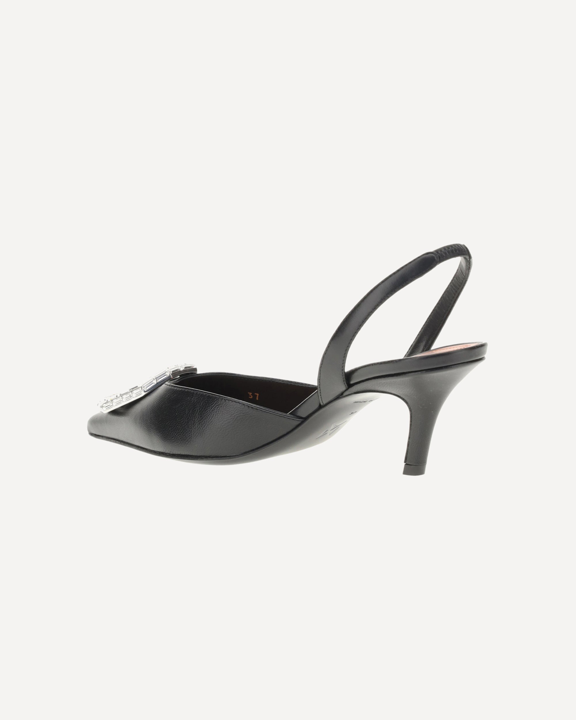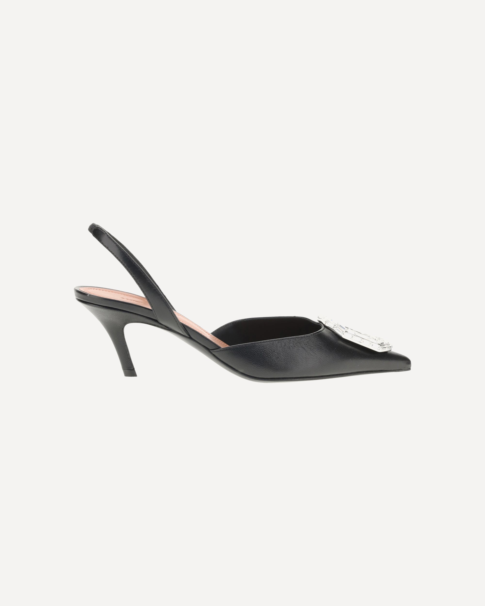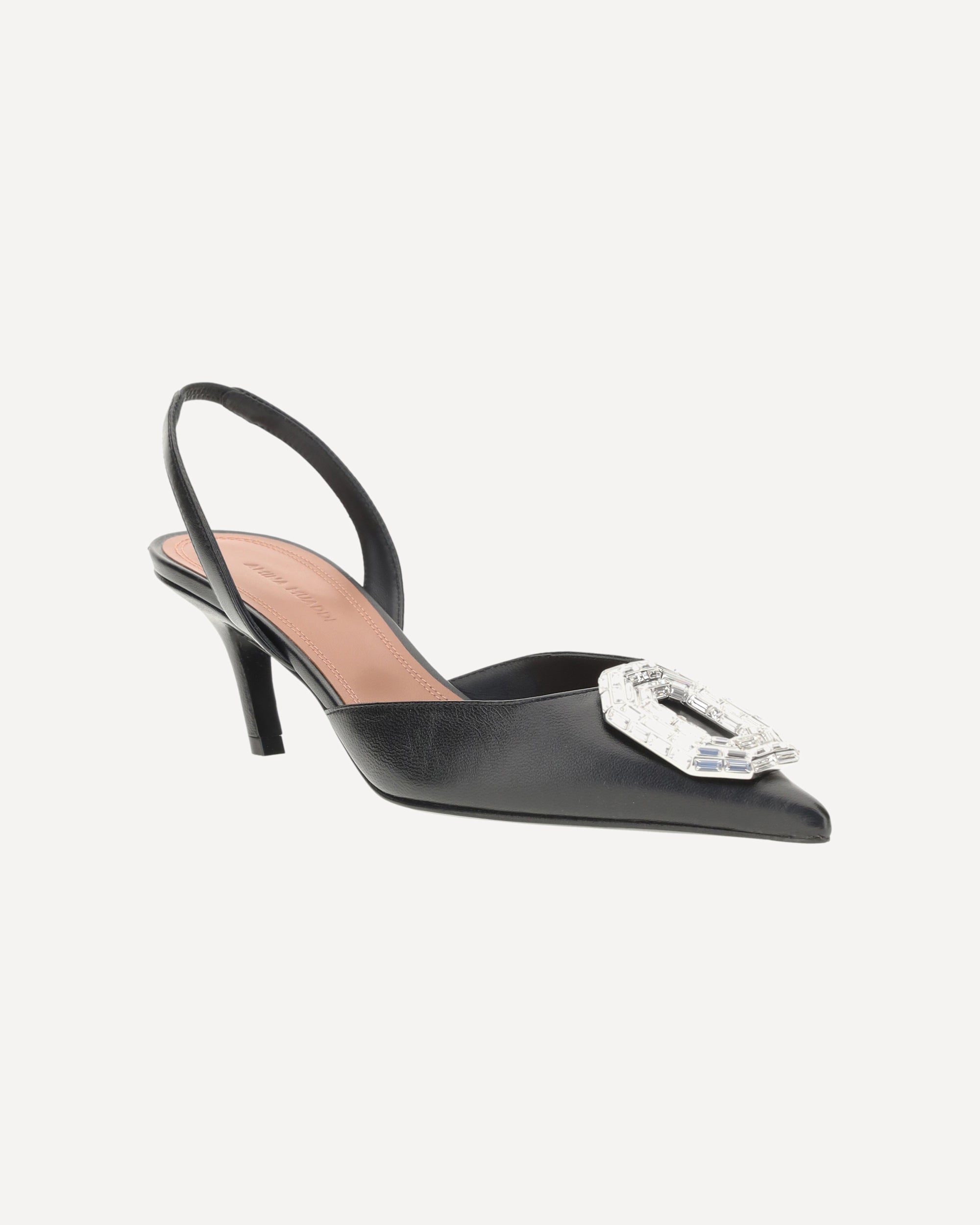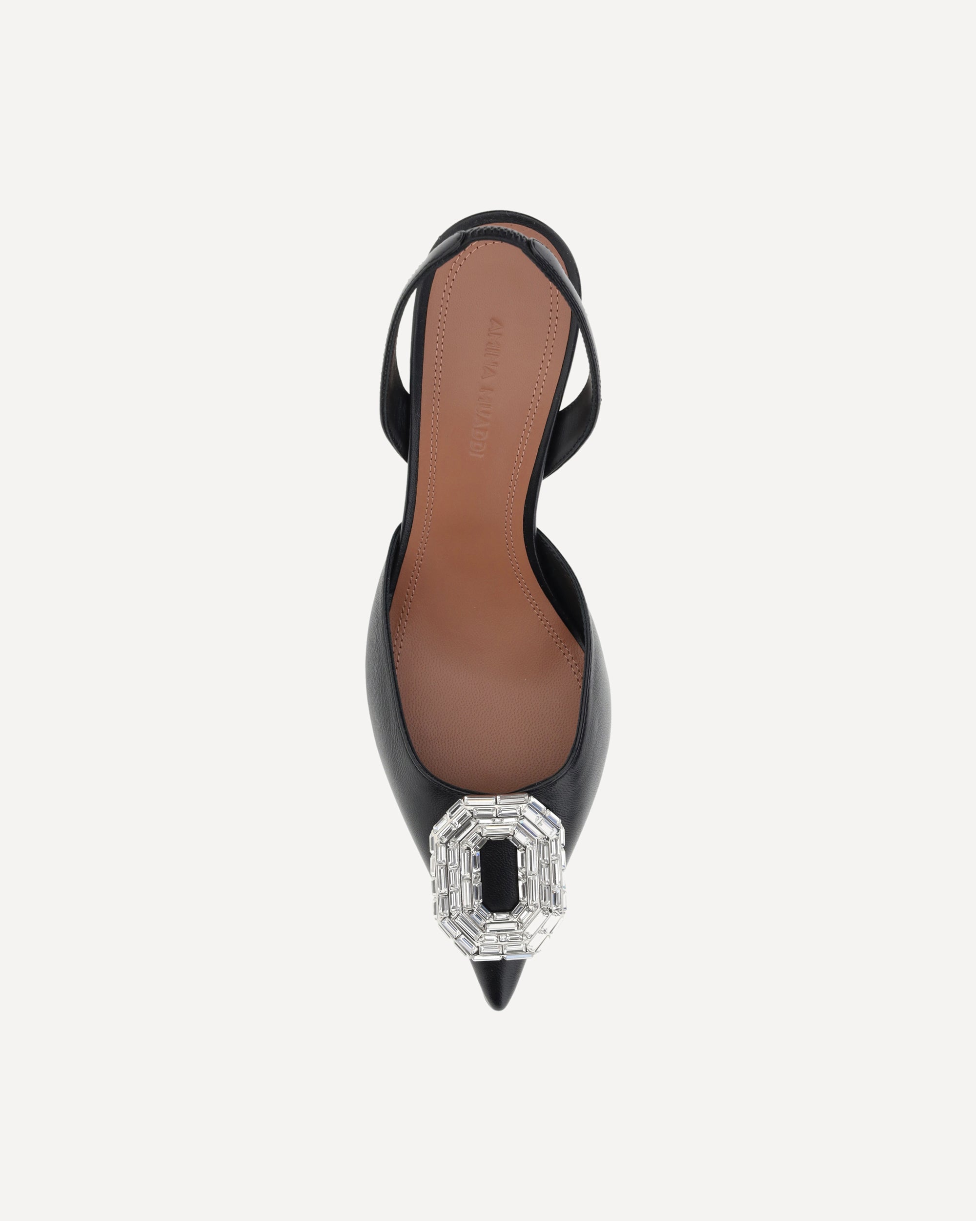 Amina Muaddi's Camelia leather slingback Pumps feature a slingback design an elongated toe embellished with a jewel-embossed rhinestone and glitter appliqué. The leather stiletto heel adds elegance, while the logo-embossed leather insole completes the design with a distinctive and refined touch.