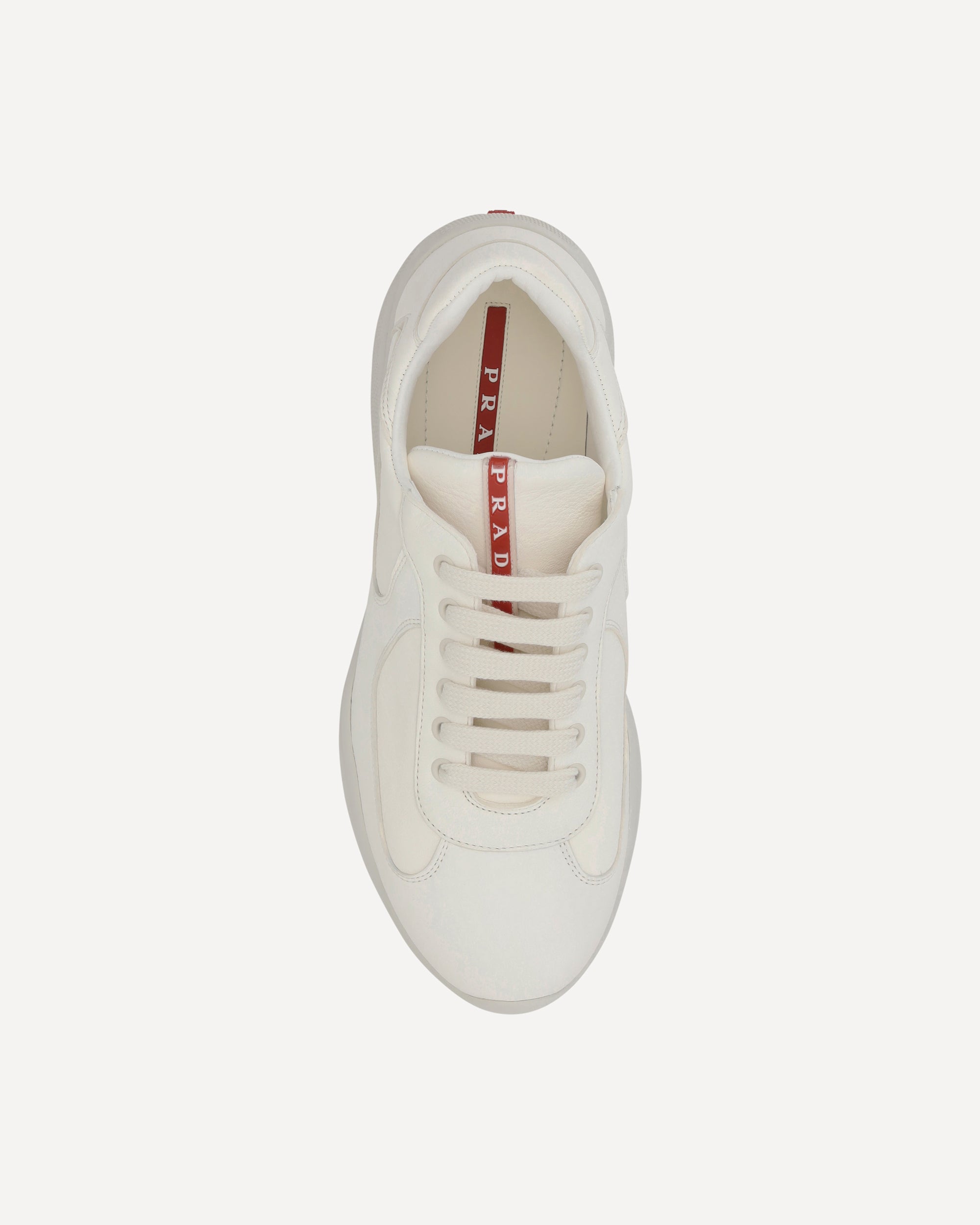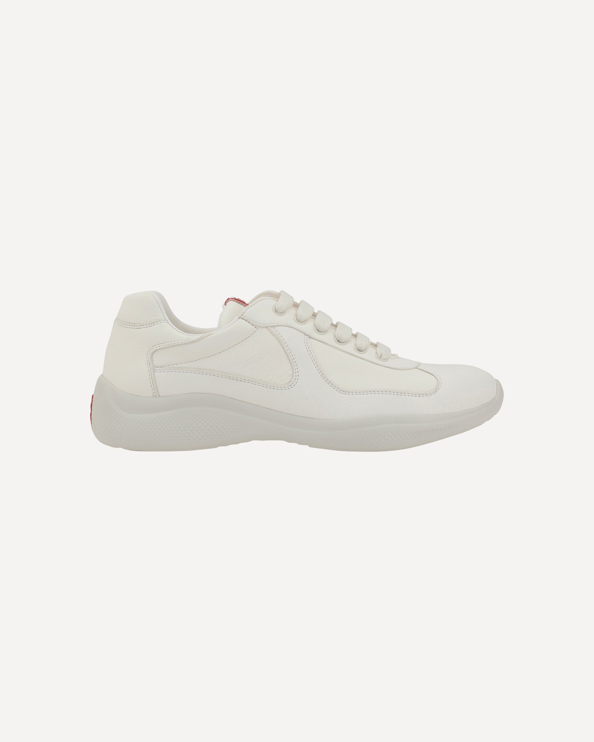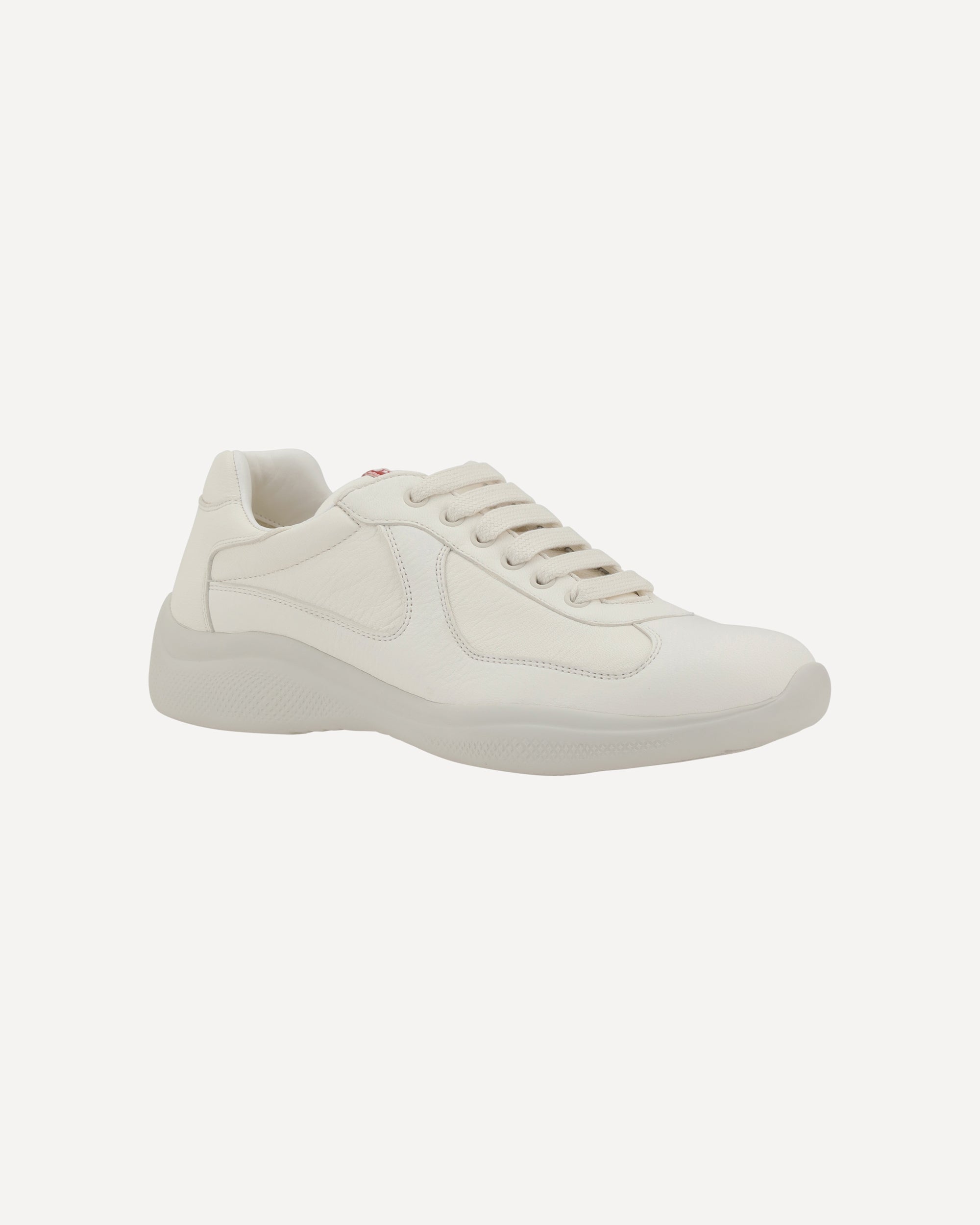 Prada's leather Sneakers feature a sleek and contemporary design, crafted from grained leather that adds a refined texture. The front lace-up closure ensures a secure fit, while the round toe ensures comfort and practicality. The textured sole offers stability and a modern look, while the iconic monogram patch applied on the tongue underscores the brand's authenticity. The branded insole adds another distinctive detail, making these sneakers a perfect balance of luxury and versatility.