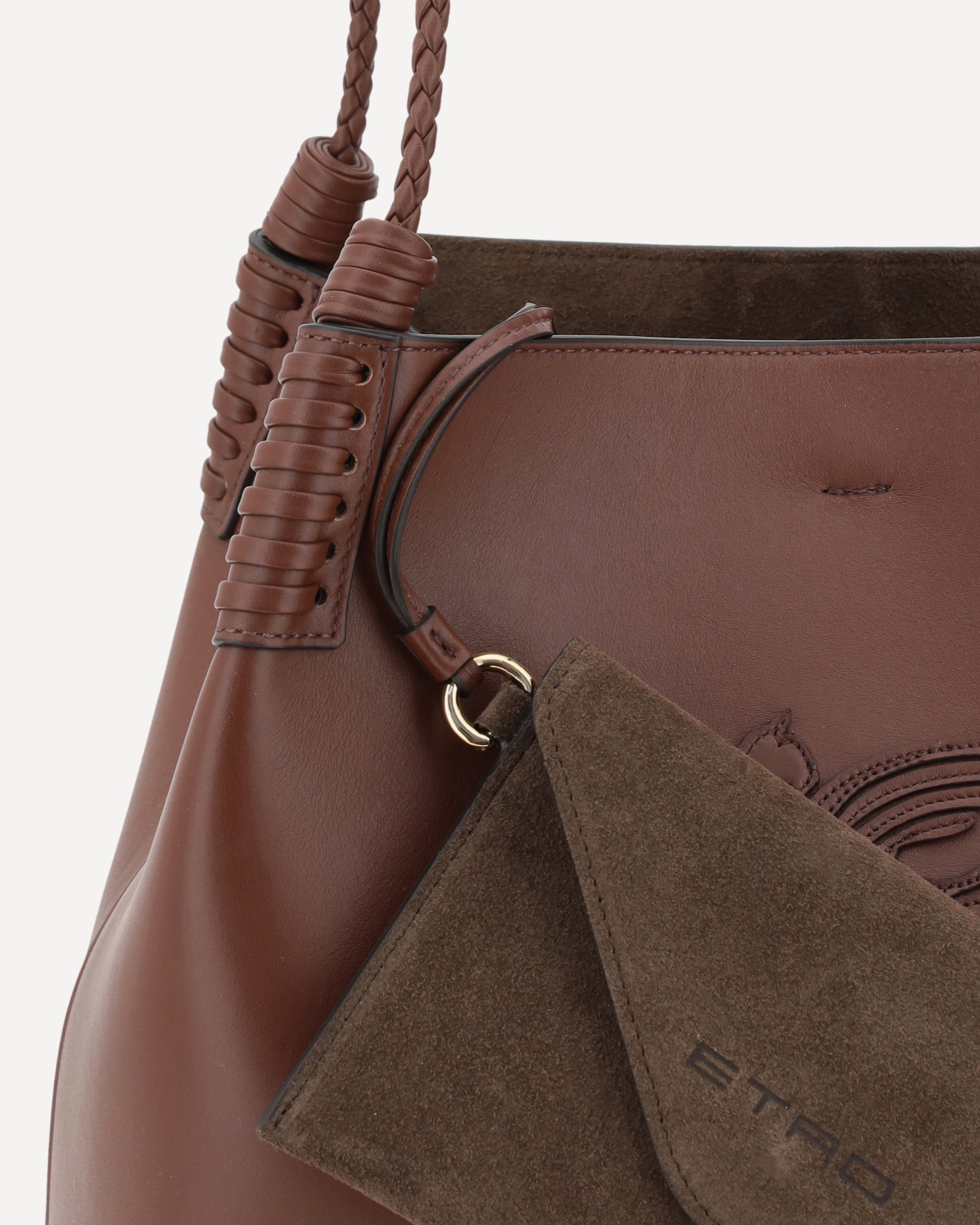 Etro's Libra leather Tote Bag is an elegant and refined accessory made of high-quality leather. It features two twisted handles at the top, adding a touch of originality and sophistication. On the front of the bag stands out the iconic Pegasus, the brand's distinctive symbol, giving it a unique and recognizable character. Inside, a single compartment houses a suede pouch, ideal for organizing personal effects with style and practicality. A design that blends elegance, functionality and the unmistakable Etro touch.
