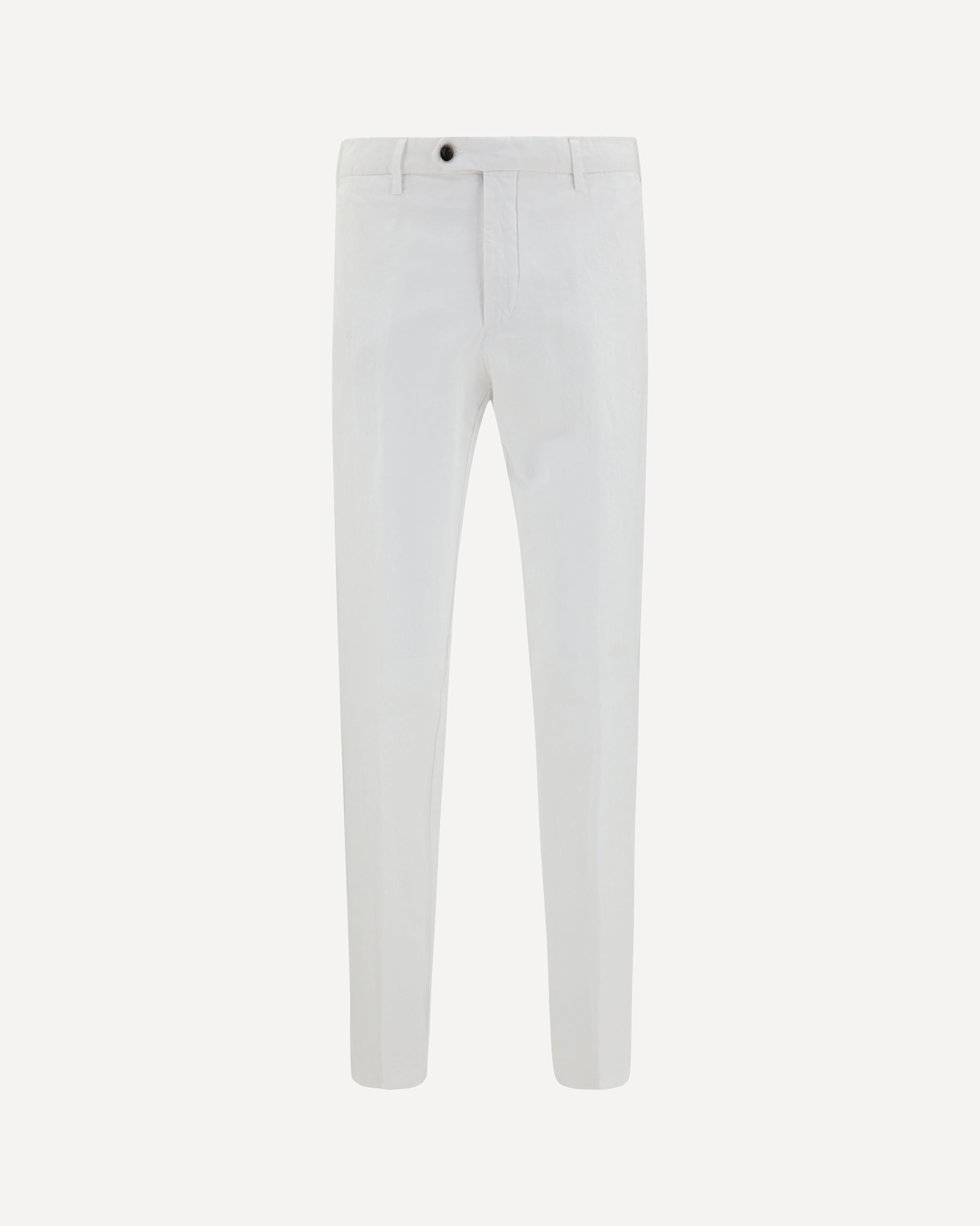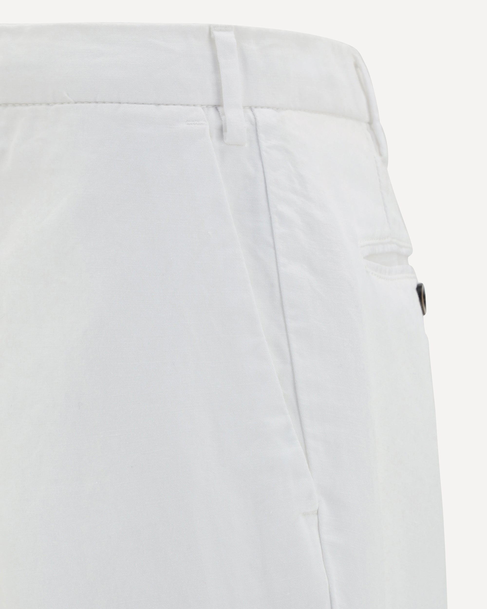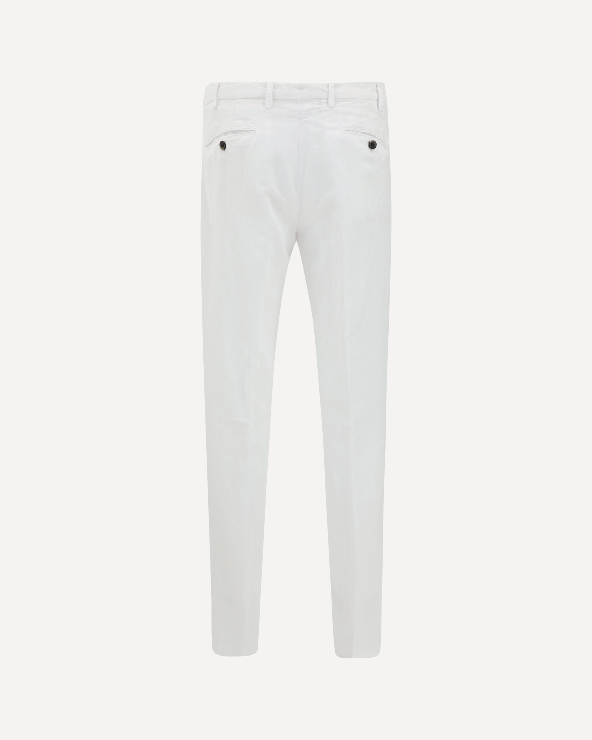 Germano's linen Pants feature a front button and zipper closure for a secure and neat fit. They have two side slash pockets, ideal for a clean, practical look, and two welt pockets on the back. The waistband has belt loops, allowing you to customize the fit. Linen lends a cool, lightweight feel, perfect for a summer or elegant yet relaxed look.