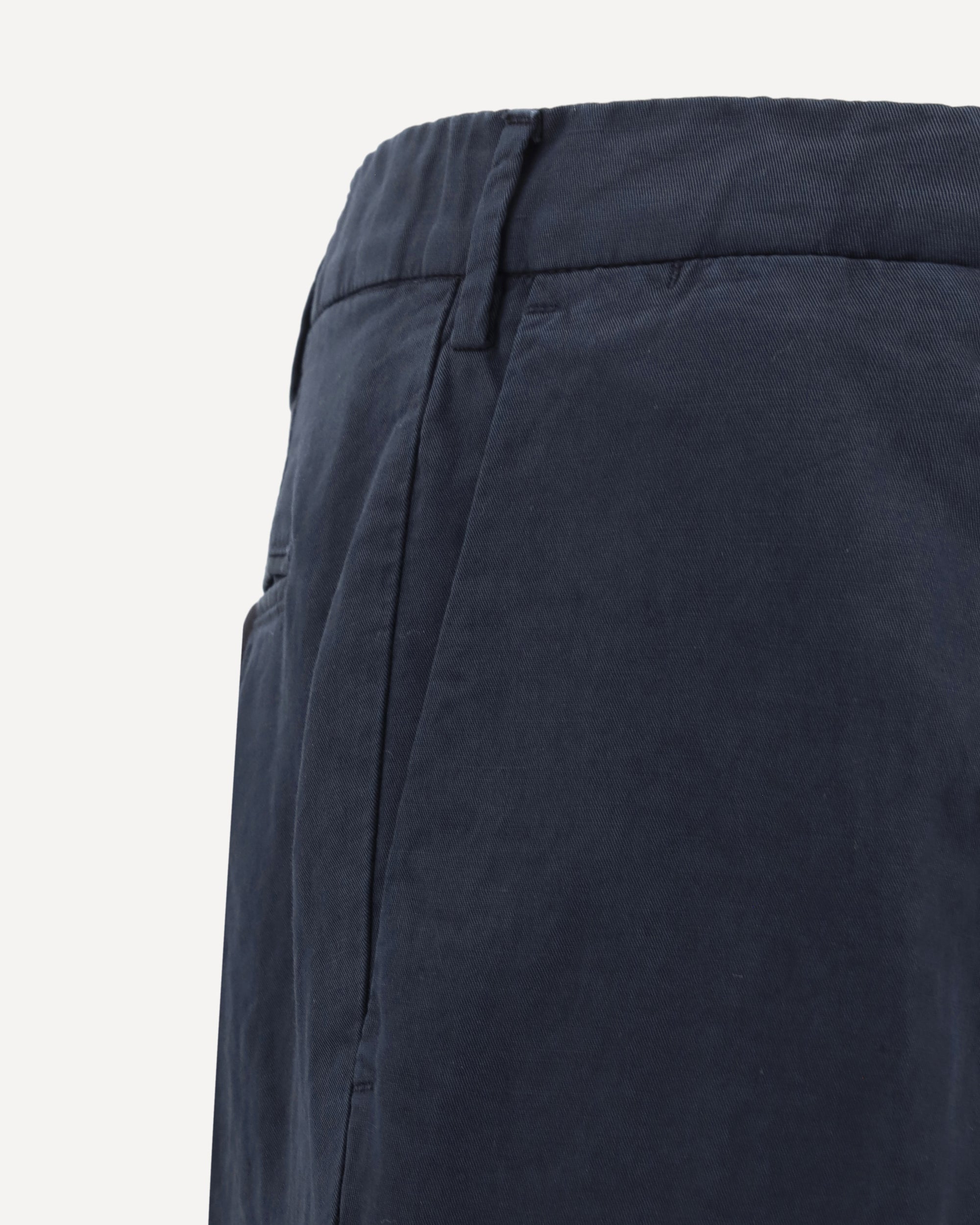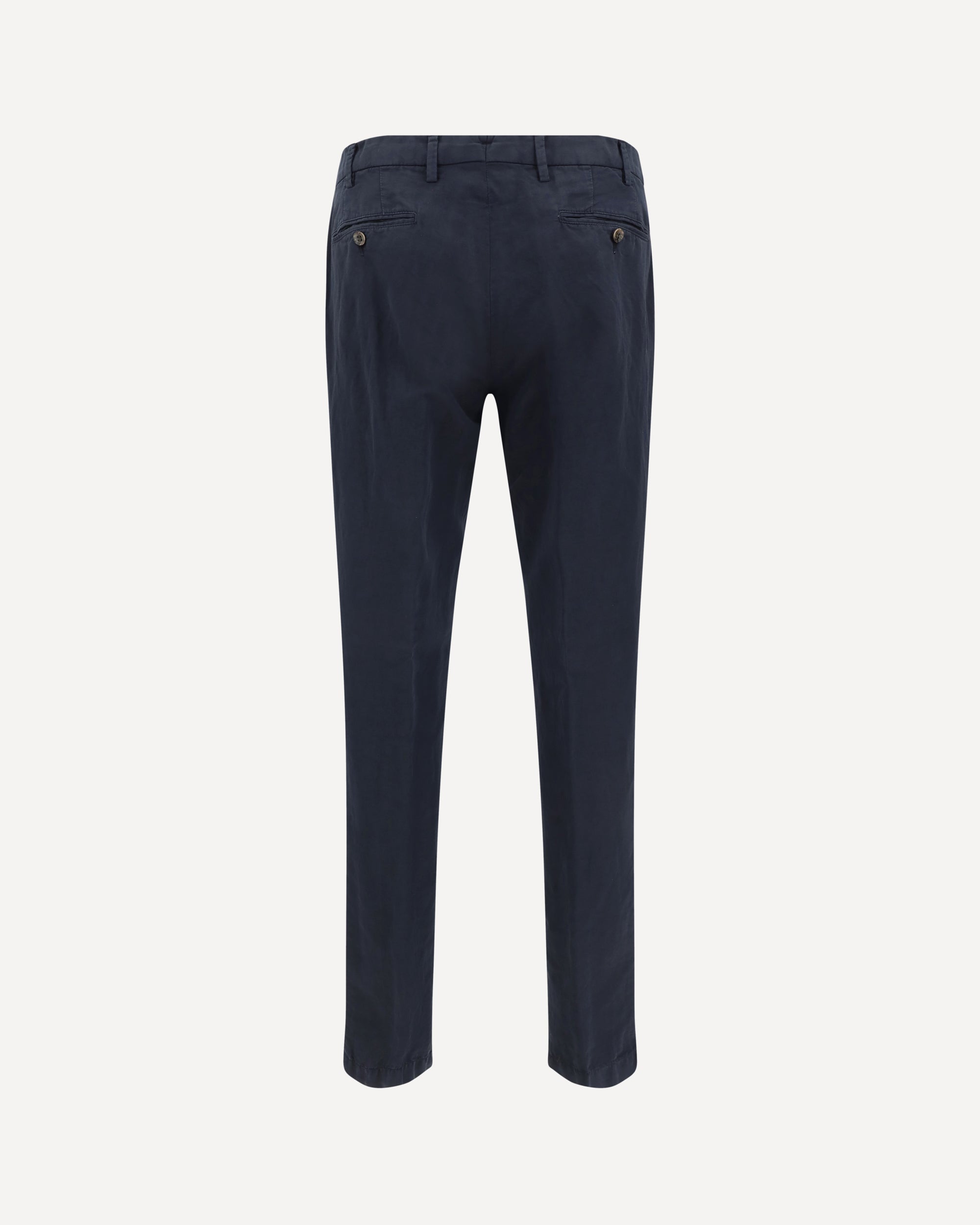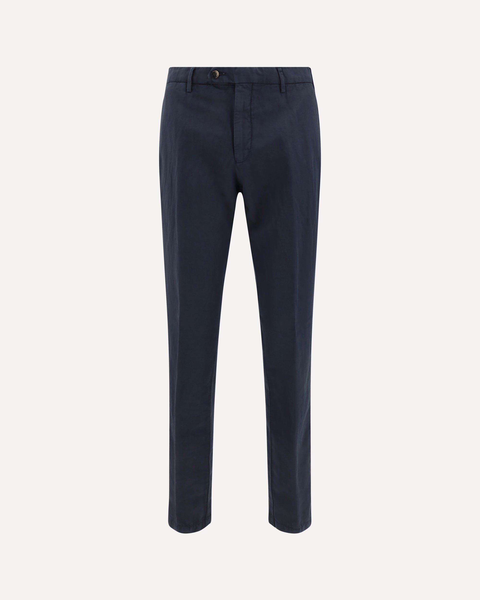 Germano's linen Pants feature a front button and zipper closure for a secure and neat fit. They have two side slash pockets, ideal for a clean, practical look, and two welt pockets on the back. The waistband has belt loops, allowing you to customize the fit. Linen lends a cool, lightweight feel, perfect for a summer or elegant yet relaxed look.