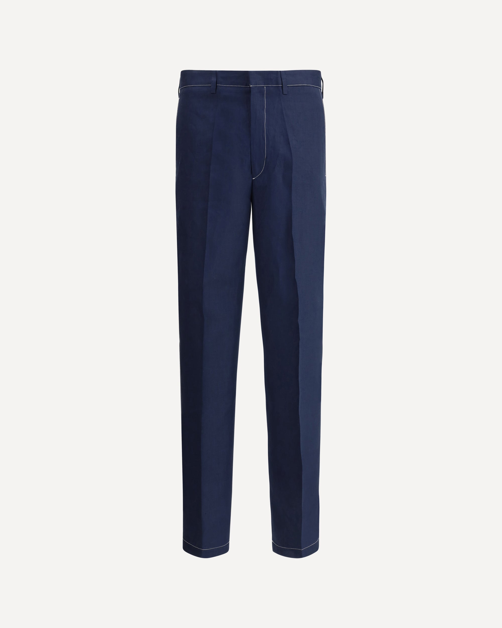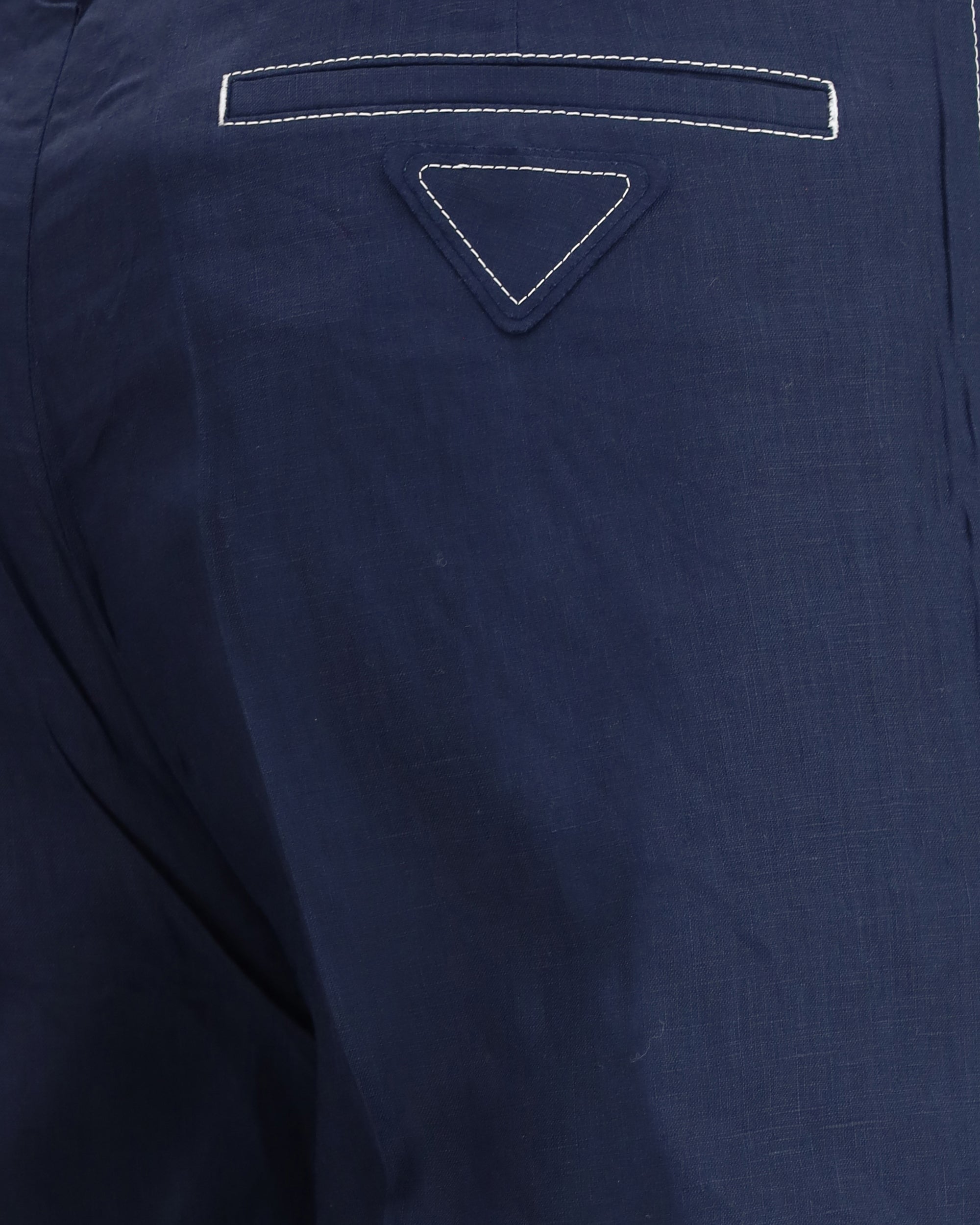 Linen Pants by Prada feature a front zipper and button closure for a secure and comfortable fit. They feature two welt pockets on the side and two slit pockets on the back, with an iconic triangular patch applied, the brand's signature symbol. Belt loops on the waistband allow you to add a personal touch with a belt. Contrast stitching adds a refined, modern detail, making these pants a stylish and versatile addition to your wardrobe.