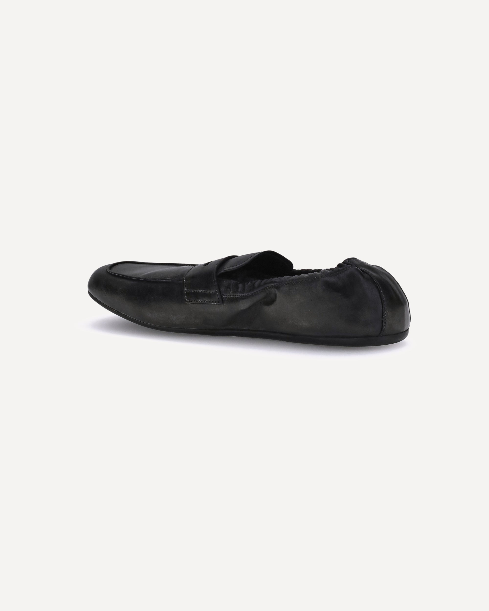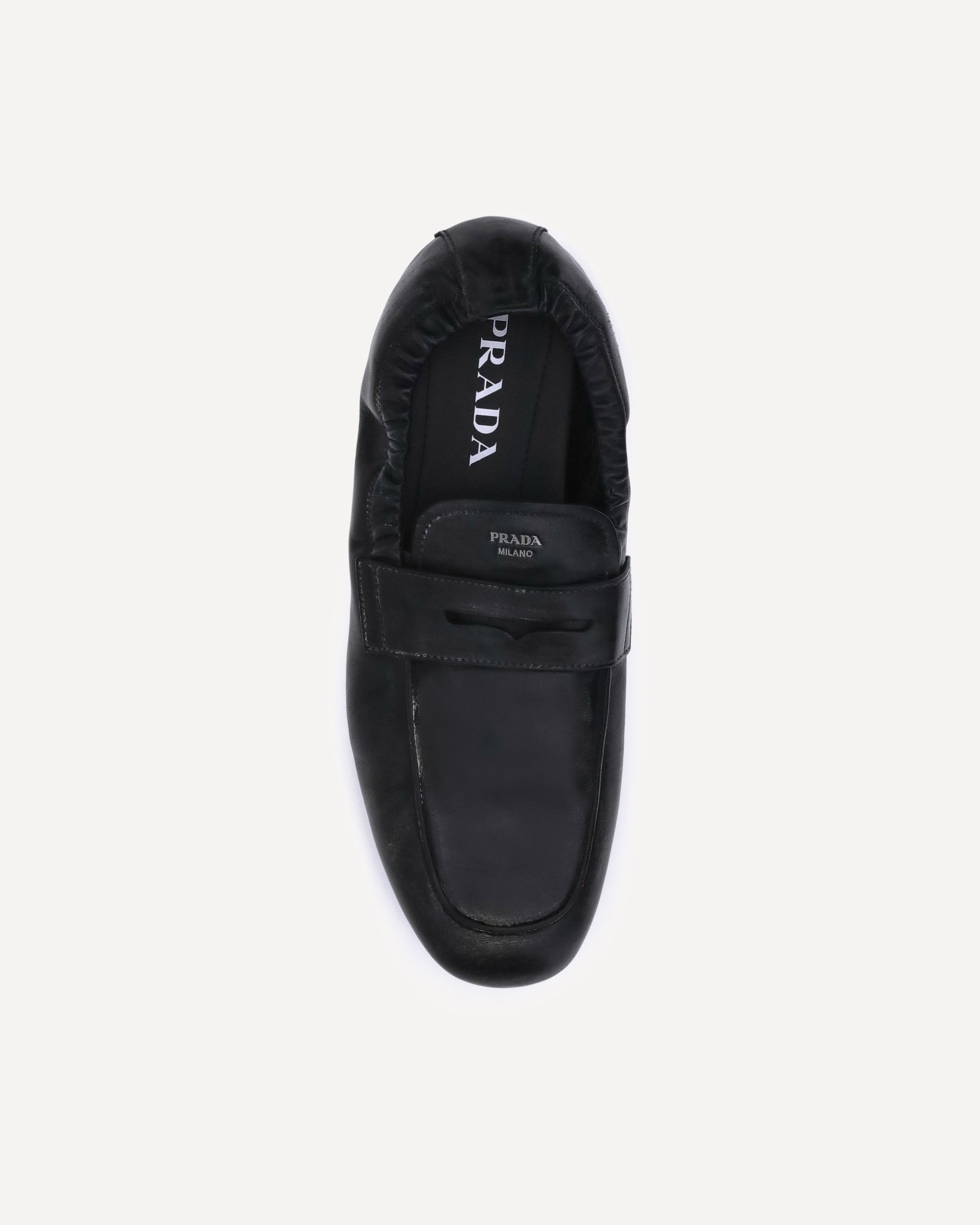 Prada's antiqued leather Shuffle Loafers represent an innovative reinterpretation of the classic loafer, with a completely deconstructed design. Featuring a lightweight, soft and flexible silhouette, they offer superior comfort without sacrificing style. Made of worked leather for a worn effect, these loafers with essential lines are embellished with the refined Prada lettering logo, a symbol of contemporary elegance. Ideal for those seeking luxury loafers with a modern and distinctive design.