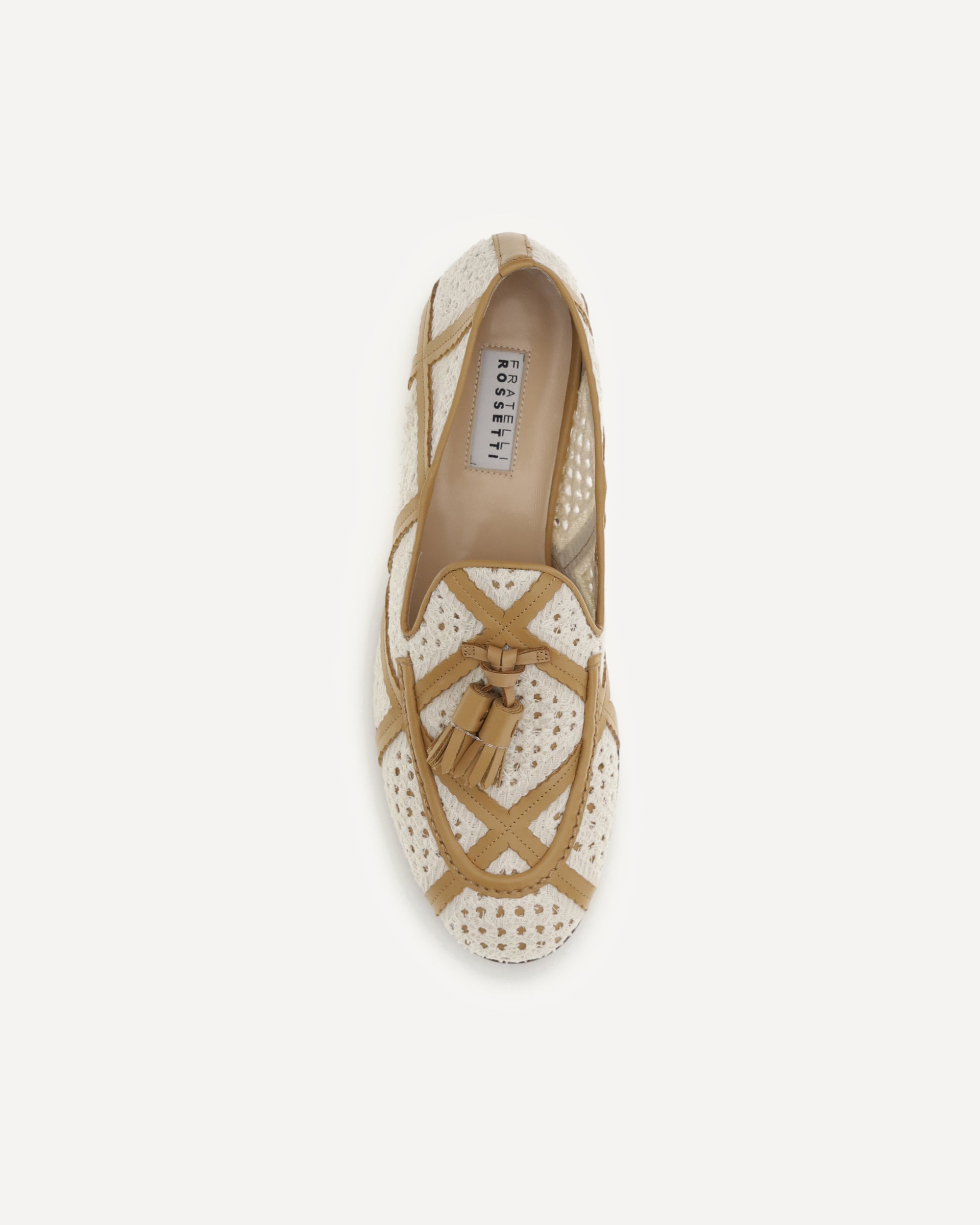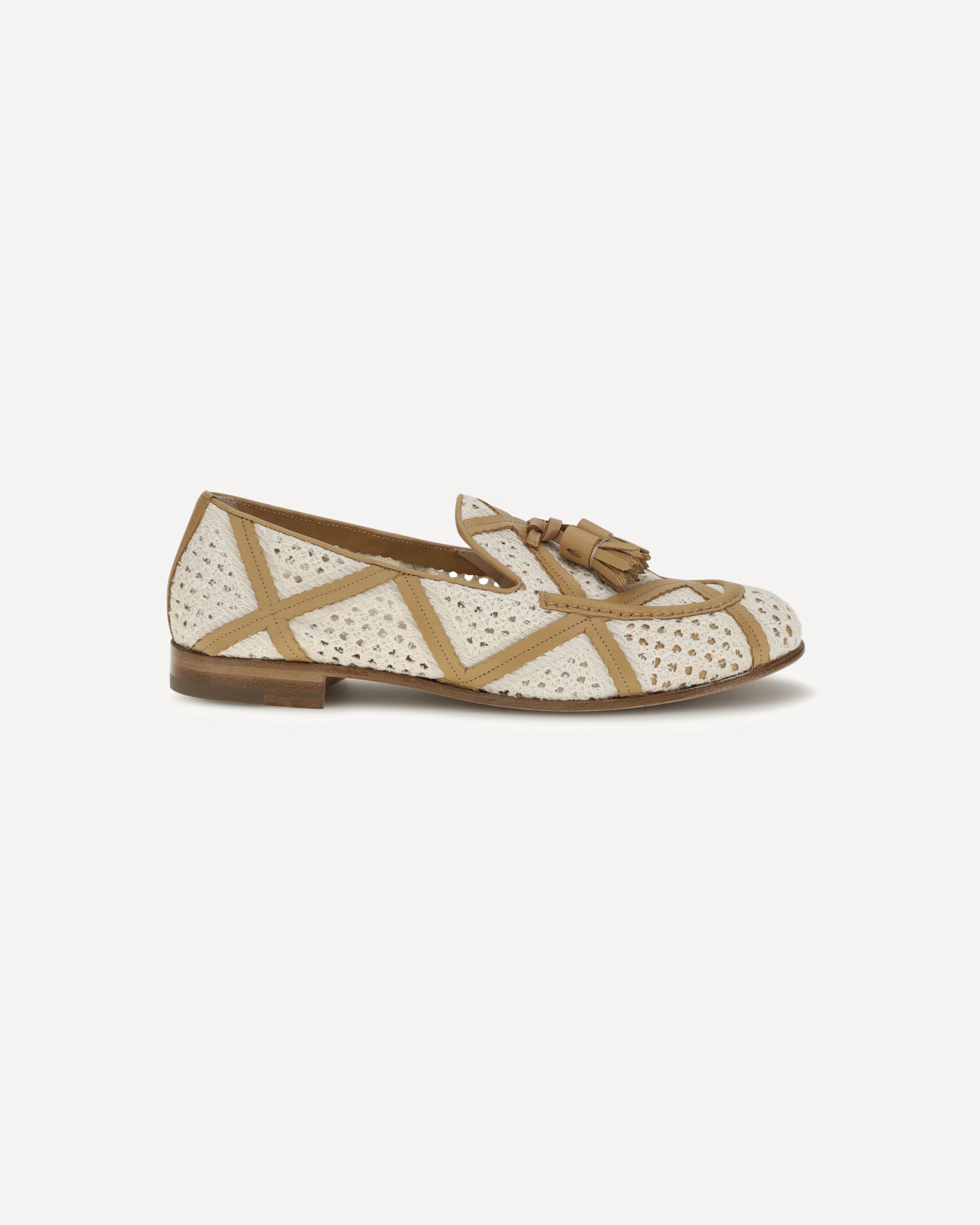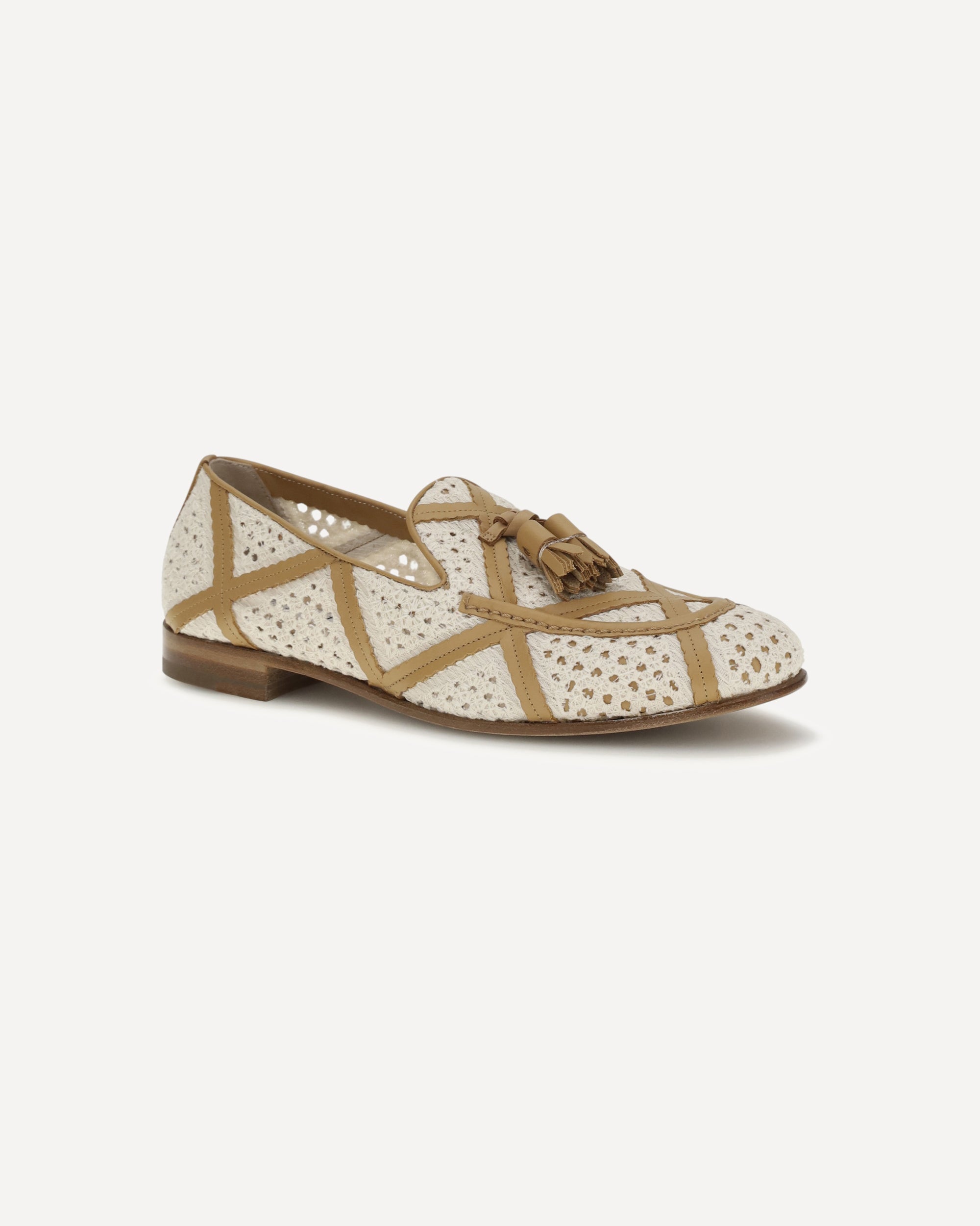 The Brera fabric and leather Loafers by Fratelli Rossetti reinterpret the classic style with a sophisticated, summery twist, featuring linen fabric with a macramé lace effect that lends a romantic and feminine elegance. The latticework of leather strips enhances the design, and the leather sole completes the shoe, offering comfort and refined style for any occasion.