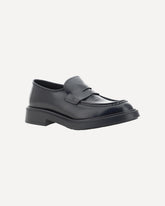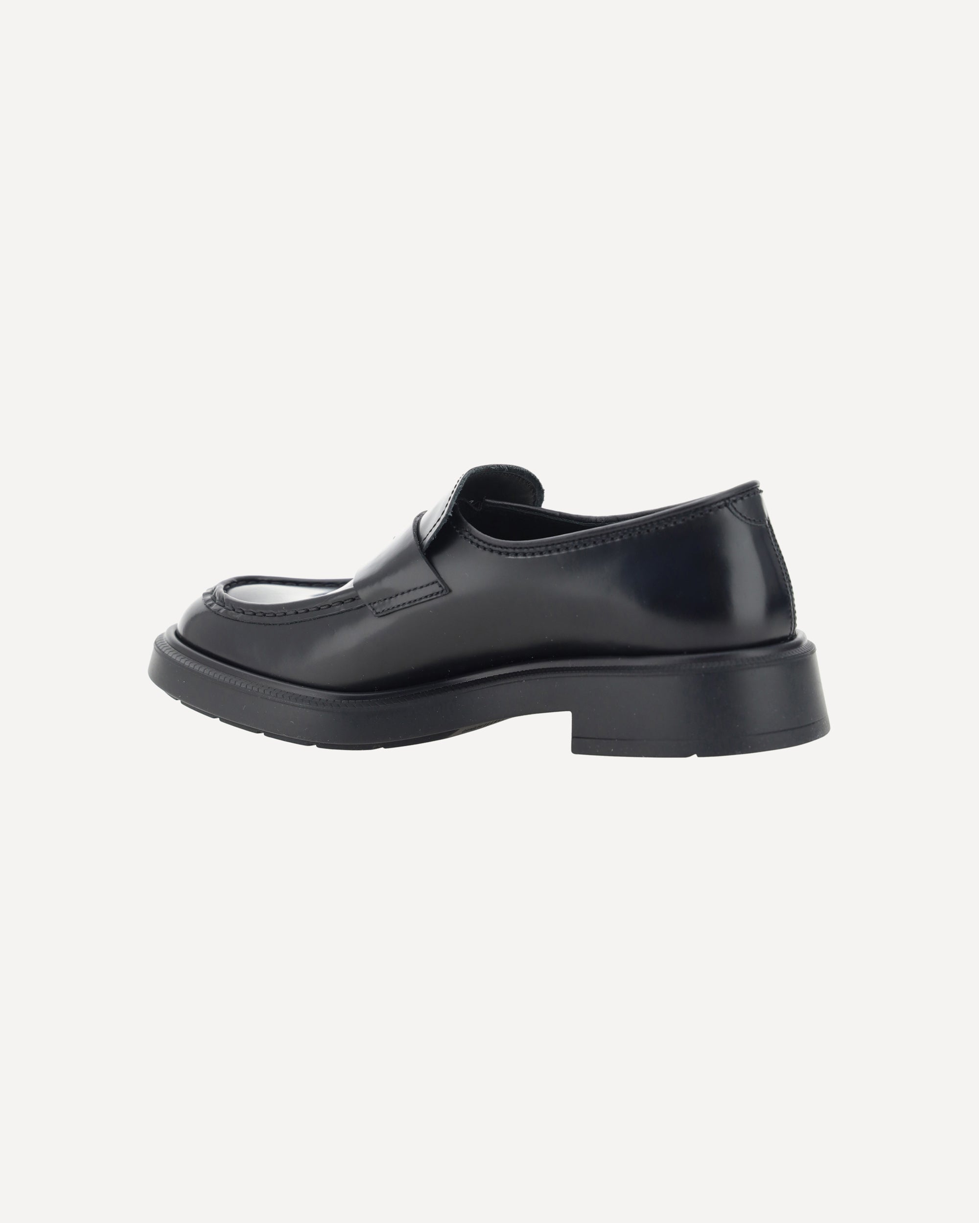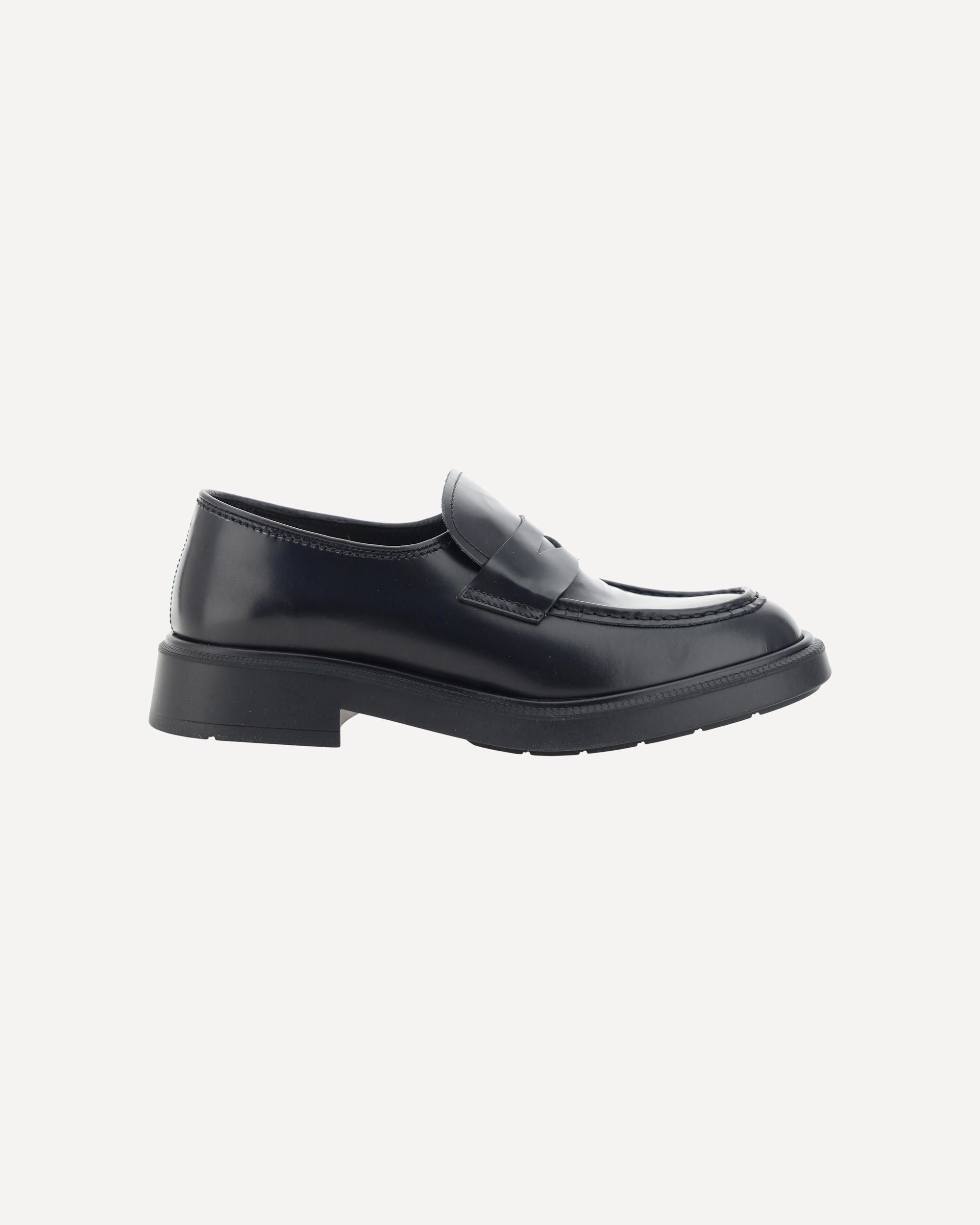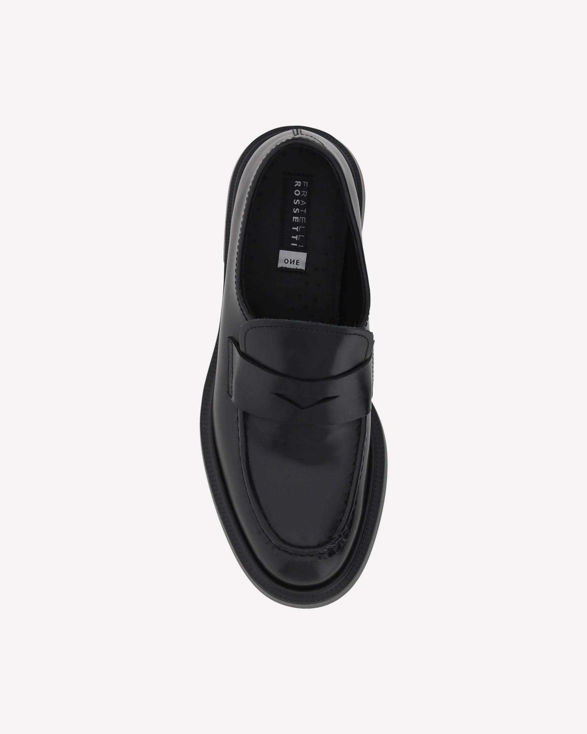 Calfskin Loafers by Fratelli Rossetti, slightly elongated round toe, rubber block heel, front tray made of leather, press-stamped logo insole, smooth leather design.