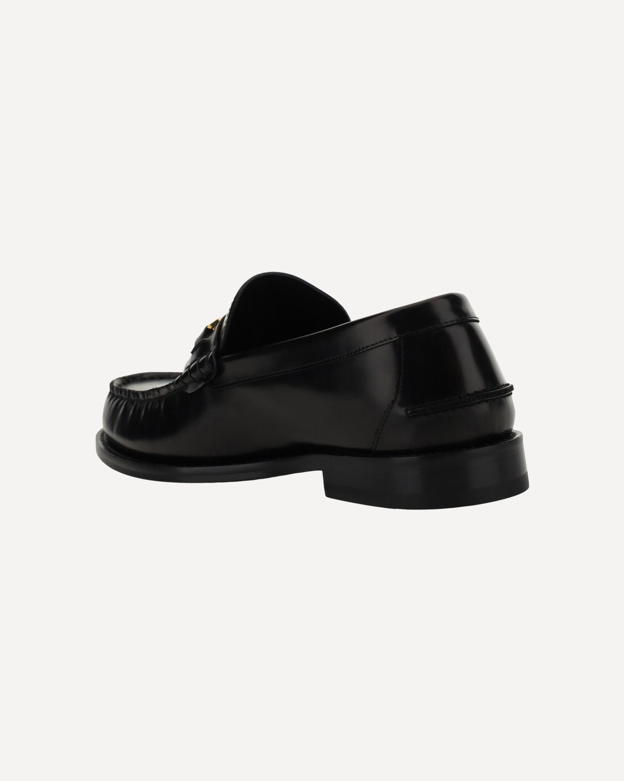 The leather Loafers by Versace combine classic elegance with iconic details. Featuring a slightly elongated round toe and a leather block heel, they feature a front tray embellished with a plaque featuring the iconic Medusa head, the house's distinctive symbol. The logo-embossed insole completes the design, ensuring comfort and unmistakable style.
