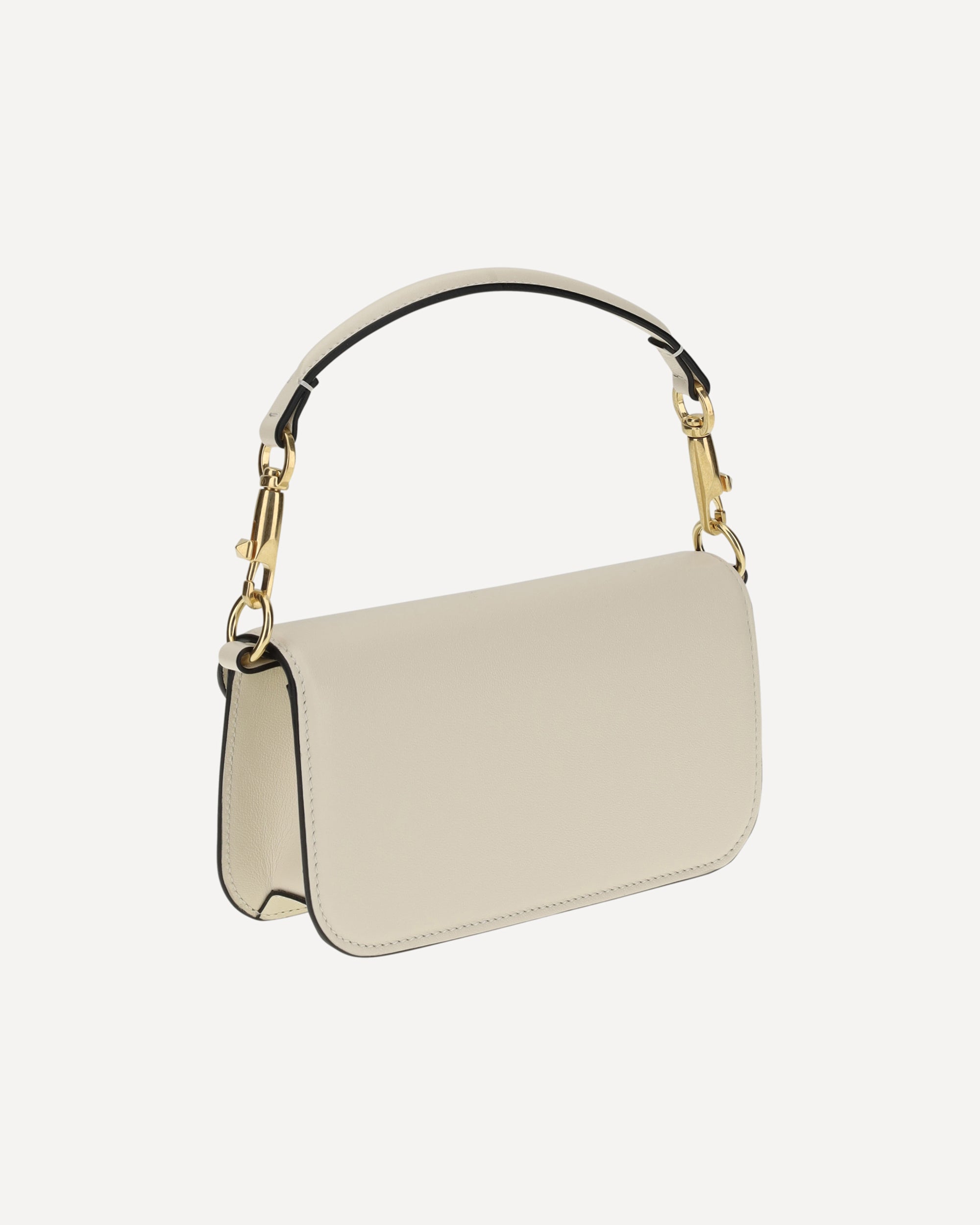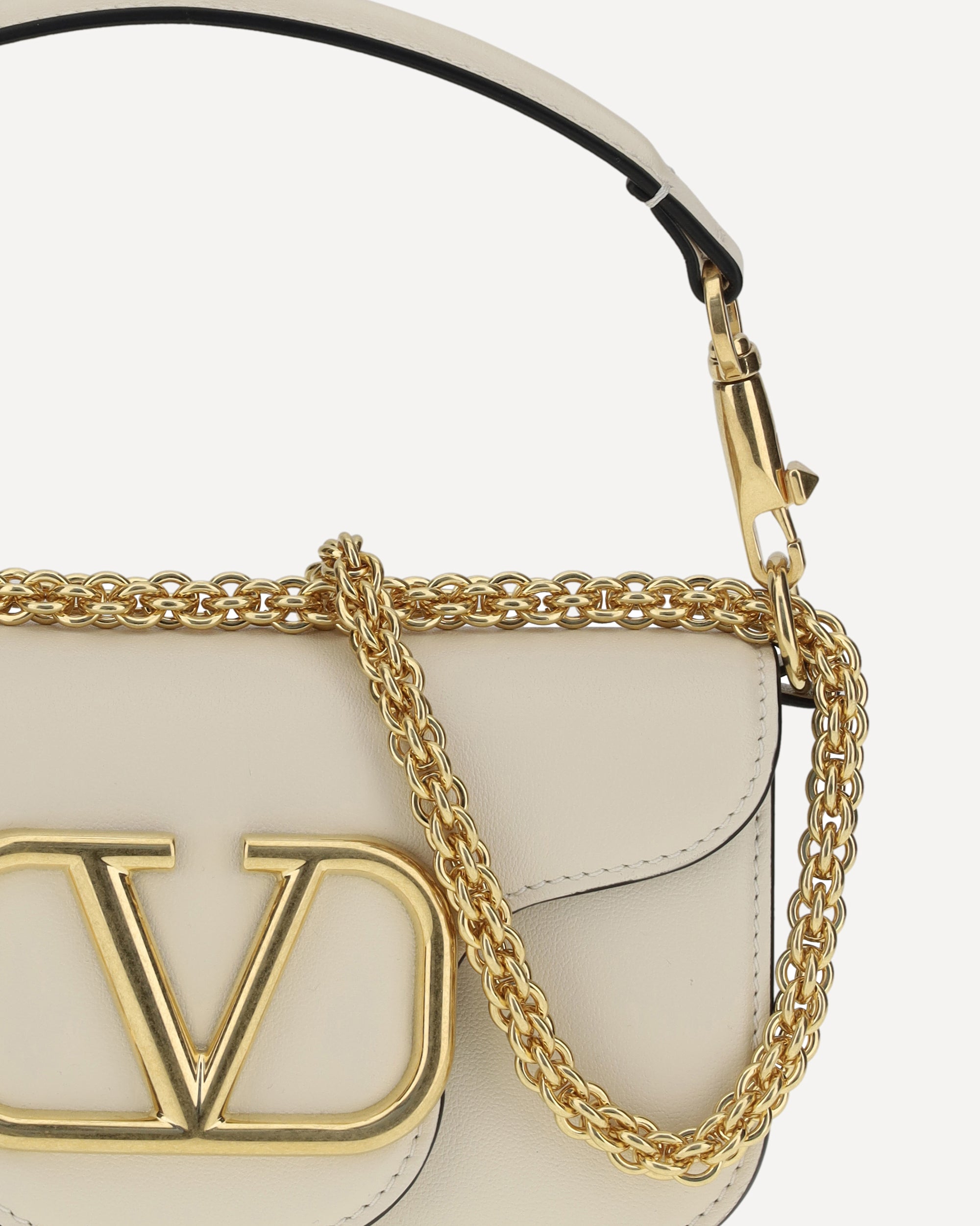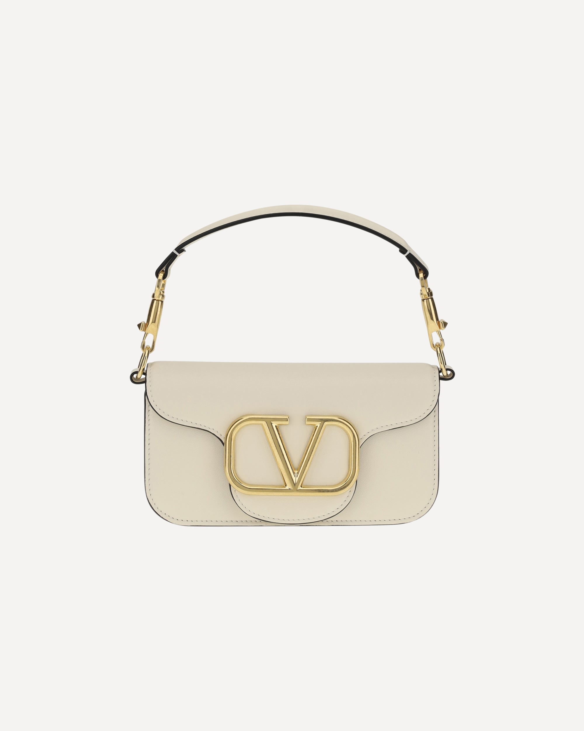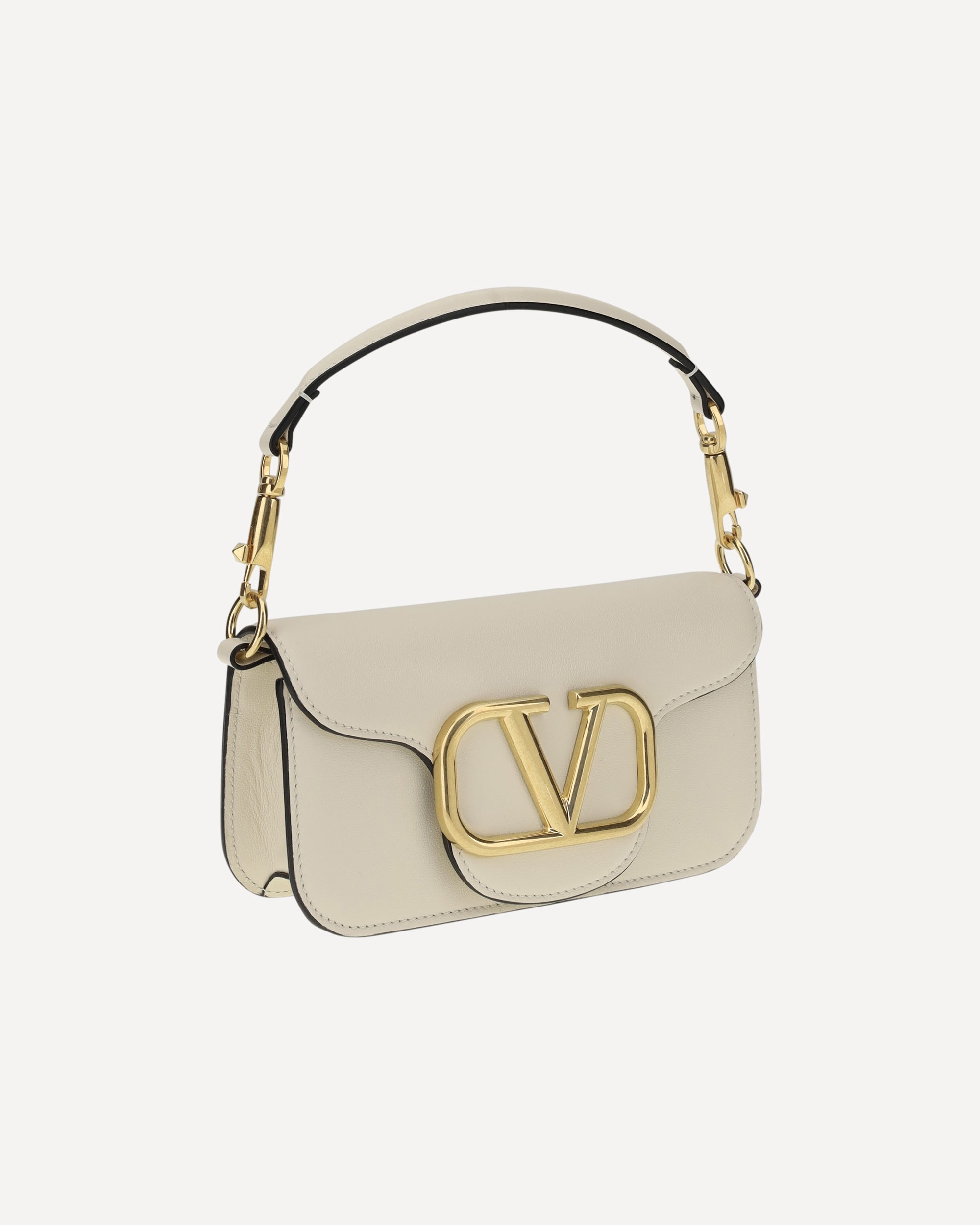 Valentino Garavani's Locò Leather Shoulder Bag is an elegant and versatile accessory. It has a removable top handle via two snap hooks, a front magnetic flap closure and a three-dimensional plaque with the iconic embossed VLogo, plated in antiqued brass. The chain shoulder strap is removable, while the interior offers a single compartment and a slit pocket. The rigid design and quality materials make it a must-have of luxury and style.
