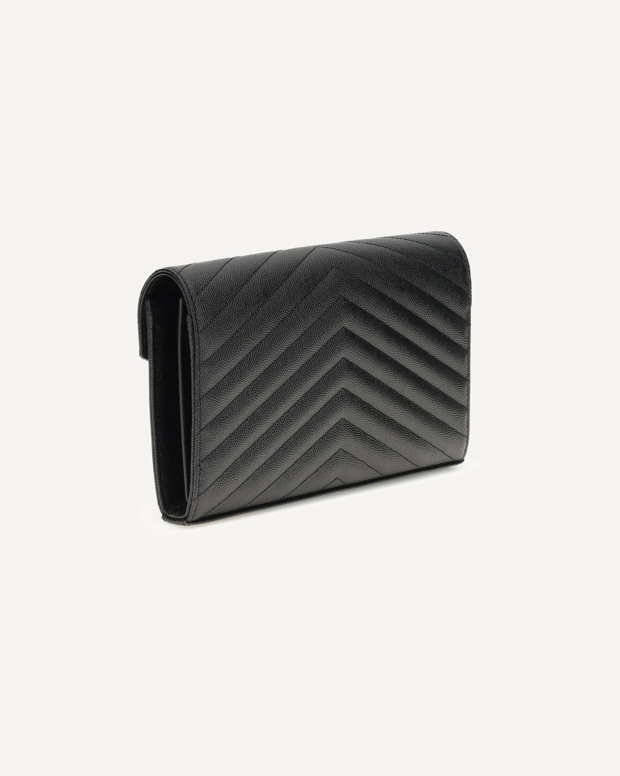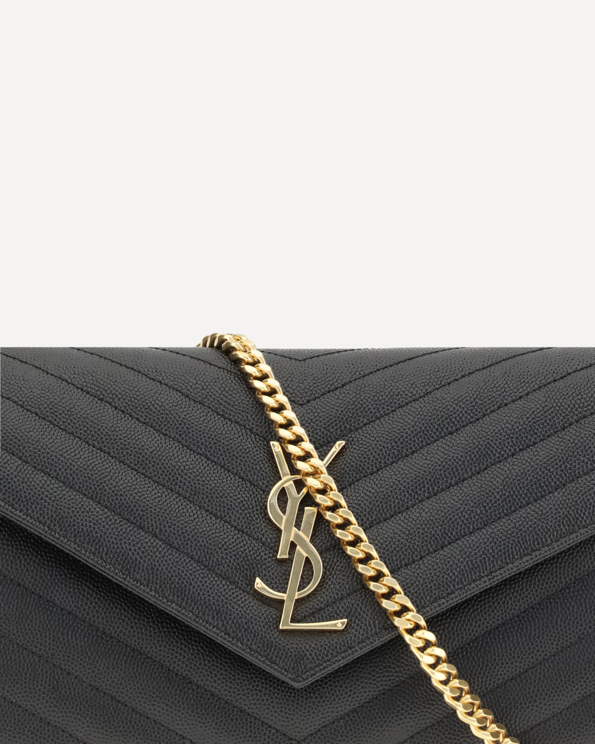 The Monogram leather Shoulder Bag by Saint Laurent features a front snap-button closure for convenience and security. The leather design is enhanced by the matelassé print, which adds a sleek and sophisticated texture. Inside, it features card slots, a central zippered pocket and visible brand logo. On the front, there is a plaque with the iconic golden logo. The golden chain shoulder strap with leather handle lends a touch of luxury, making this bag ideal for any elegant occasion.