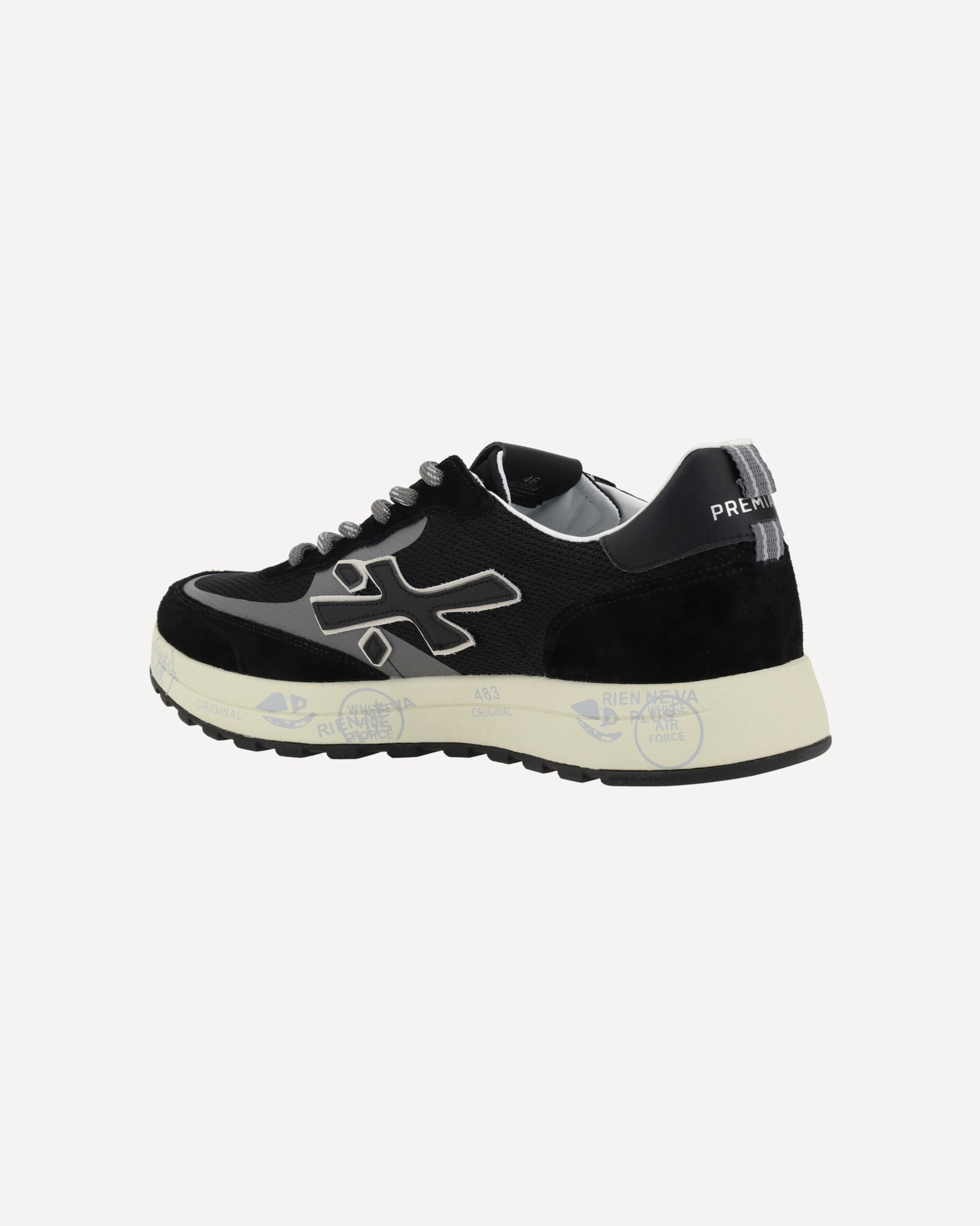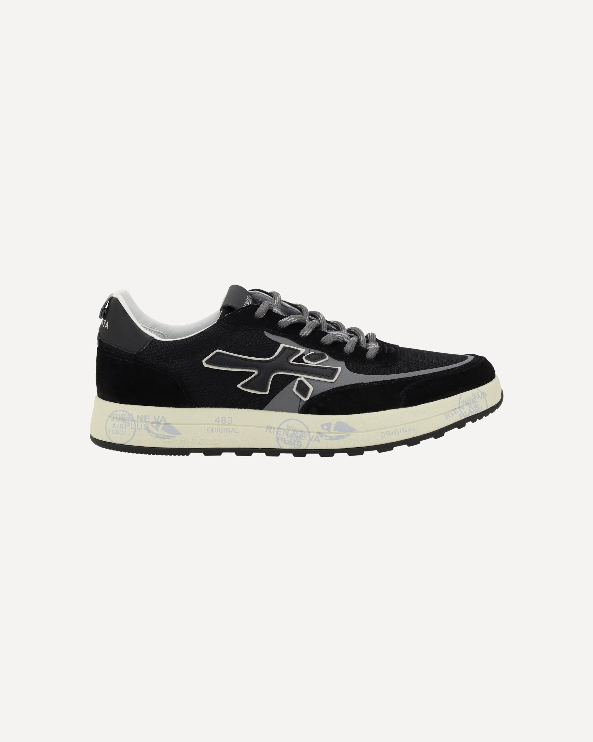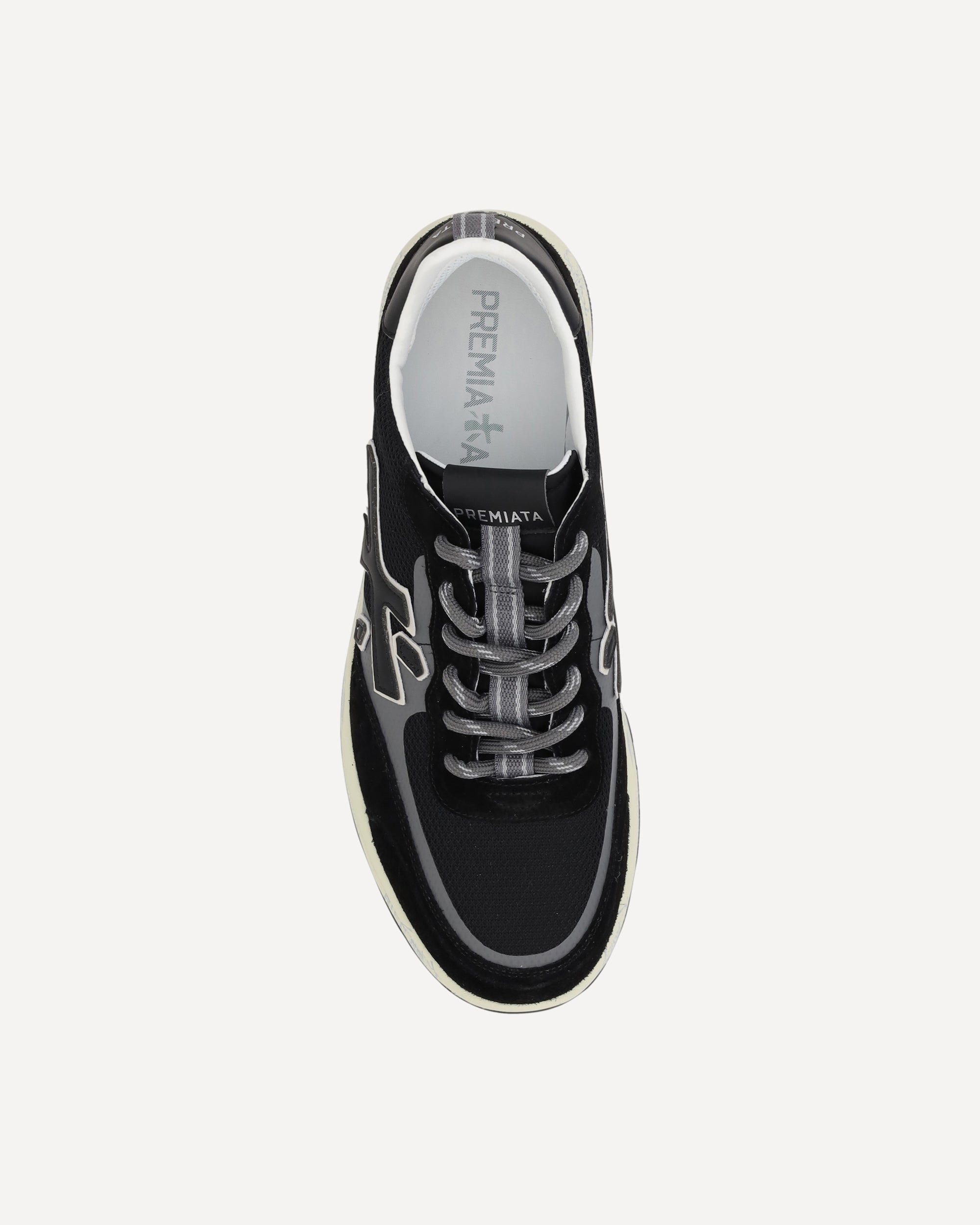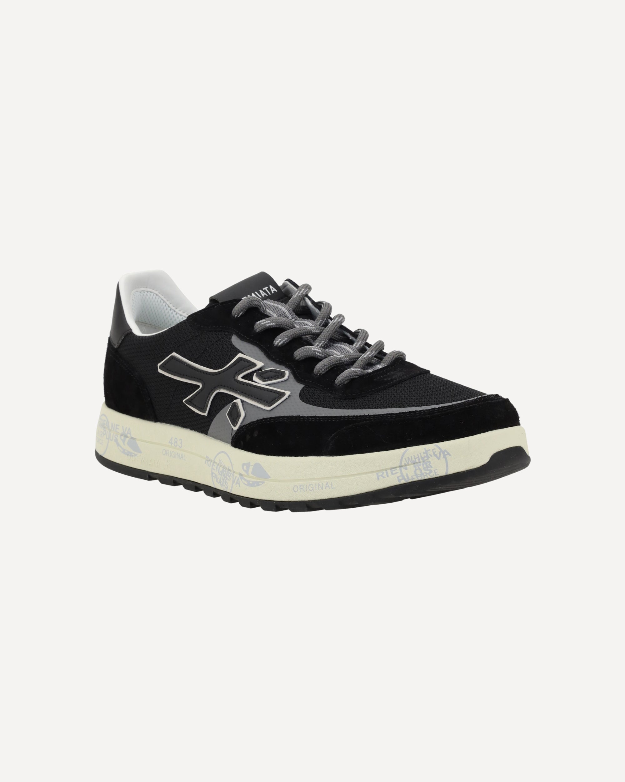 Premiata's Sneakers feature an elongated toe, giving them a sleek, modern look. The lace-up front closure ensures a personalized and secure fit. Suede details add a touch of sophistication, while the iconic leather logo appliqué on the side panels lends a distinctive sign of luxury and authenticity. The logo-textured outsole offers support and comfort, while the logo-textured insole completes the design, highlighting the brand's signature attention to detail.