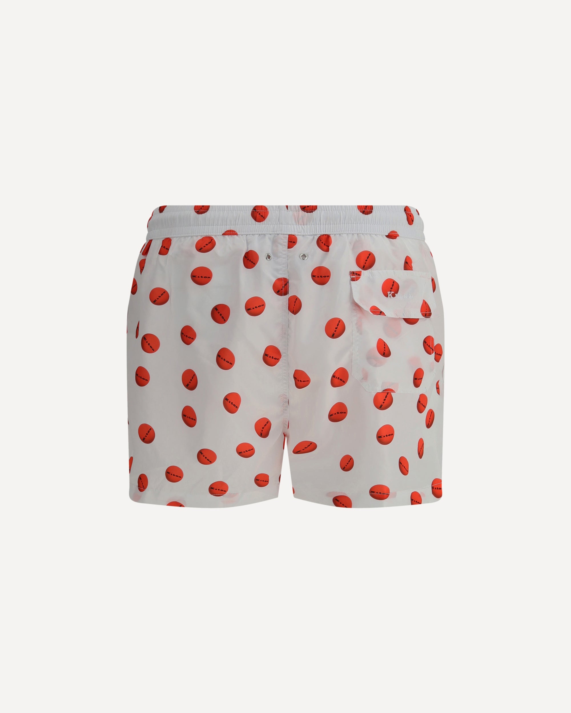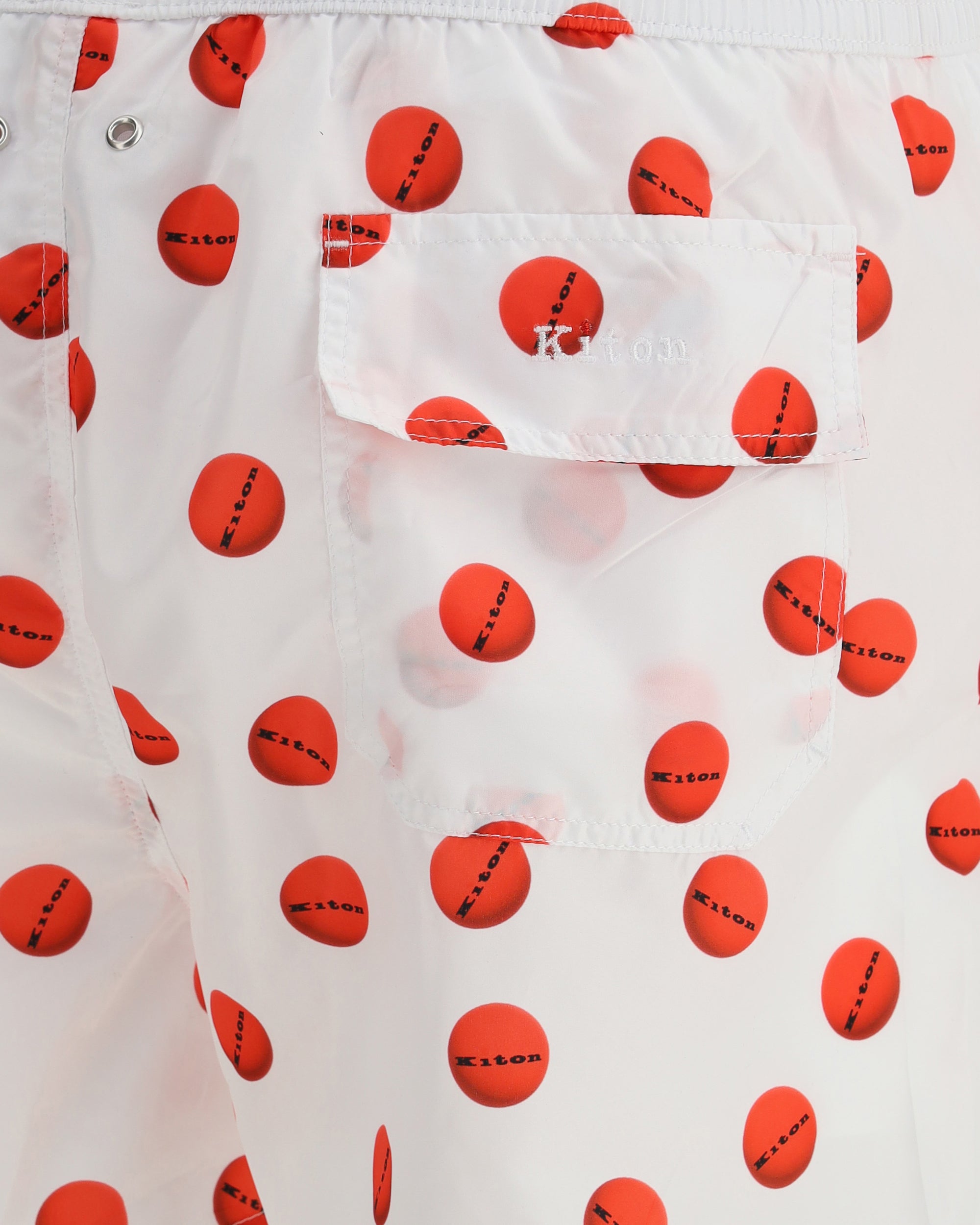 Kiton's Swimshorts is an elegant and refined garment that combines style and practicality. The adjustable elastic waistband with drawstring allows for a customized fit, while side welt pockets provide space for small items. The back flap patch pocket and front flap pocket add a touch of functionality and design while maintaining a clean, sophisticated aesthetic. Contrasting all-over logoed spheres make the suit distinctive and instantly recognizable, lending a touch of luxury to even a casual garment.