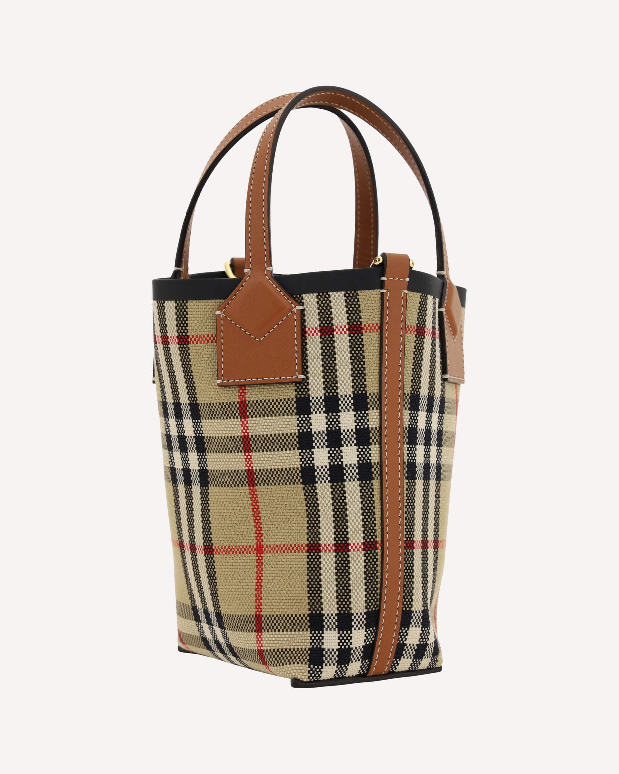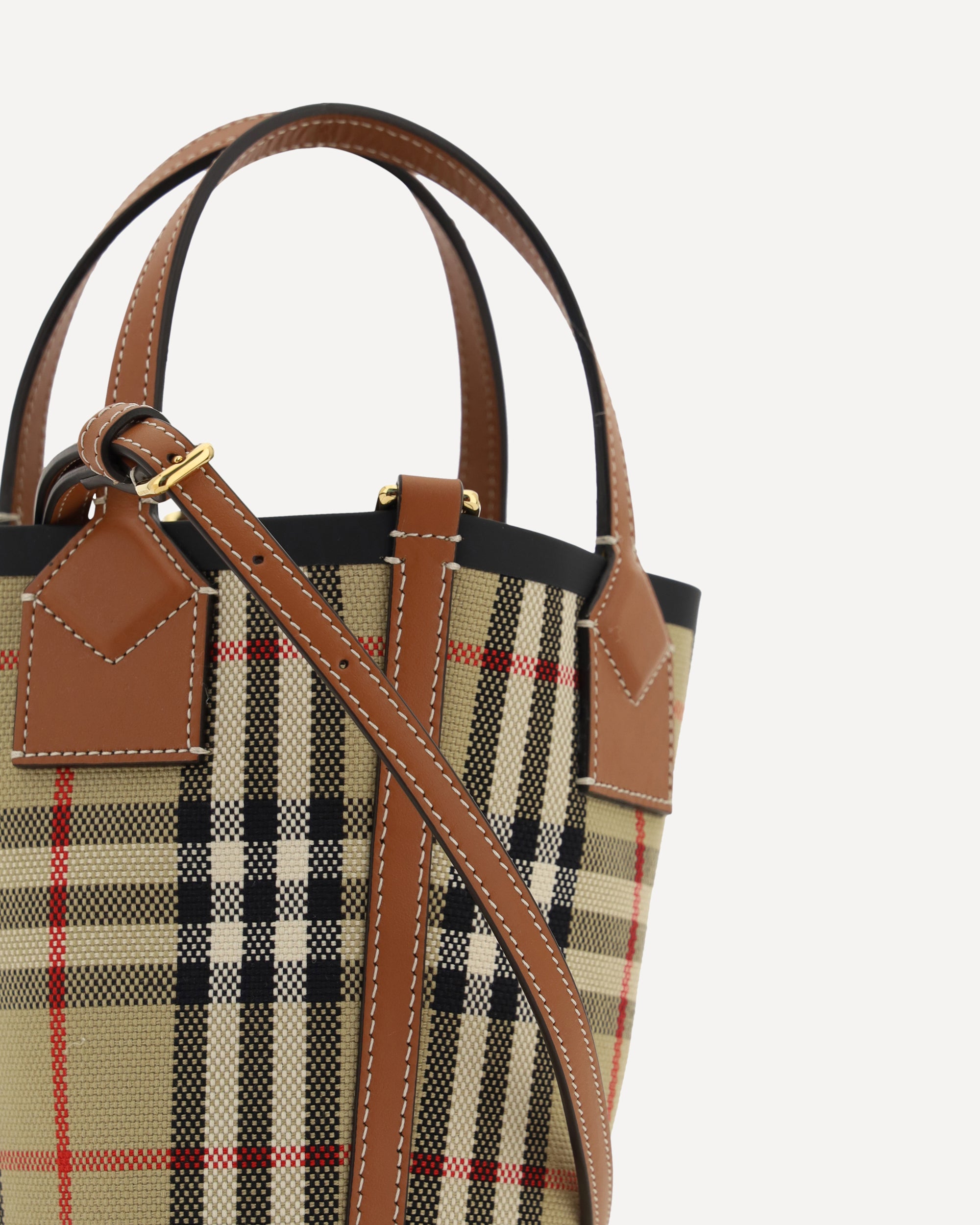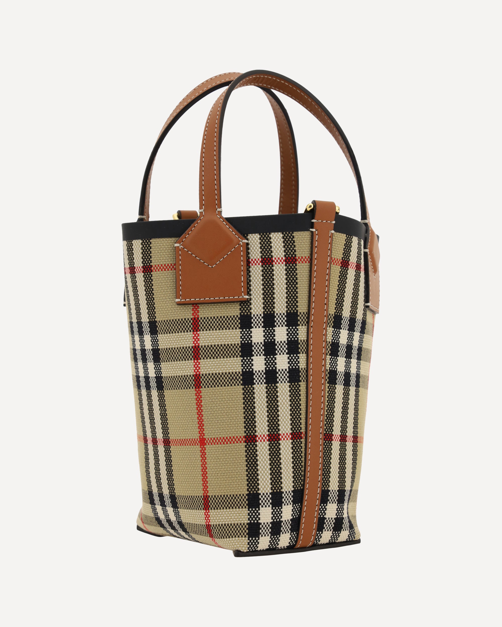 The London Bucket Bag by Burberry is an elegant and versatile accessory that combines the appeal of classic design with modern functionality. The double flat leather handles at the top offer a comfortable option to carry it by hand, while the slim removable leather strap adds versatility, allowing it to also be worn on the shoulder or crossbody. The design is characterised by the iconic Archivio Check pattern, which takes the brand's traditional check pattern and repeats it all-over, giving the bag a distinctive and sophisticated look. The internal slip pocket offers an additional practical detail, perfect for keeping small items organised.