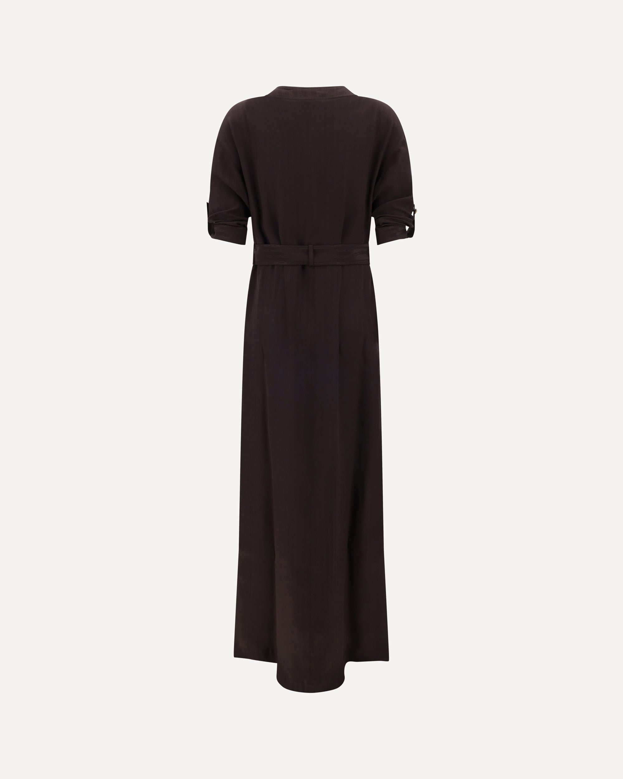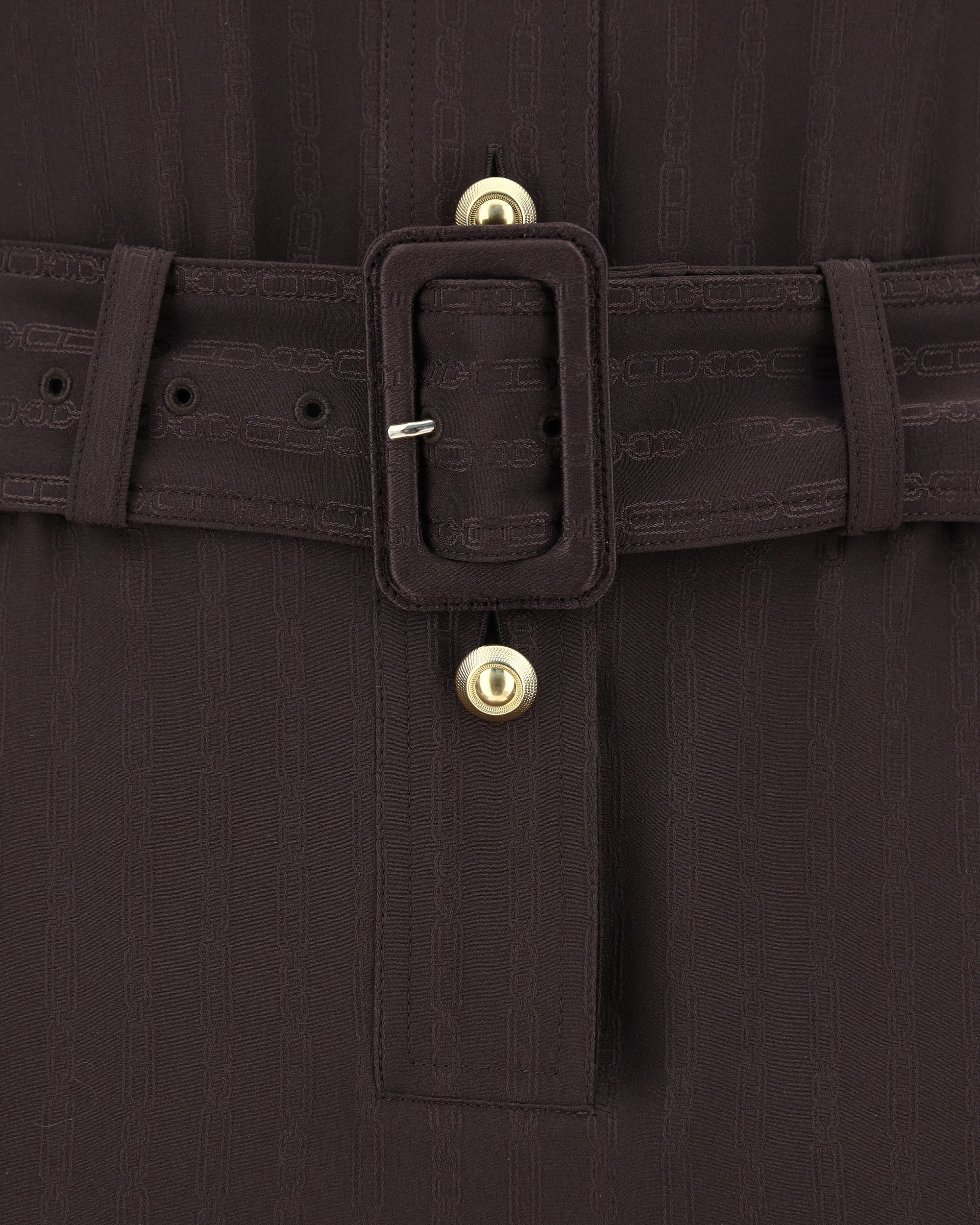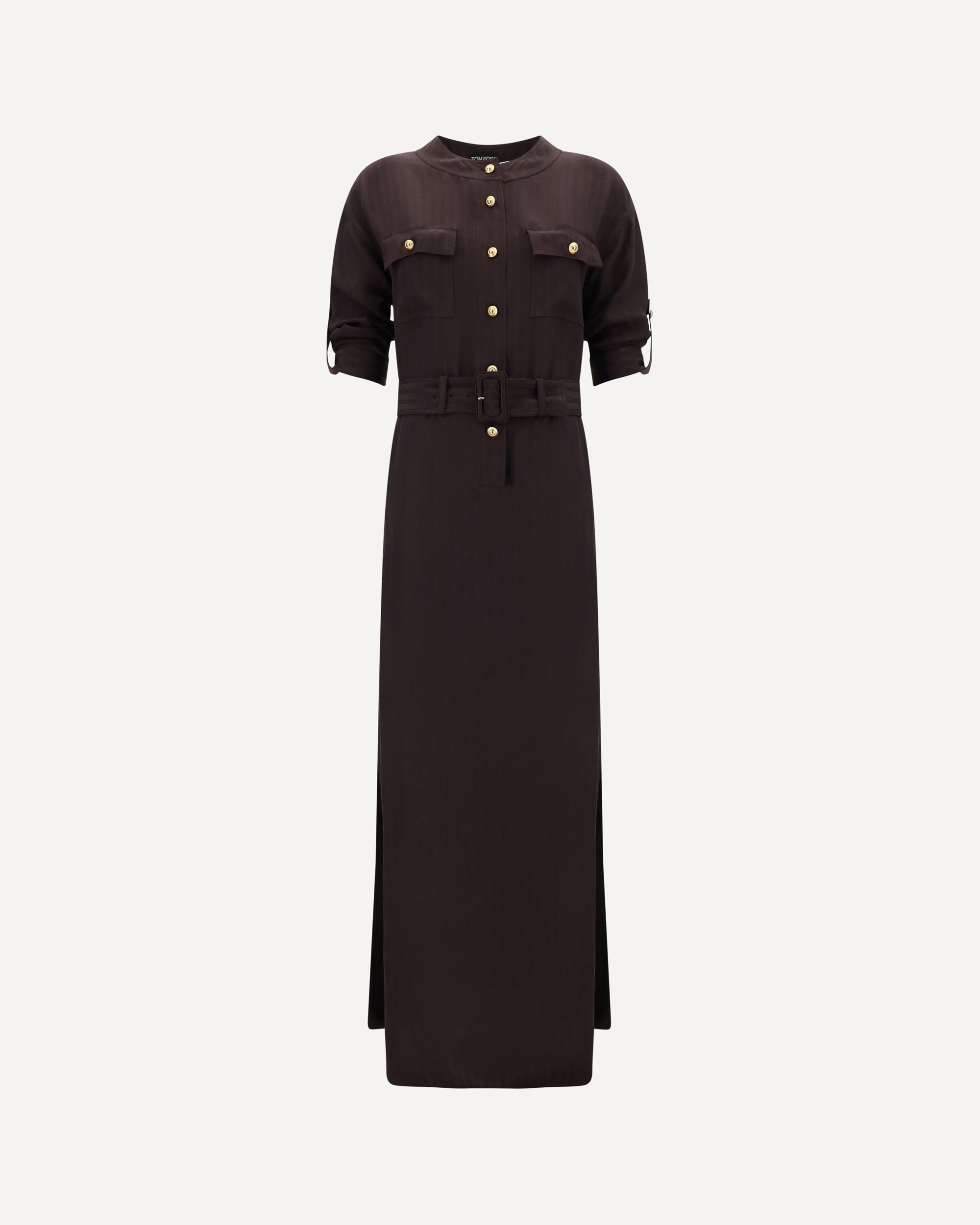 Tom Ford's Long chemisier Dress is a sophisticated and versatile piece featuring a sleek crew neck and a front button closure. The adjustable waistband via a removable belt allows you to customize the fit, while the button-adjustable long sleeves add a practical and stylish touch. The two front patch pockets with flaps and buttons, along with the two side welt pockets, offer functionality and refined details. An elegant back slit lends movement to the dress, which features an all-over repeating vertical pattern for a visually elongating effect.