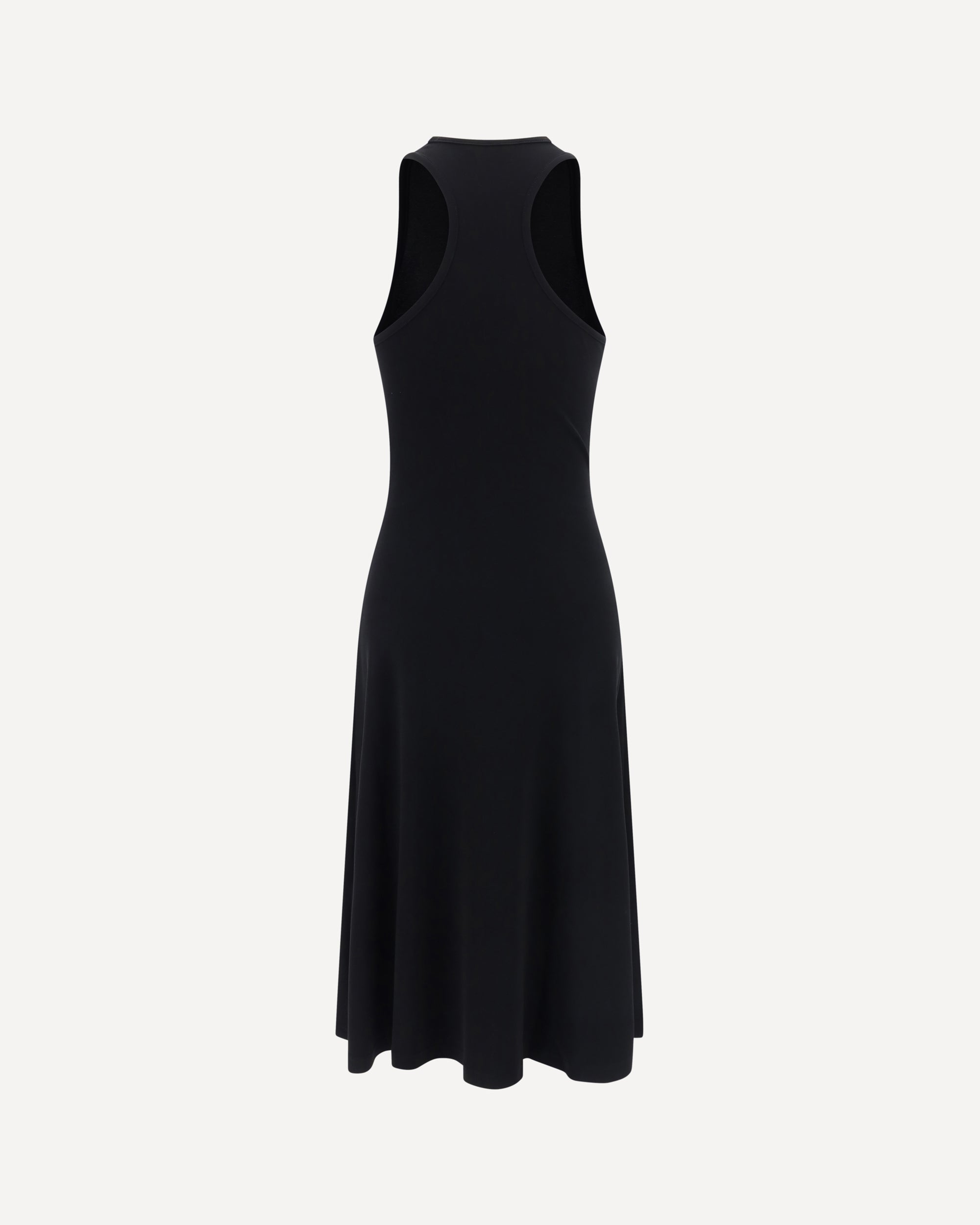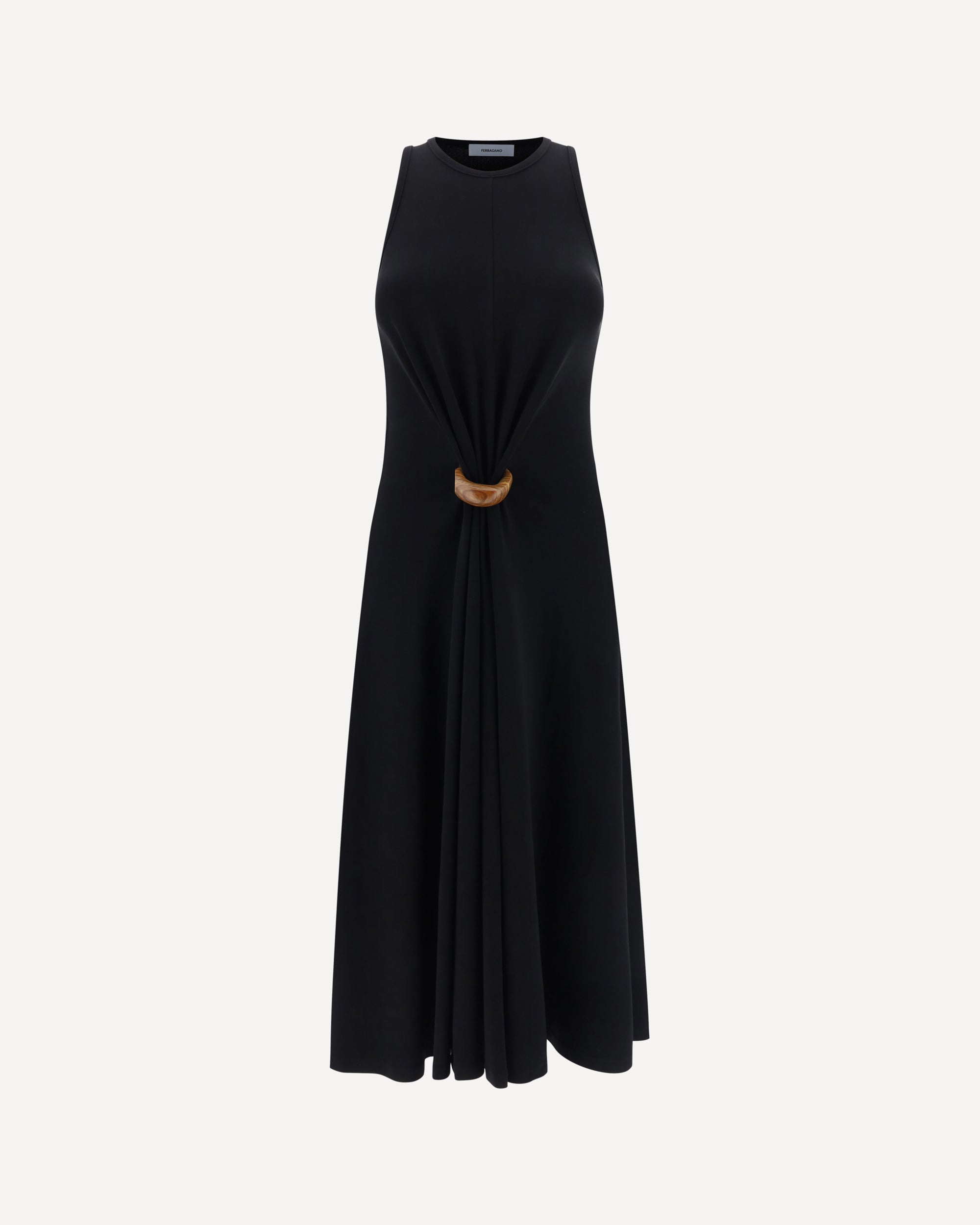 Long Dress by Ferragamo, sleeveless design, ruched detail on front panel via magnetic ring, monochrome pattern, slim fit.