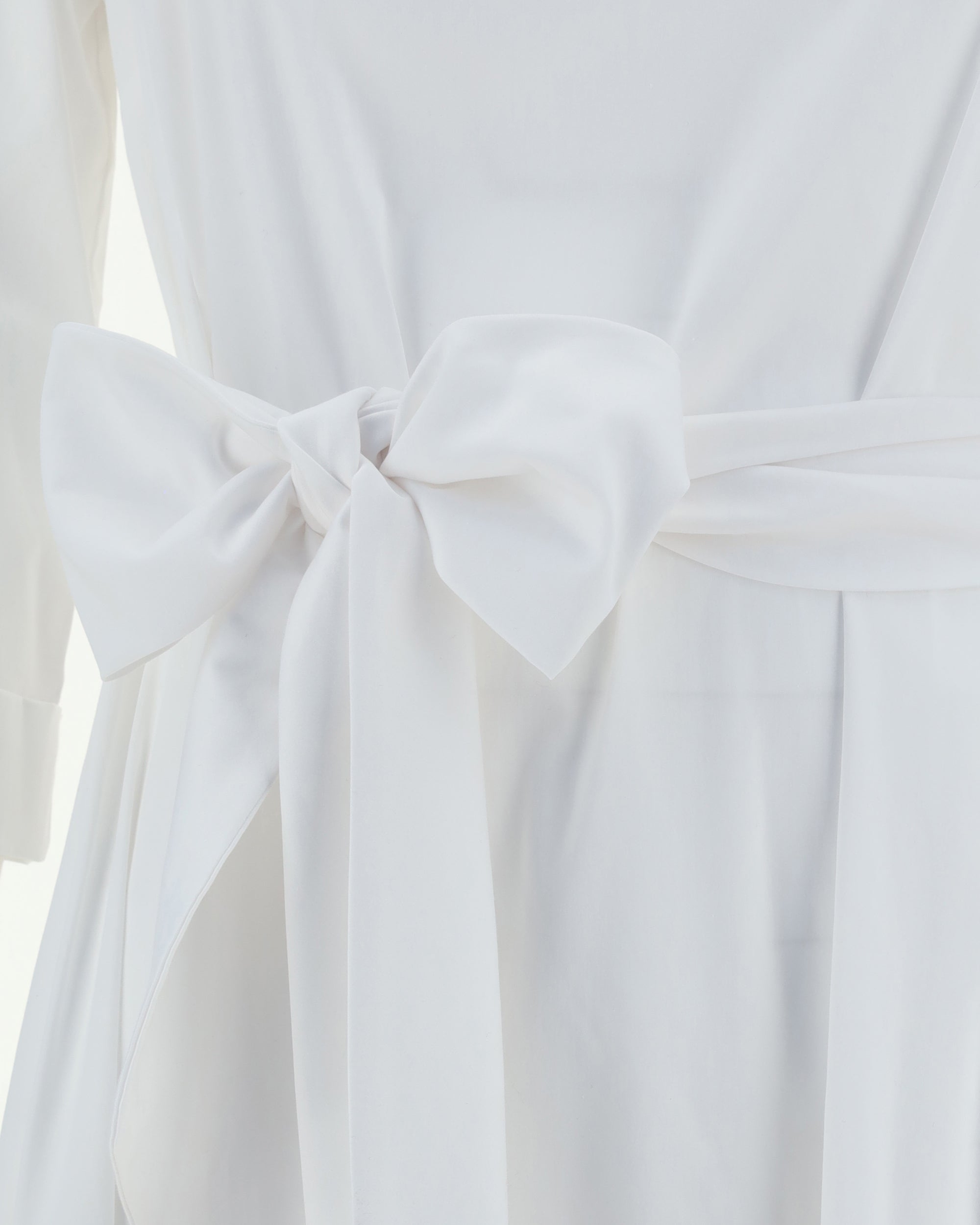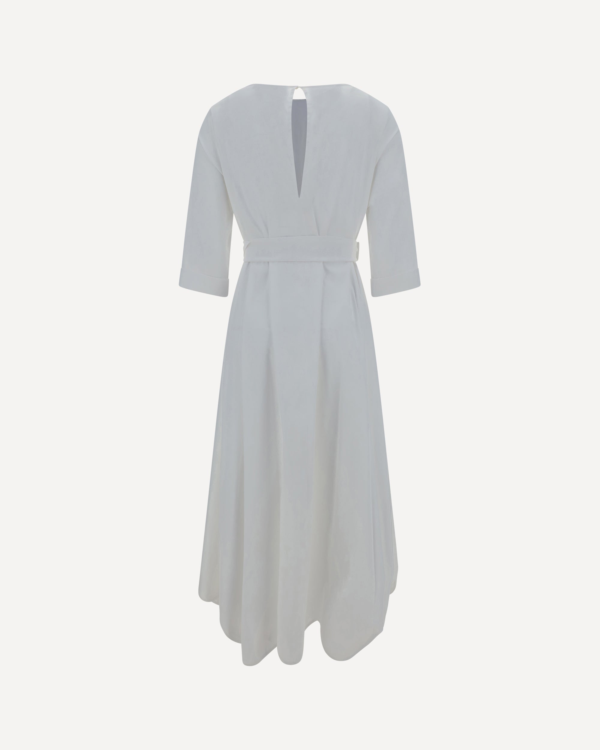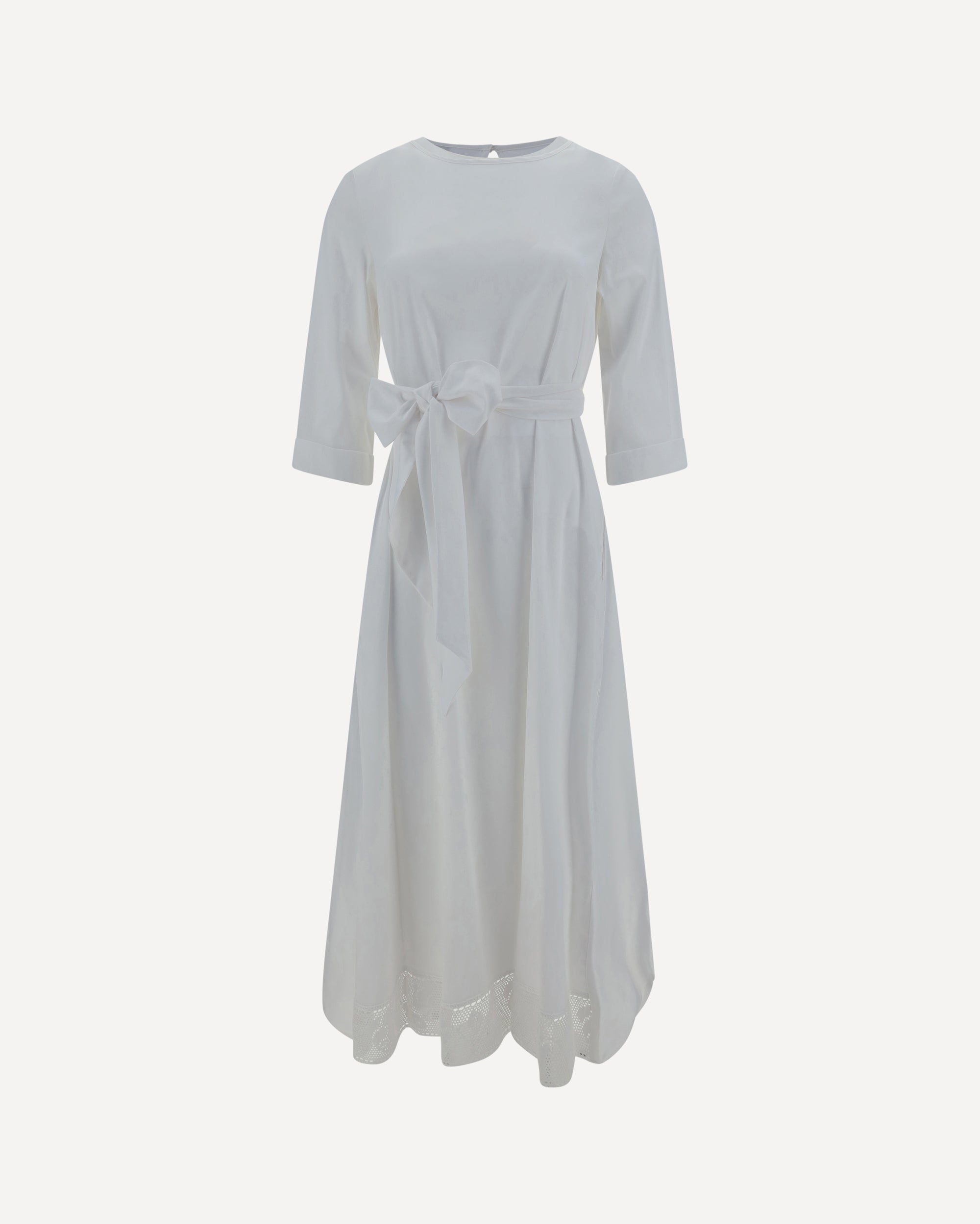 Ella's Cotton long Dress is a romantic and delicate piece, perfect for the warm weather. Featuring a boat neckline and three-quarter-length sleeves, it has a smock stitch at the waist that enhances the silhouette, complemented by a matching sash to tie in a wide bow at the front. The keyhole closure at the back adds a feminine detail, while the hem is embellished with fine matching lace embroidery. A dress with an ethereal and timeless style.