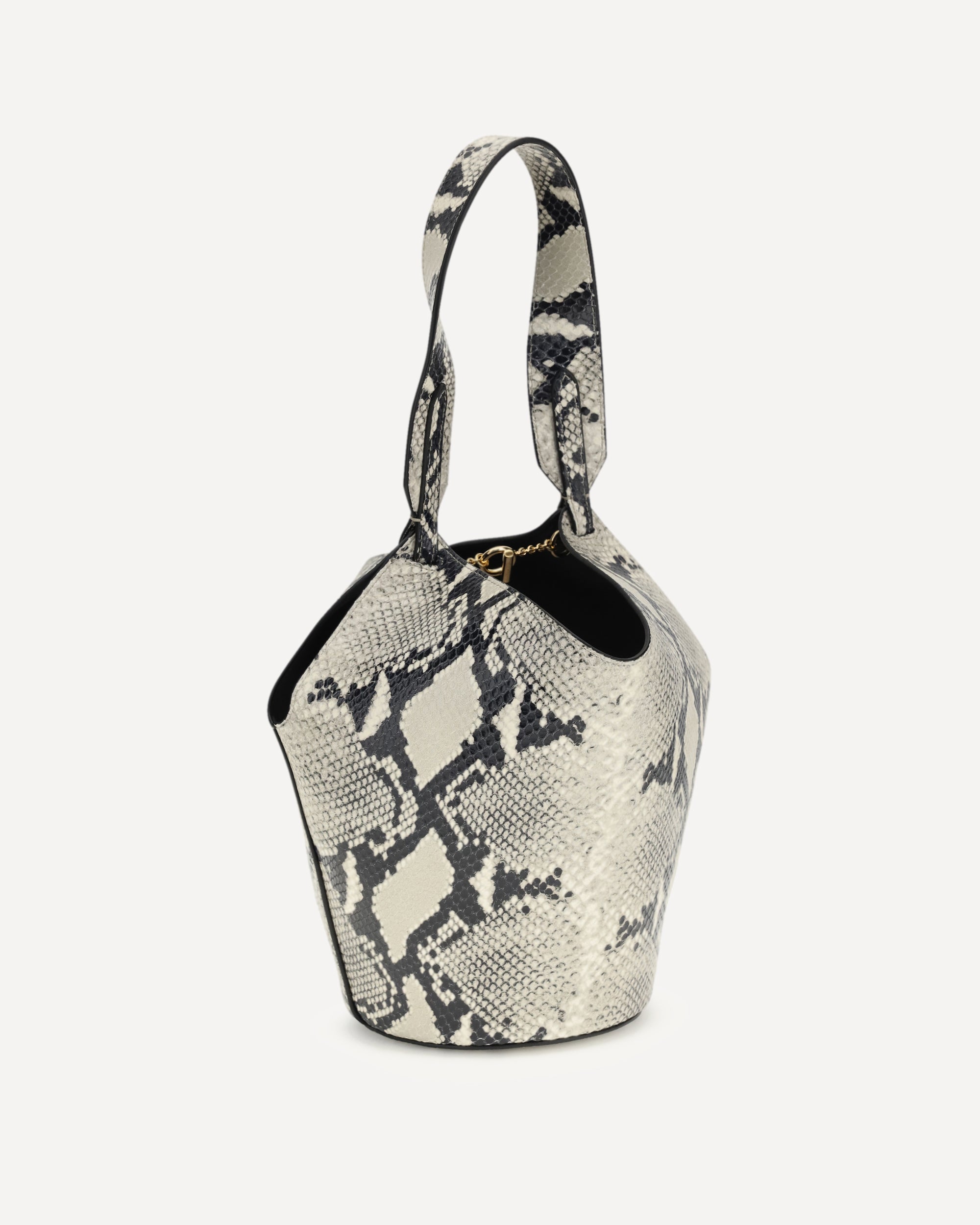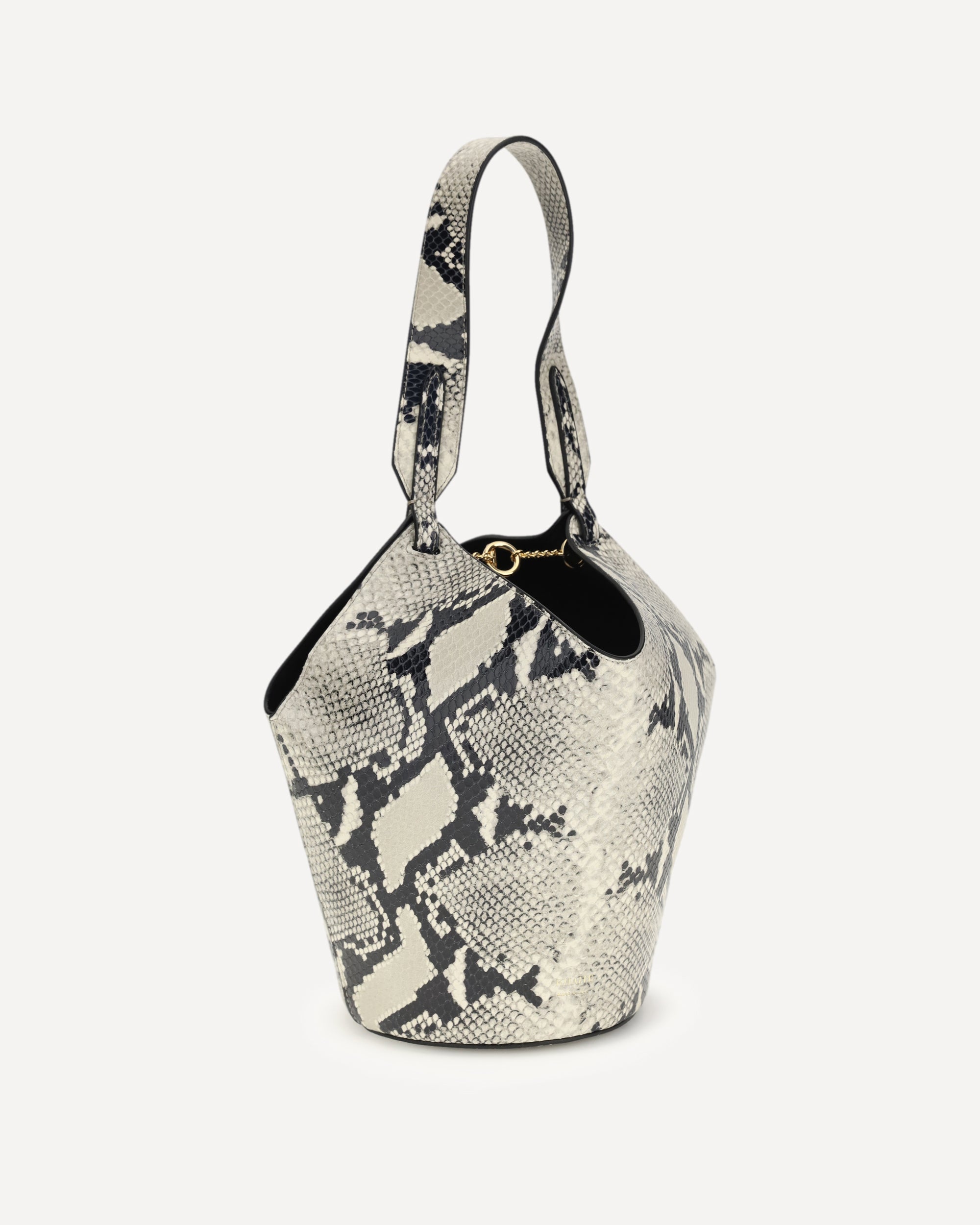 The mini Lotus Shoulder Bag by Khaite, inspired by a scarf, is crafted from python-embossed calfskin with multi-toned scales that enhance its elegance. Lightweight and compact, it retains the original's petite yet elongated proportions and rounded base. The internal gold-tone chain closure and soft nappa lining complete the design, making it both refined and practical.