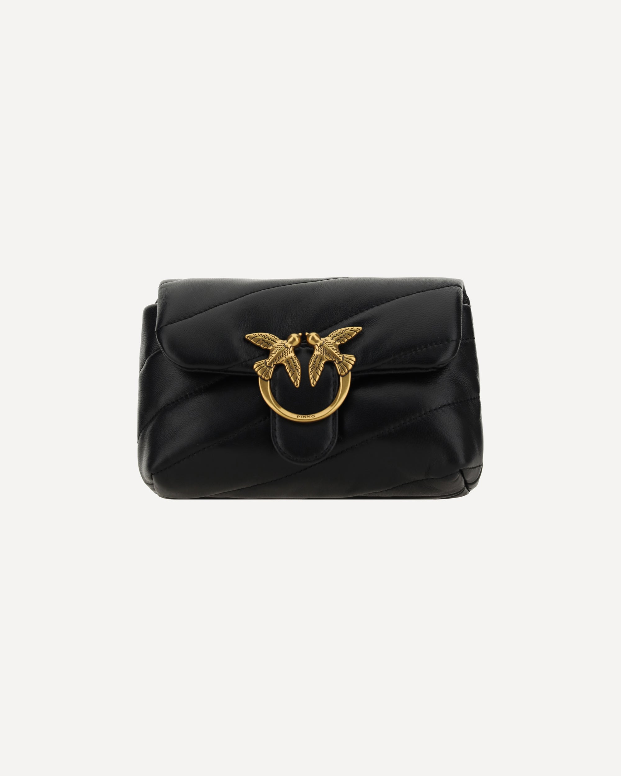 The Calfskin Love Baby Shoulder Bag by Pinko, front closure with magnetic button, iconic gold-plated Love Birds logo embossed on the front, quilted and padded design, double internal compartment, sliding chain shoulder strap, iconic brand monogram embroidered tone-on-tone on the back.
