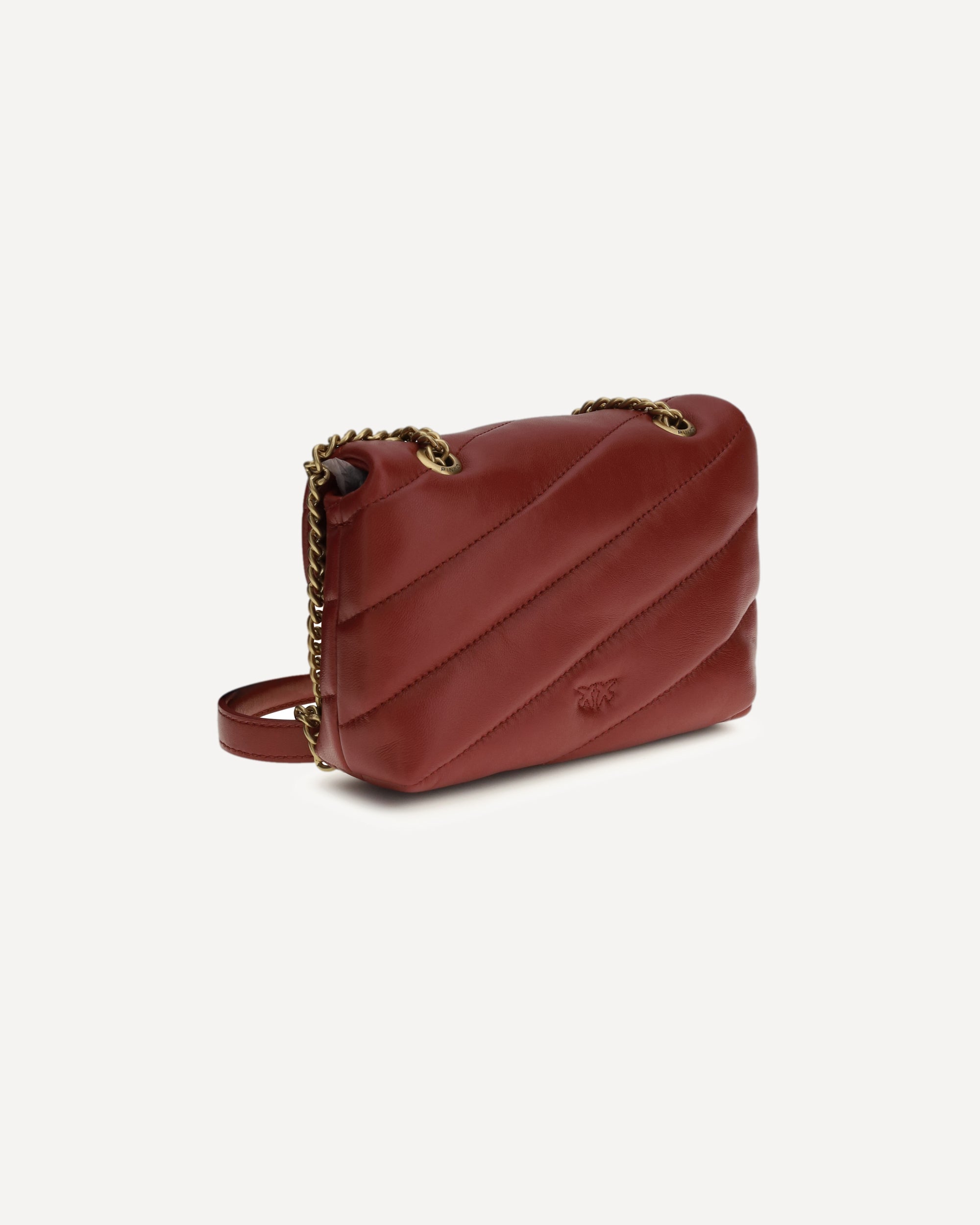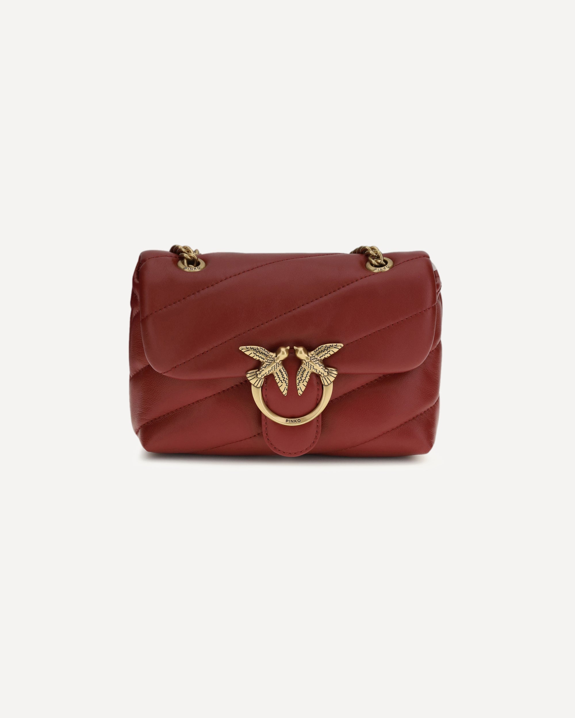 The Calfskin Love Baby Shoulder Bag by Pinko, front closure with magnetic button, iconic gold-plated Love Birds logo embossed on the front, quilted and padded design, double internal compartment, sliding chain shoulder strap, iconic brand monogram embroidered tone-on-tone on the back.