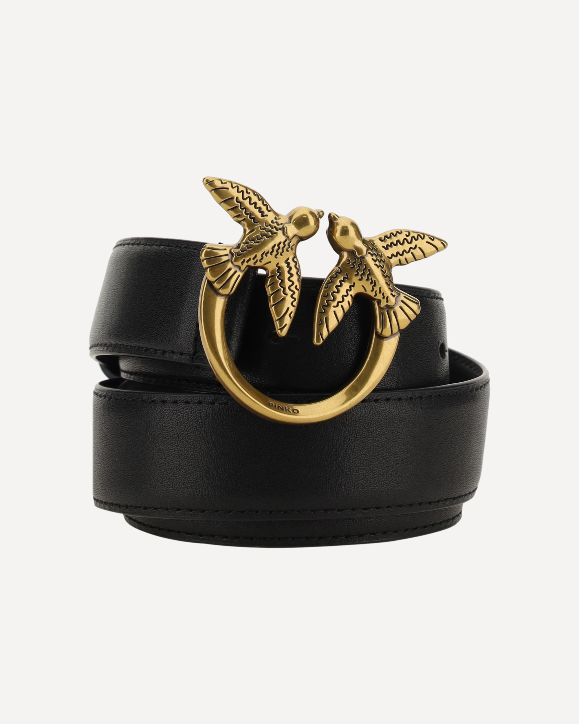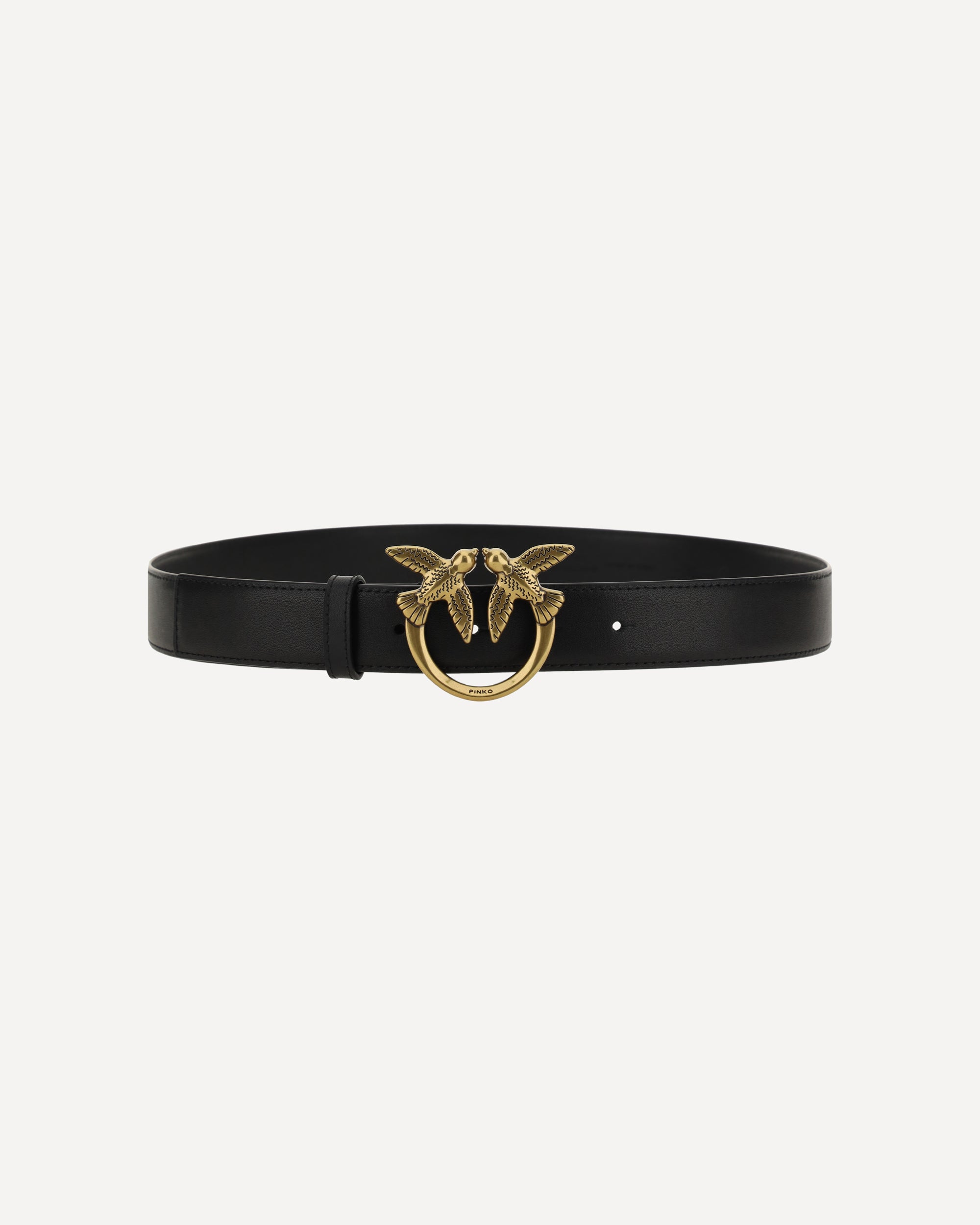 Calfskin Love Berry Belt by Pinko, smooth leather design, round buckle with iconic Love Birds logo plaque. Thickness: 3 cm.