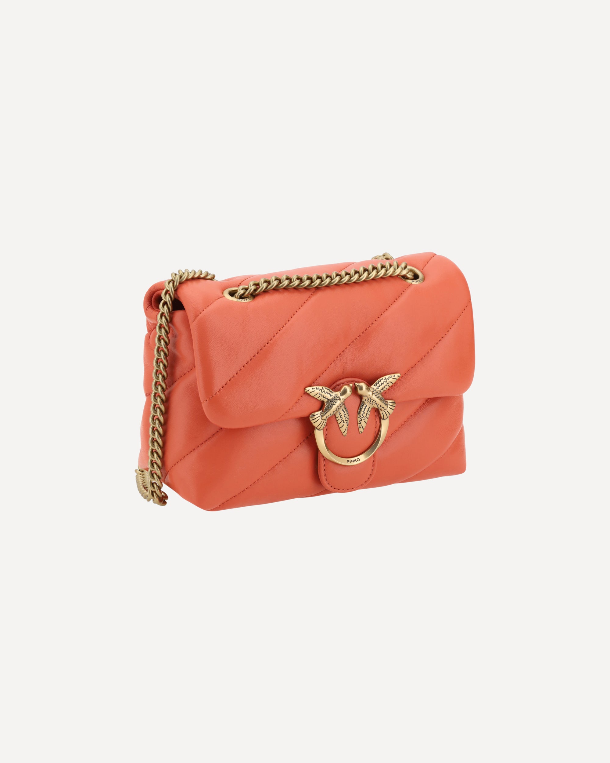 The Love Mini Puff leather Shoulder Bag by Pinko is a stylish and fashionable accessory. The front closure with magnetic button ensures practicality and security, while the iconic Love Birds logo, gold-plated and embossed on the front, adds a touch of luxury. The quilted and padded design gives the bag a rich and sophisticated texture. Inside, there is single interior compartment for excellent organization. The sliding chain strap offers versatility, allowing it to be worn on the shoulder or crossbody. On the back, the brand's iconic tone-on-tone embroidered monogram adds a discreet and refined detail.