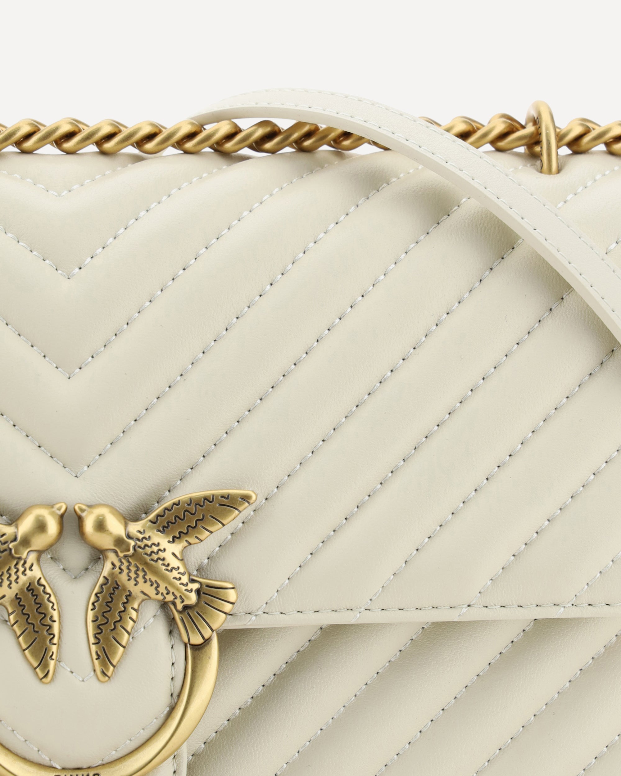 The Love One Classic Leather Shoulder Bag by Pinko is a true symbol of elegance and versatility. The front magnetic button closure ensures ease of use and security, while the iconic gold-plated Love Birds logo, embossed on the front, is a distinctive mark of luxury. The quilted and padded design gives a sophisticated texture, making the bag not only beautiful, but also pleasant to the touch. With the double internal compartment, this bag offers functionality, allowing you to organize objects in a practical and orderly way. The sliding chain shoulder strap allows you to wear it comfortably, while the flat leather shoulder strap, adjustable and removable, offers the possibility of personalising the look according to your preferences. The tone-on-tone embroidered brand monogram on the back adds an additional exclusive detail.