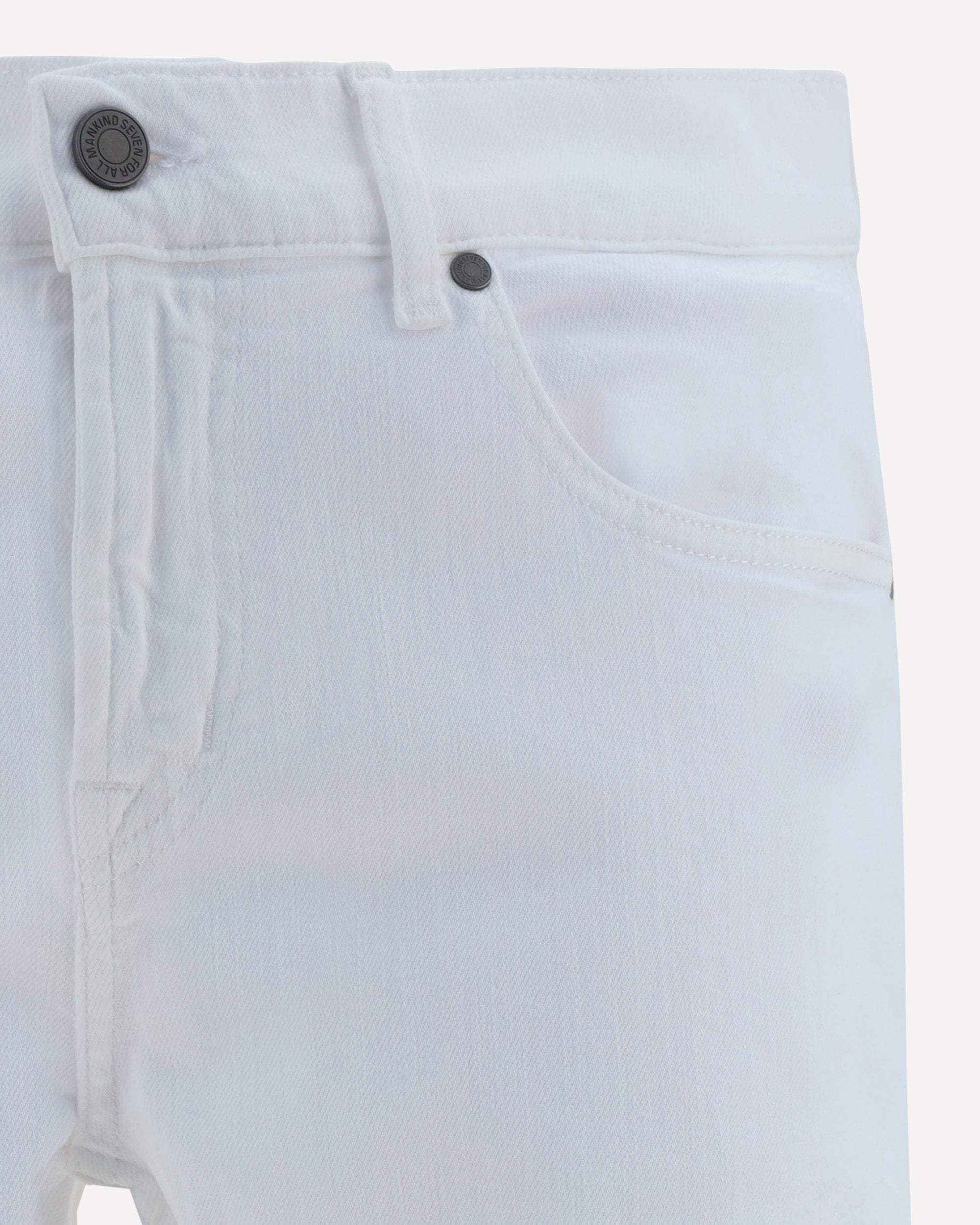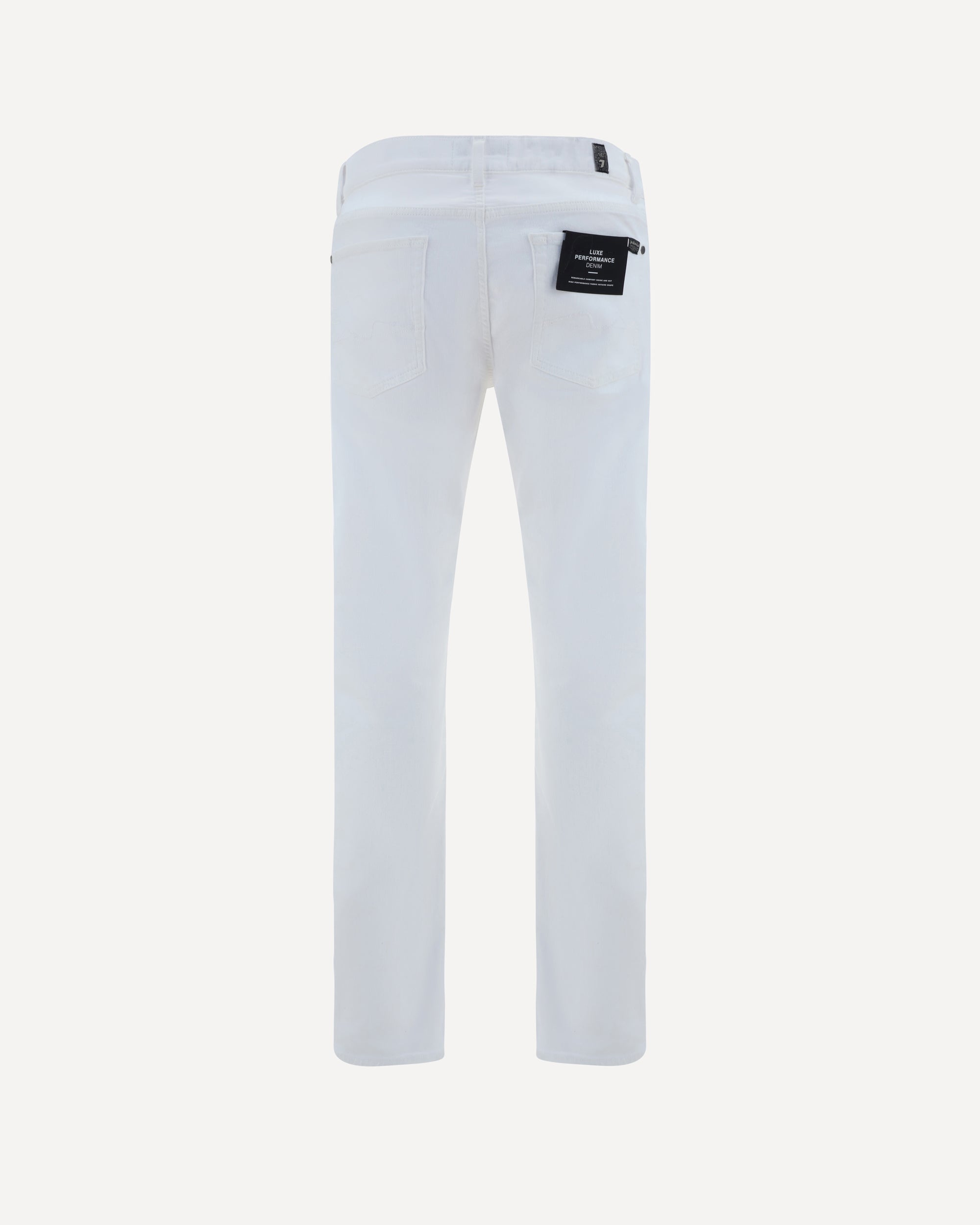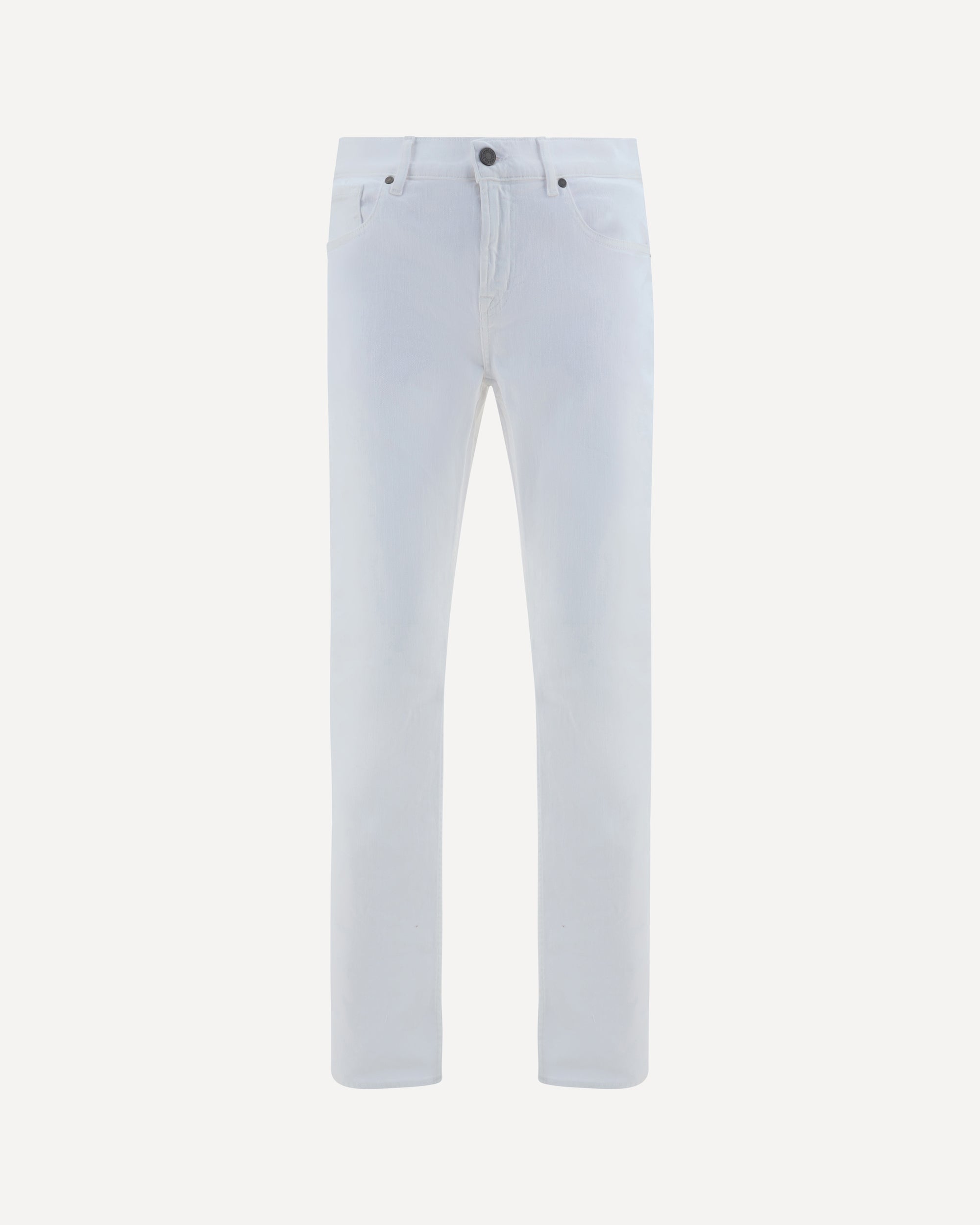 Cotton Luxe Pants by 7For, five-pocket straight style, front button and zipper closure, belt loops for waistband, iconic fabric patch with signature brand pressure-printed applique on back.