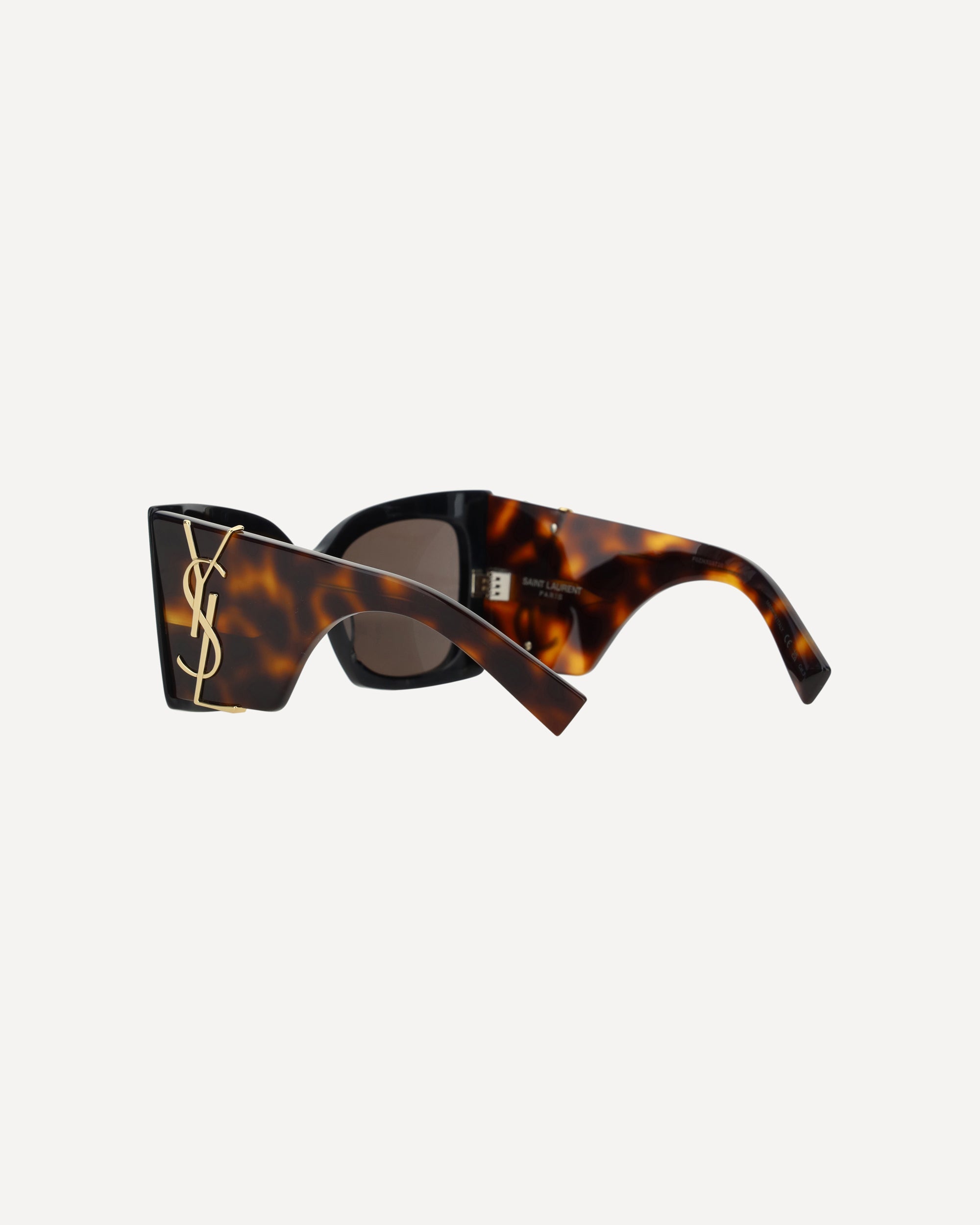 Saint Laurent's M119 Sunglasses are the epitome of bold elegance. With an oversized square design, they feature a maxi plaque with the iconic three-dimensional gold-plated YSL logo applied to the side panels, adding a touch of luxury. Straight temples, paired with a curved tip, complete the look, giving the glasses a sophisticated and modern edge.