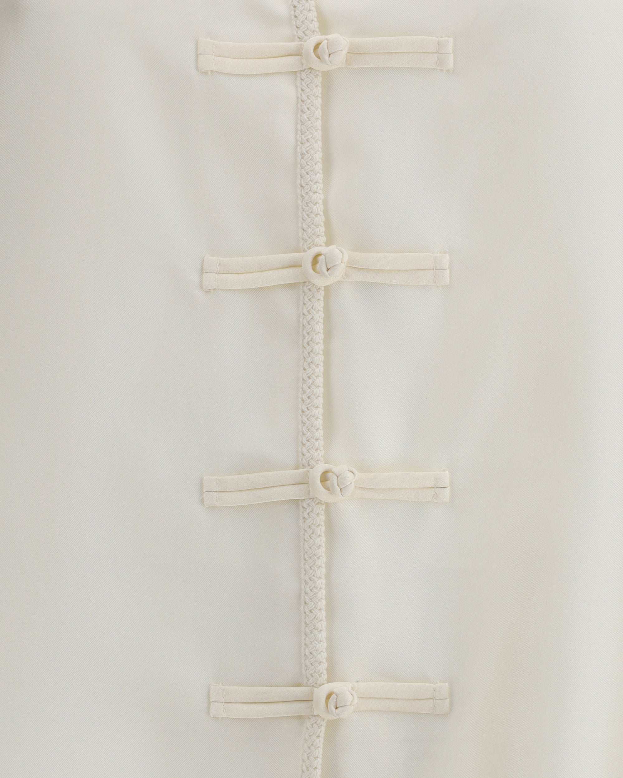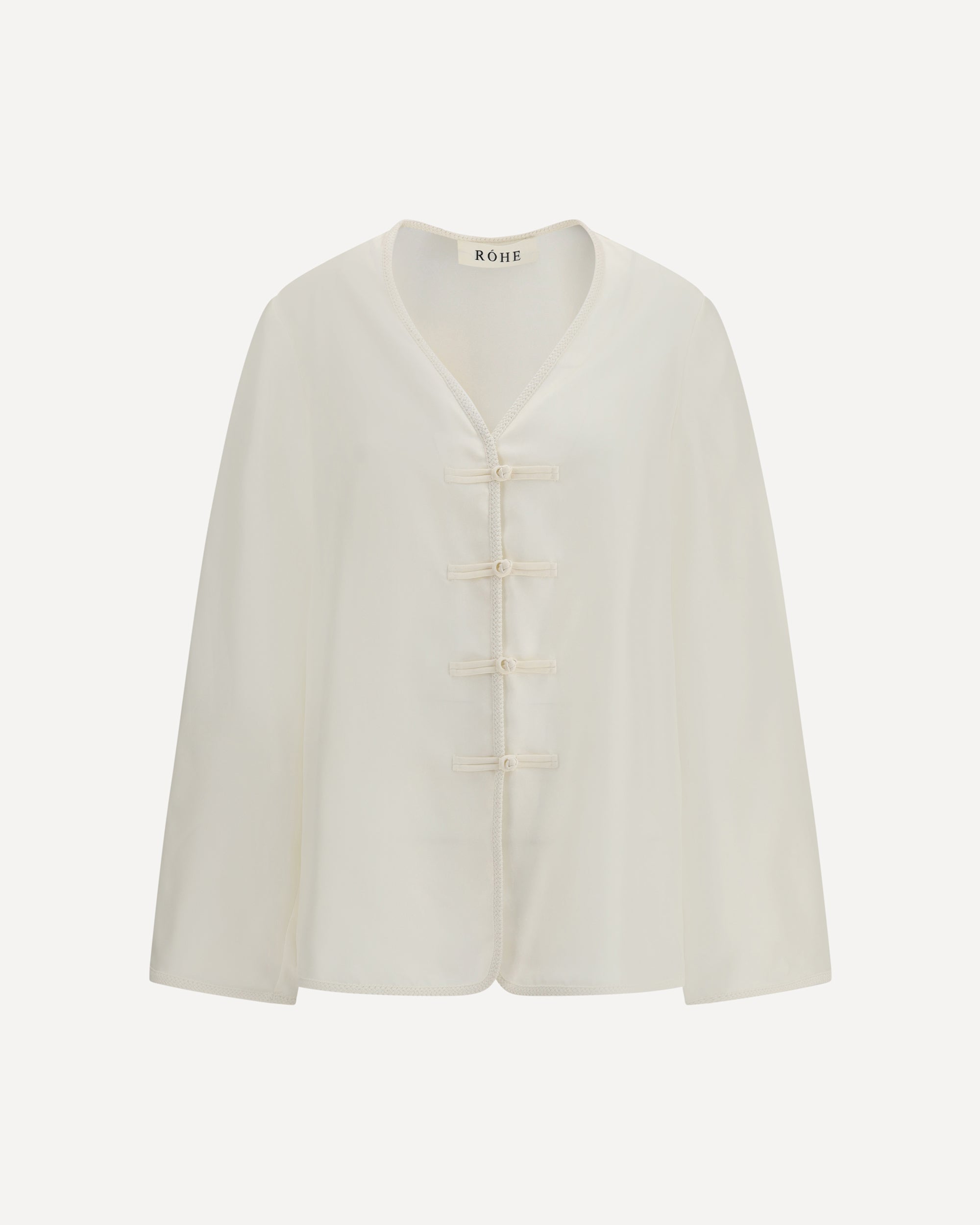 Rohe's Mandarin Silk Shirt by Rohe is an elegant garment with exotic appeal. The V-neckline enhances the neckline, while the front closure with Chinese buttons adds a distinctive and refined detail. Made of silk, this shirt offers a light and soft feel against the skin, with a design that combines Eastern tradition with modern style. Perfect for those seeking a sophisticated and unique look that plays with high-class details.